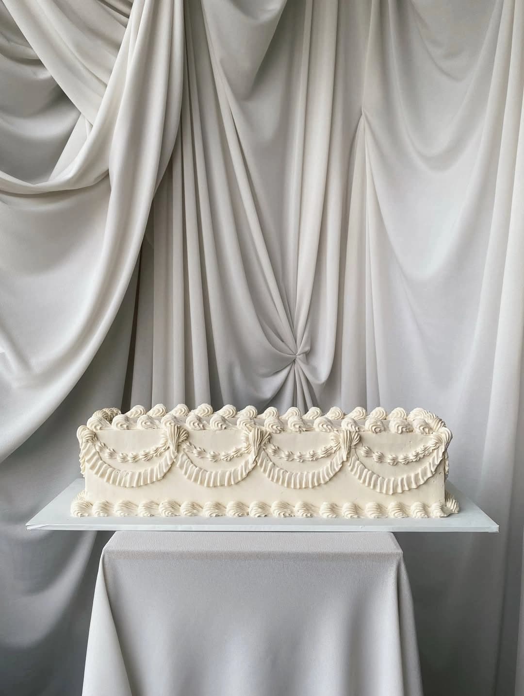 "A rectangular cake doesn't compete with its decoration — it holds it, frames it, lets the work breathe."