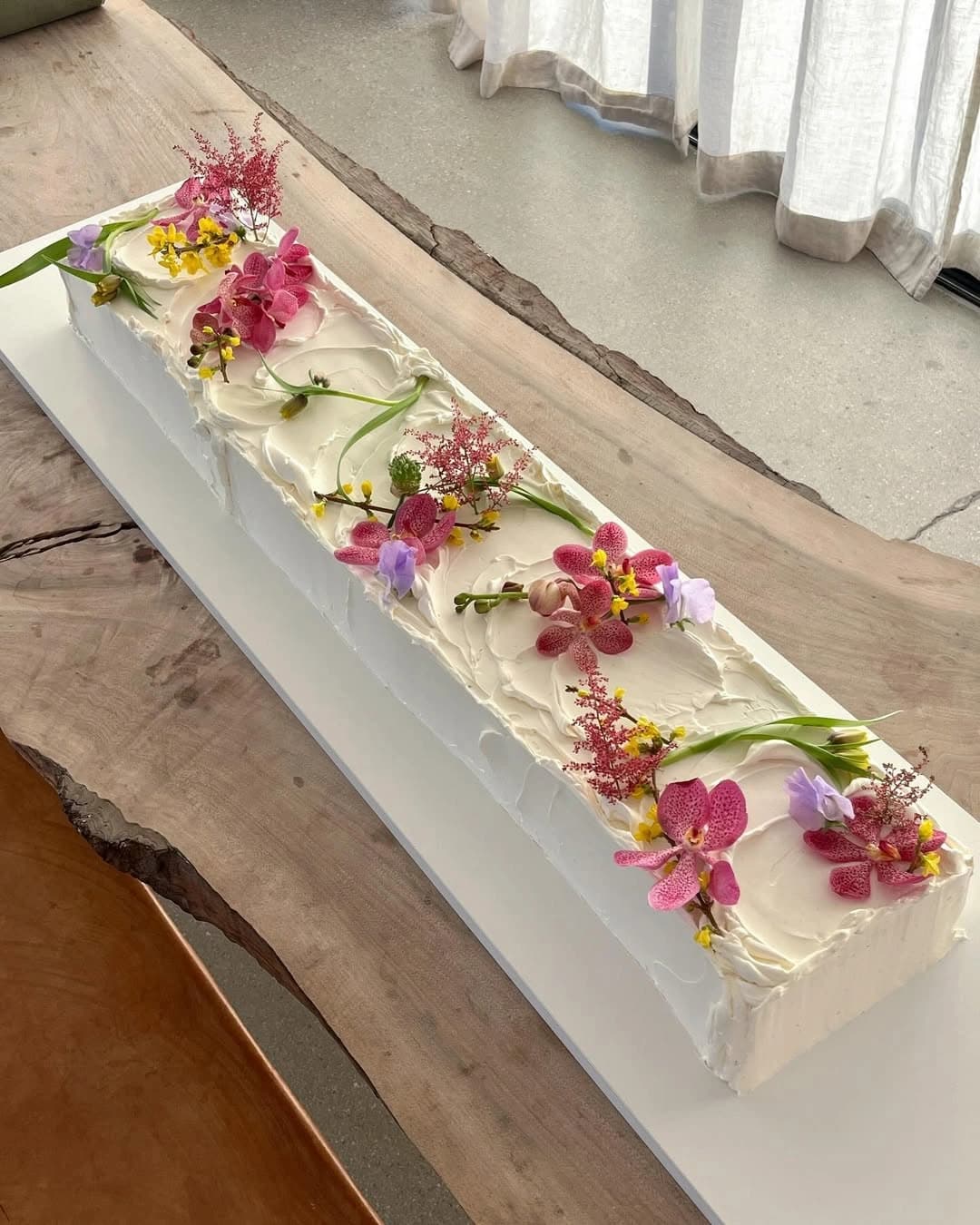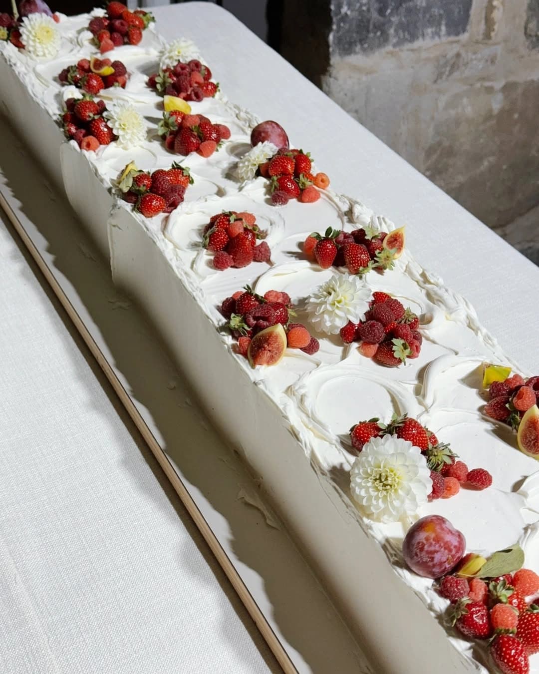 Where a round cake demands symmetry and a tiered cake commands verticality, the long horizontal form of a slab invites something more painterly. Baroque sugar work cascades across the surface in uninterrupted sweeps. Fresh blooms — ranunculus, hydrangea, spray roses — can be arranged in deliberate, asymmetric abundance, spilling from one end like a garden in mid-exhale. Freeze-dried raspberries and whole cherries scatter across snowy white frosting with the studied nonchalance of a still life. The format rewards ambition. It does not ask you to work in the round.