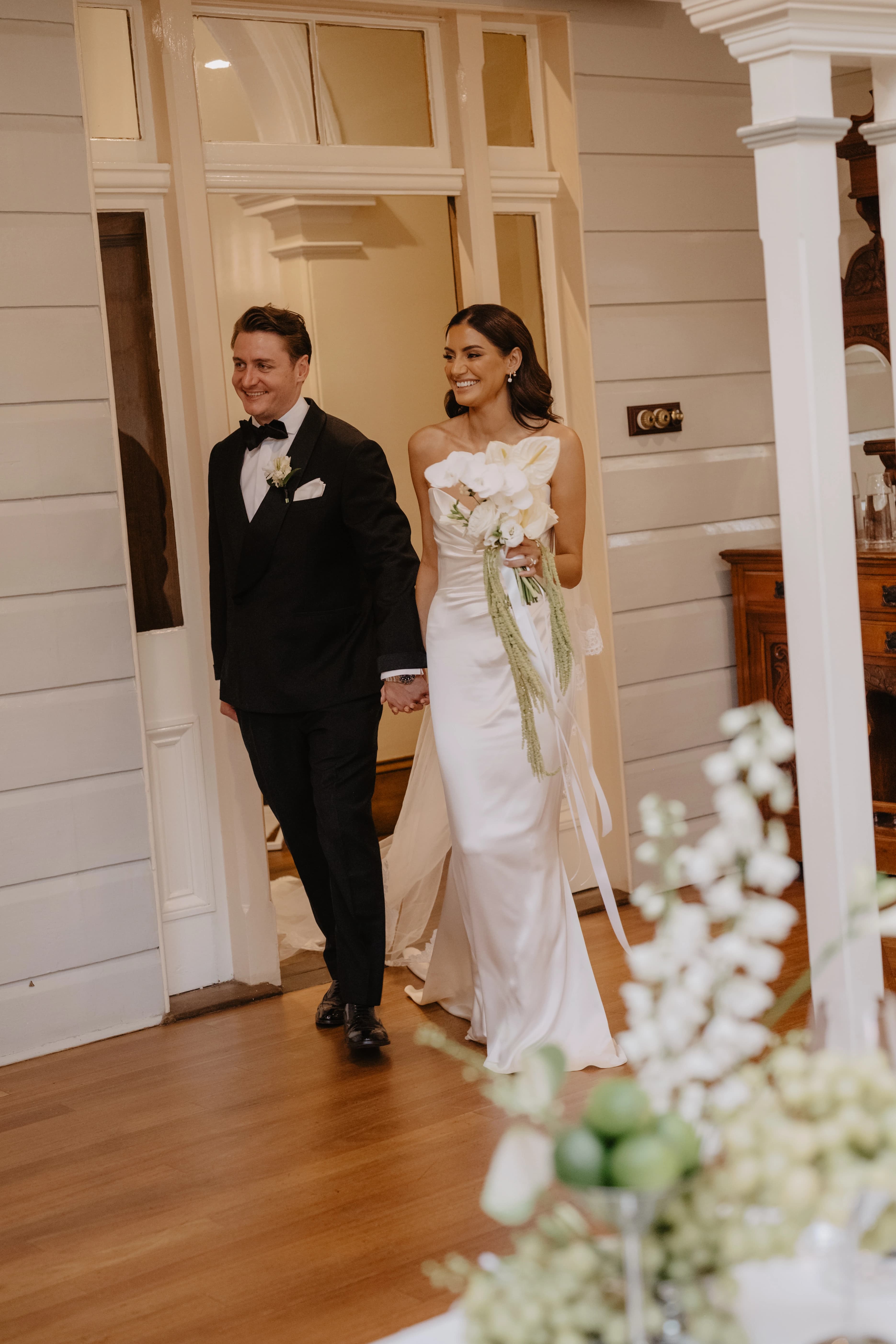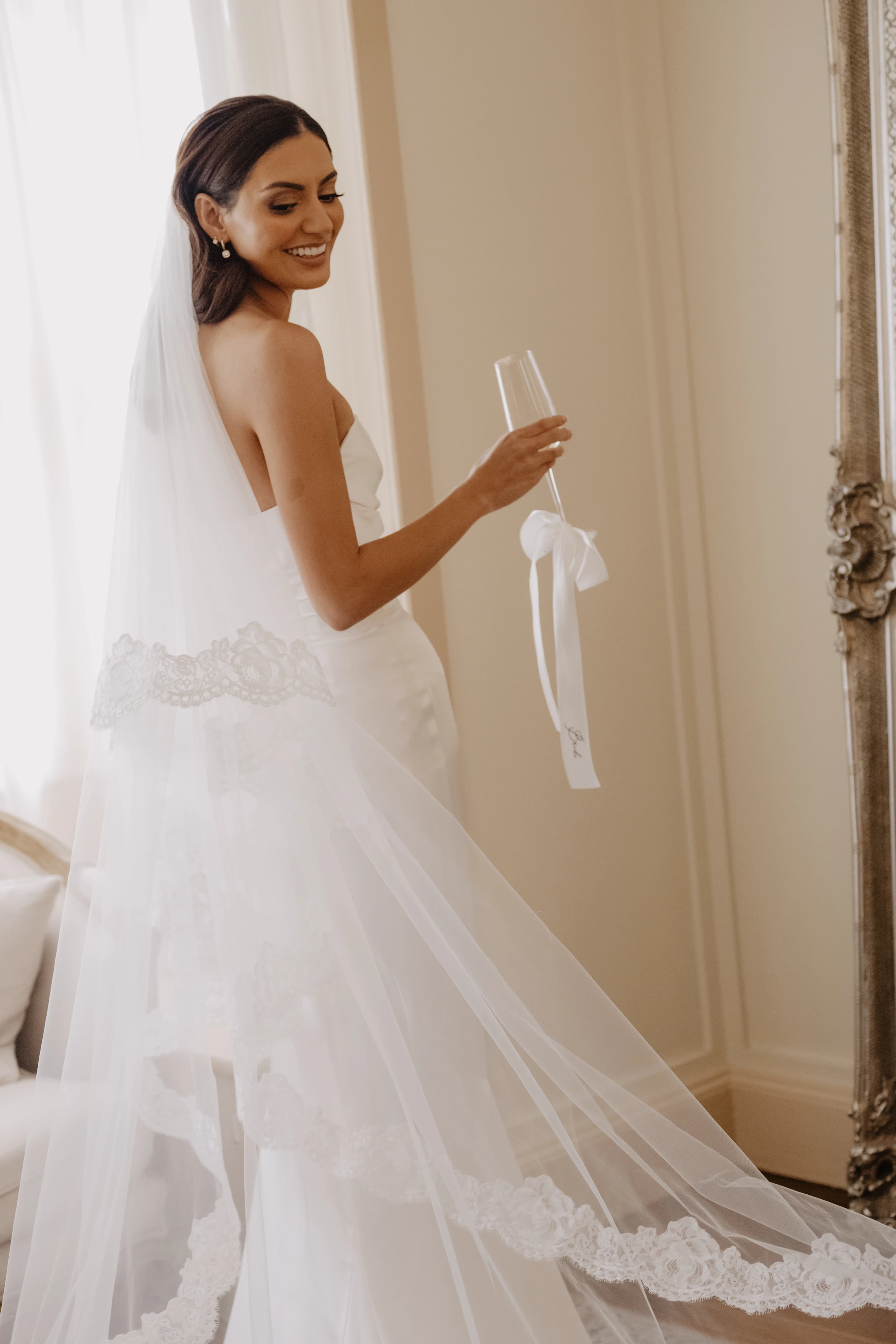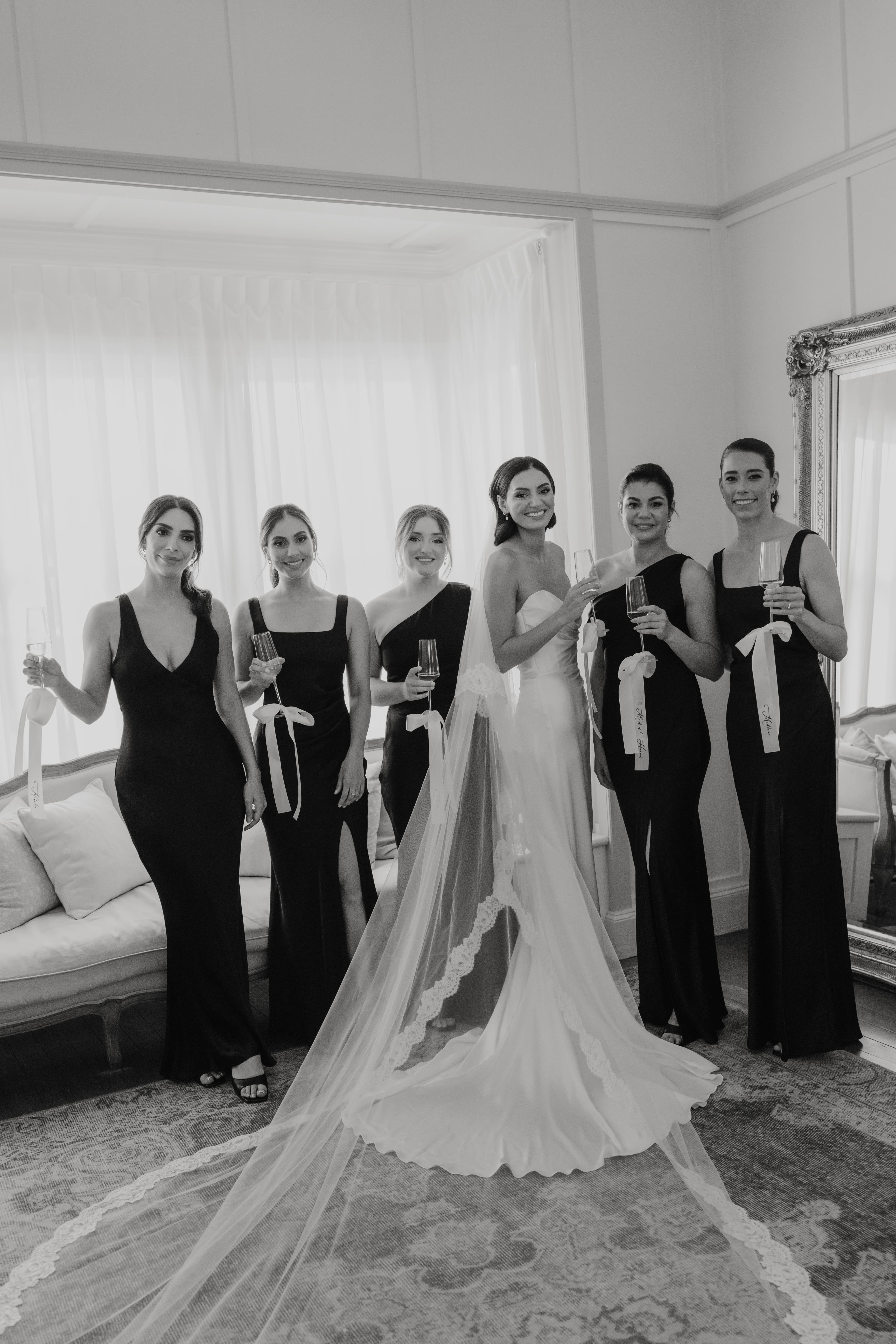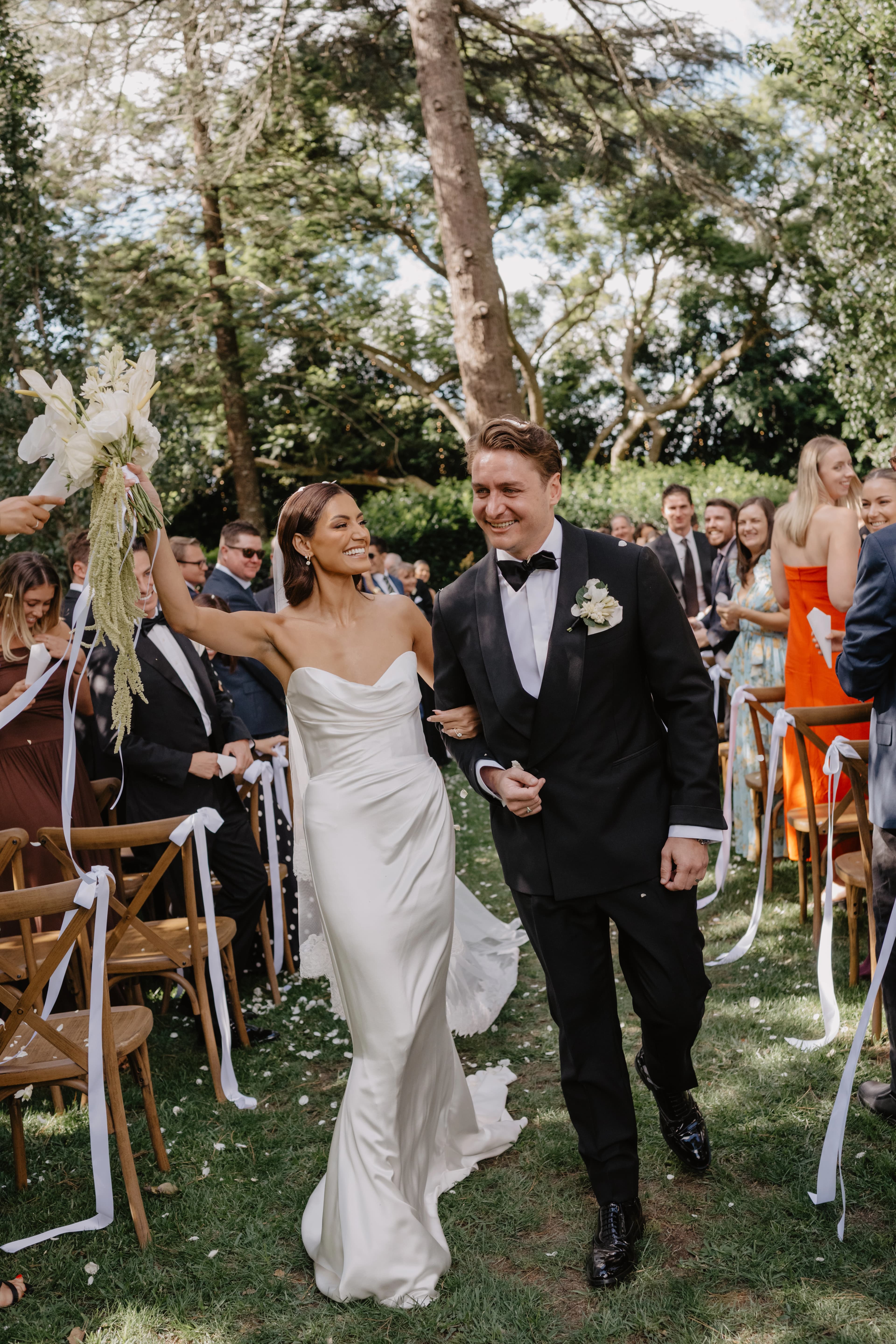 She entered with her father, her satin gown moving in liquid lines, veil edged in lace like fine engraving against air. The cedar stood before them as a sentinel, its branches folding into silence while orchids, garden roses and hydrangea gathered with greenery at its base — not as decoration but as offering, as though the garden itself leaned in to witness. White ribbons traced the aisle like streams of light, guiding guests into stillness as vows rose softly into the afternoon air. At the reception, the sense of intention carried through — pears nestled among florals, glassware tied with black ribbons etched in playful symbols and menus adorned with hand-drawn detail. Each table felt both refined and alive, blending elegance with personality. As candlelight gathered the evening close, the celebration seemed to distil into presence — luminous, grounded and enduring.