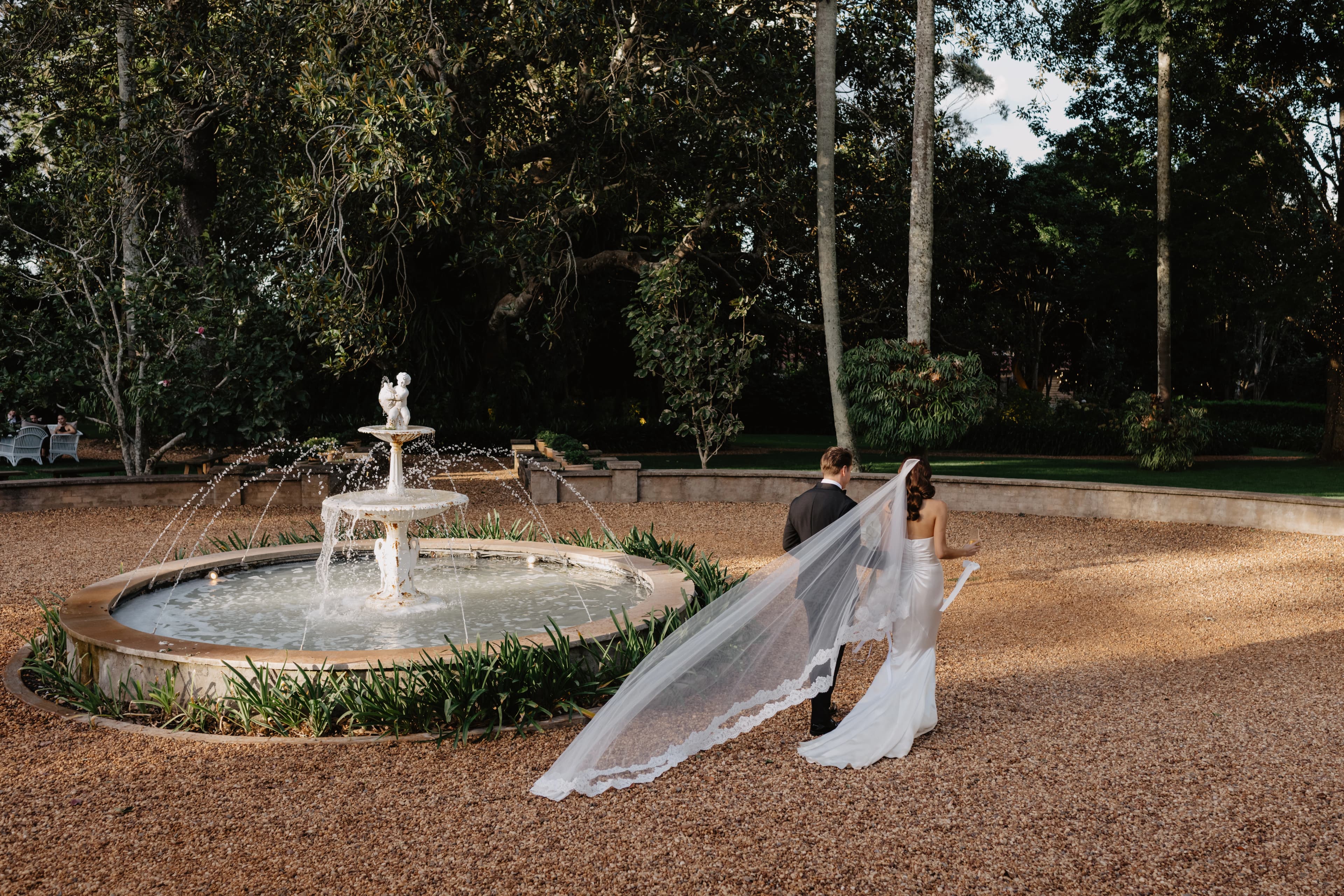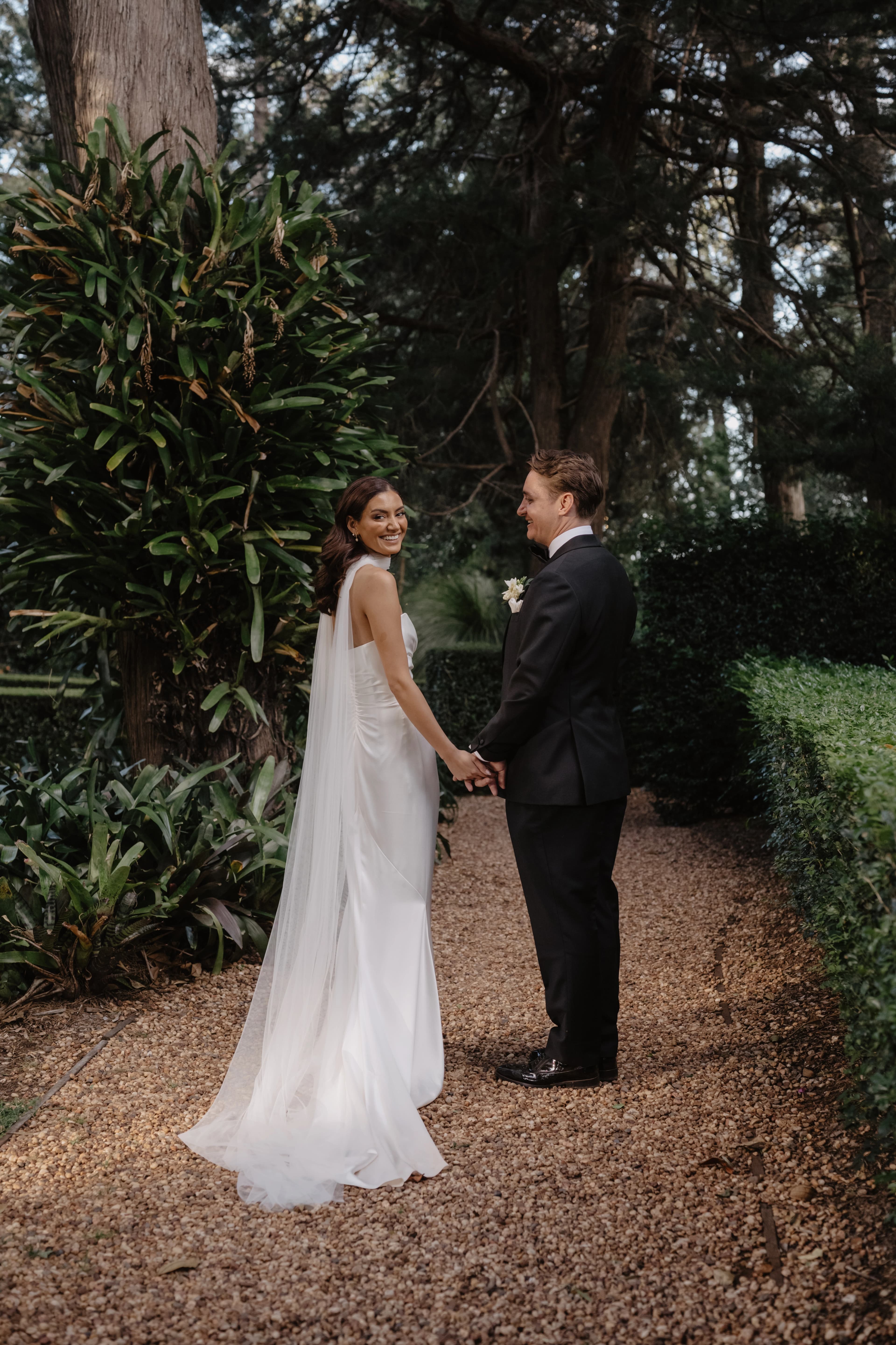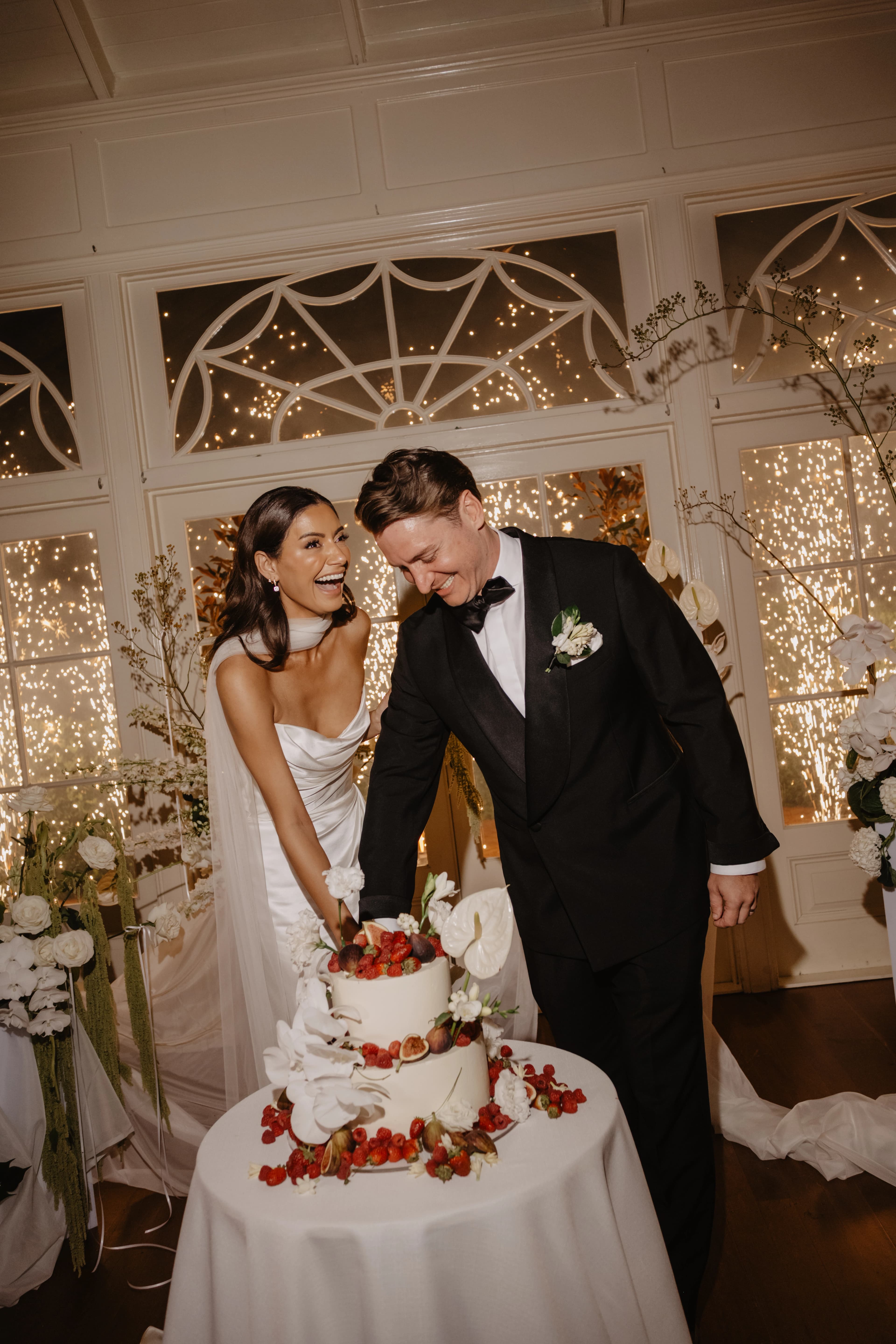 She entered with her father, her satin gown moving in liquid lines, veil edged in lace like fine engraving against air. The cedar stood before them as a sentinel, its branches folding into silence while orchids, garden roses and hydrangea gathered with greenery at its base — not as decoration but as offering, as though the garden itself leaned in to witness. White ribbons traced the aisle like streams of light, guiding guests into stillness as vows rose softly into the afternoon air. At the reception, the sense of intention carried through — pears nestled among florals, glassware tied with black ribbons etched in playful symbols and menus adorned with hand-drawn detail. Each table felt both refined and alive, blending elegance with personality. As candlelight gathered the evening close, the celebration seemed to distil into presence — luminous, grounded and enduring.