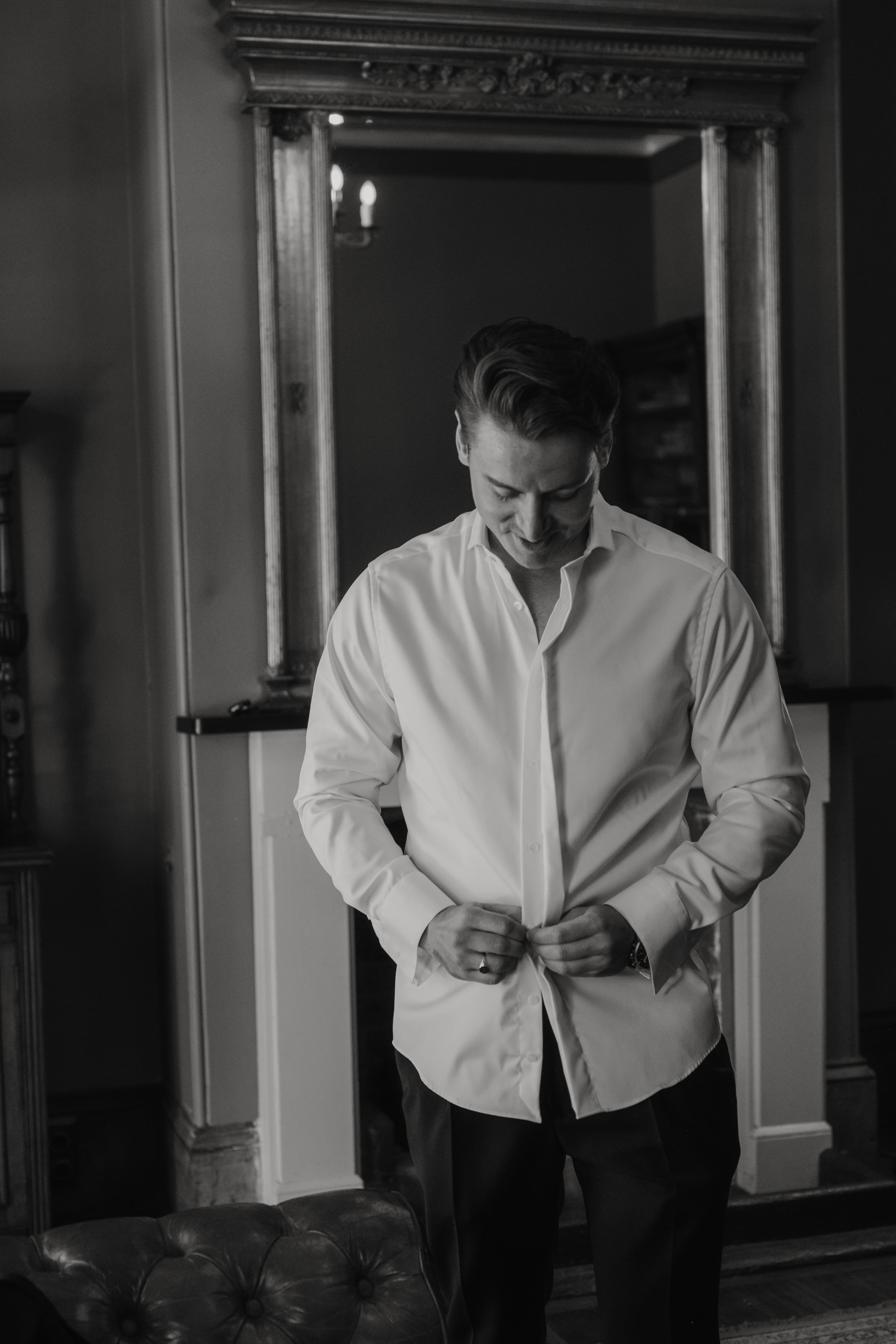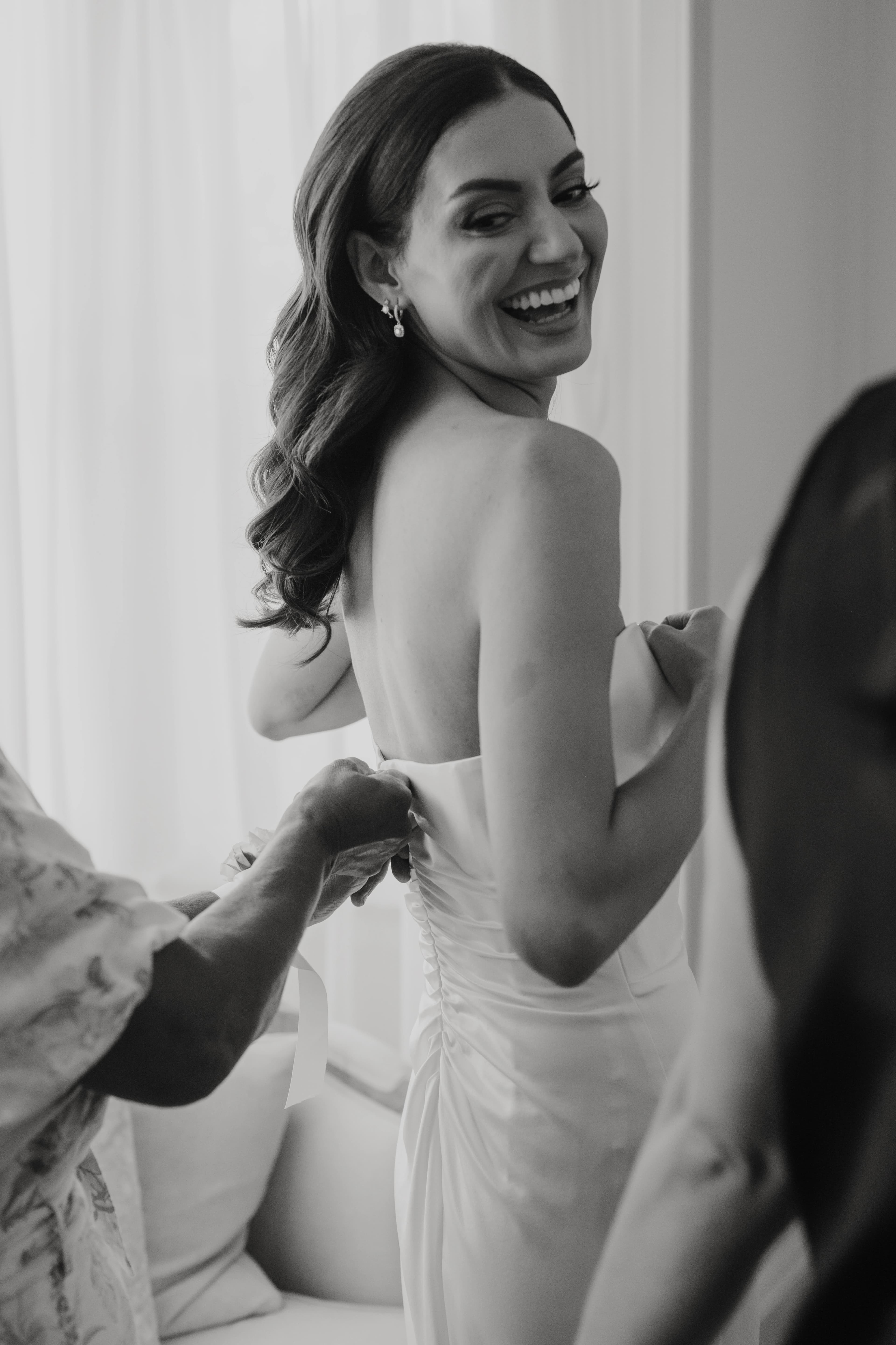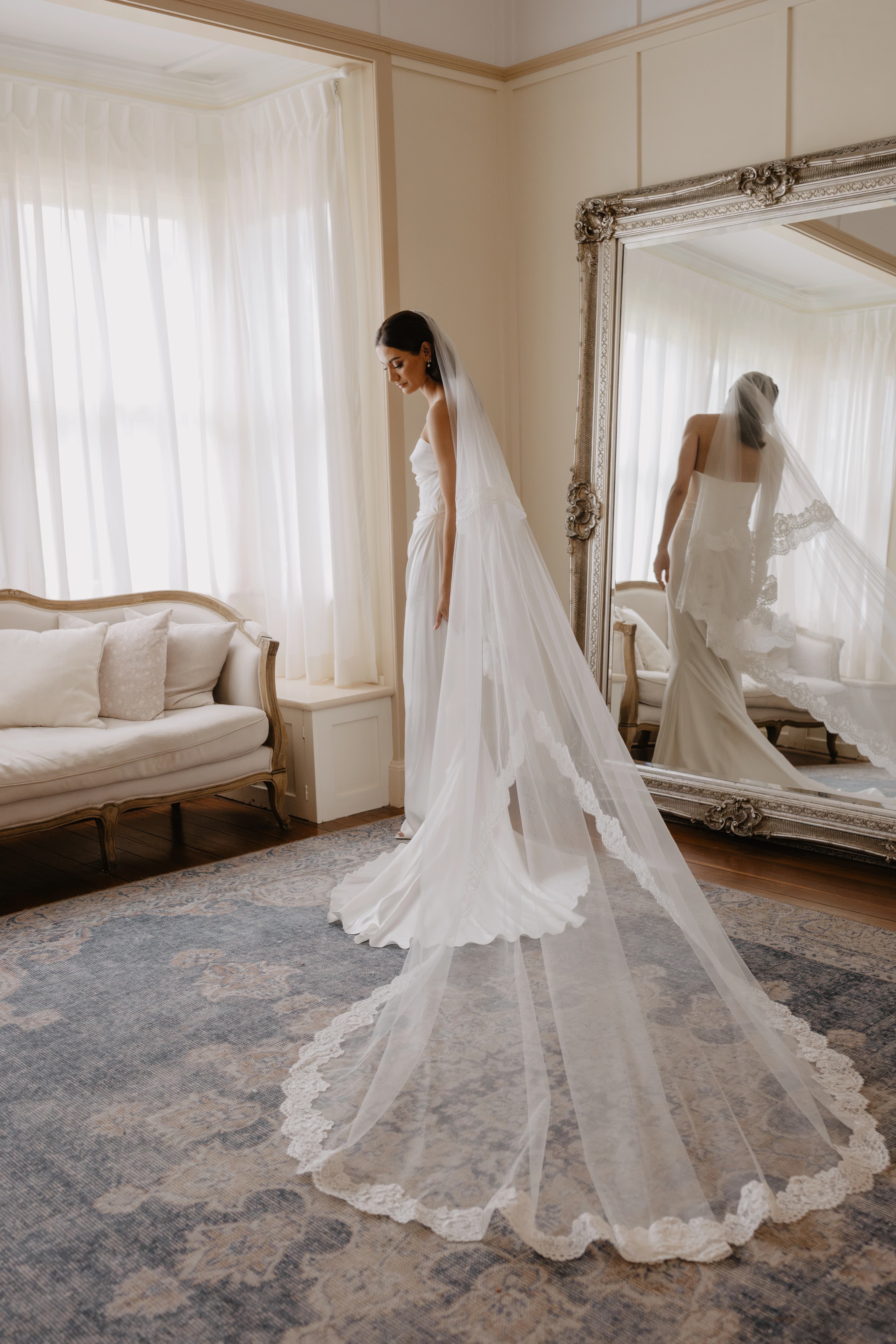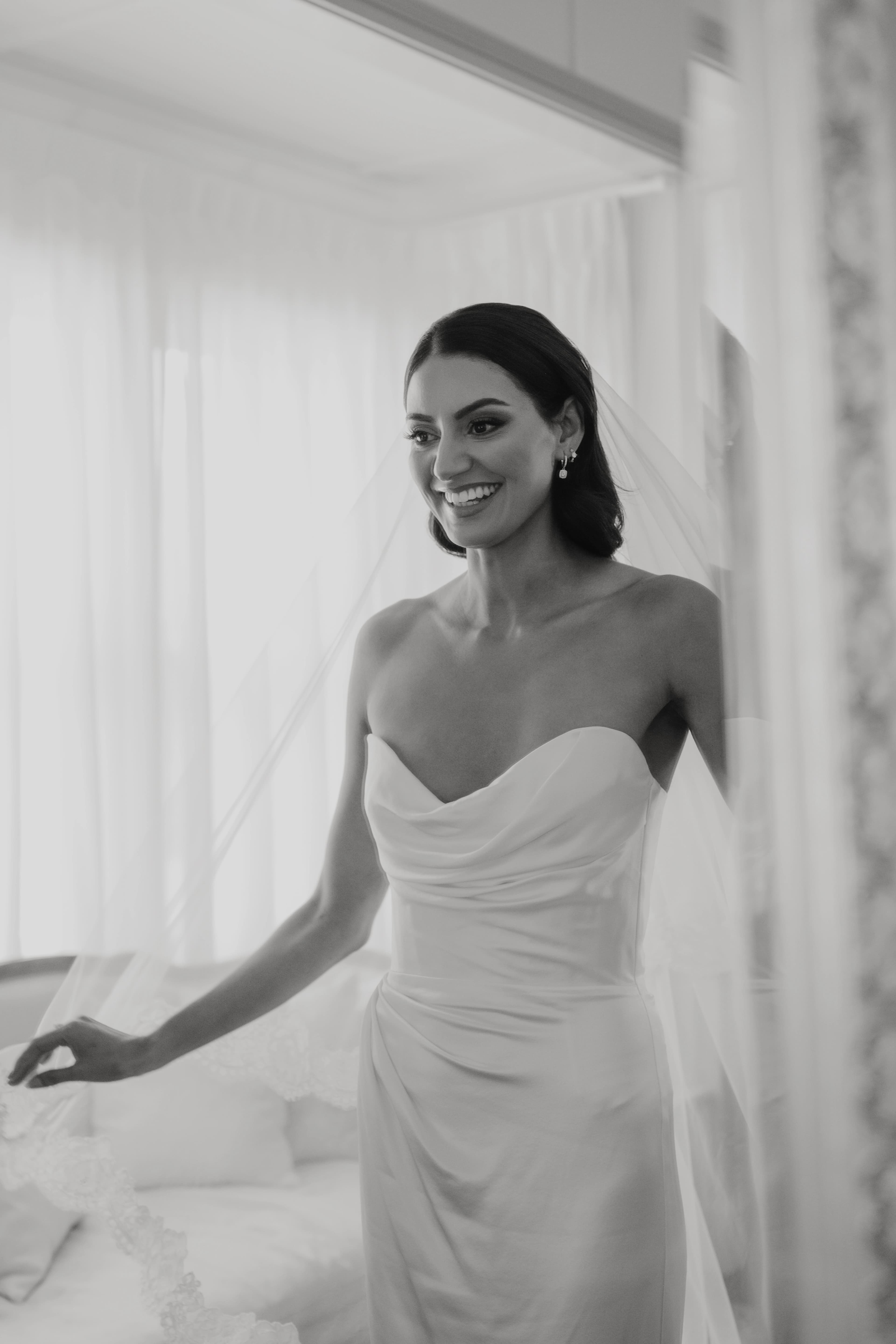 She entered with her father, her satin gown moving in liquid lines, veil edged in lace like fine engraving against air. The cedar stood before them as a sentinel, its branches folding into silence while orchids, garden roses and hydrangea gathered with greenery at its base — not as decoration but as offering, as though the garden itself leaned in to witness. White ribbons traced the aisle like streams of light, guiding guests into stillness as vows rose softly into the afternoon air. At the reception, the sense of intention carried through — pears nestled among florals, glassware tied with black ribbons etched in playful symbols and menus adorned with hand-drawn detail. Each table felt both refined and alive, blending elegance with personality. As candlelight gathered the evening close, the celebration seemed to distil into presence — luminous, grounded and enduring.
