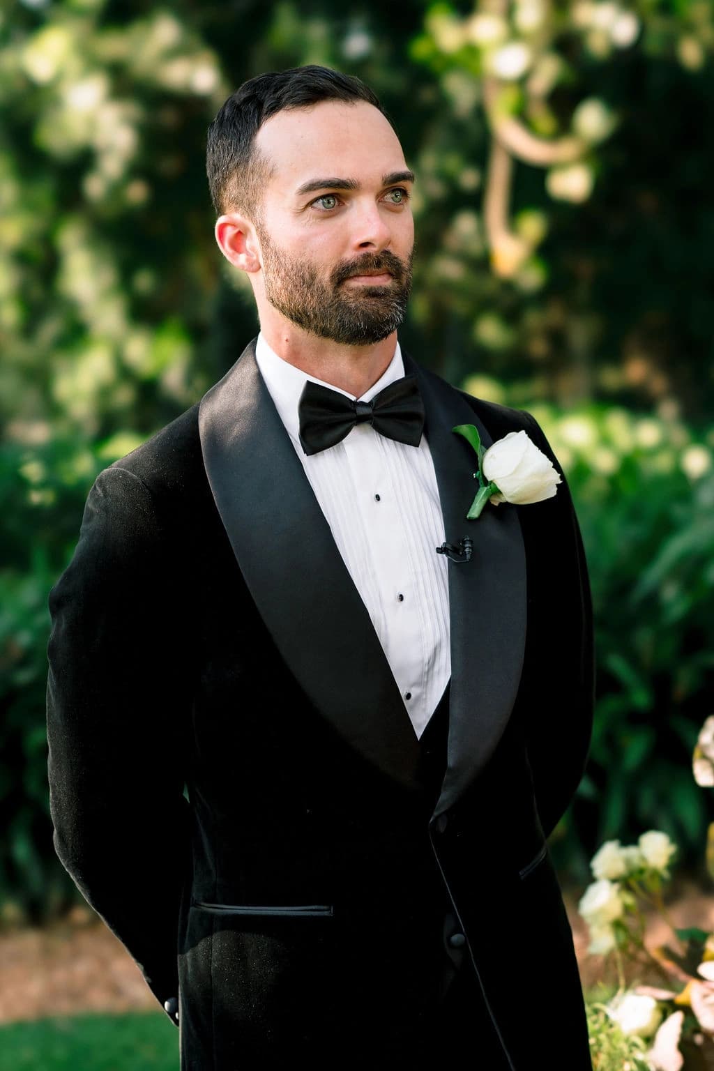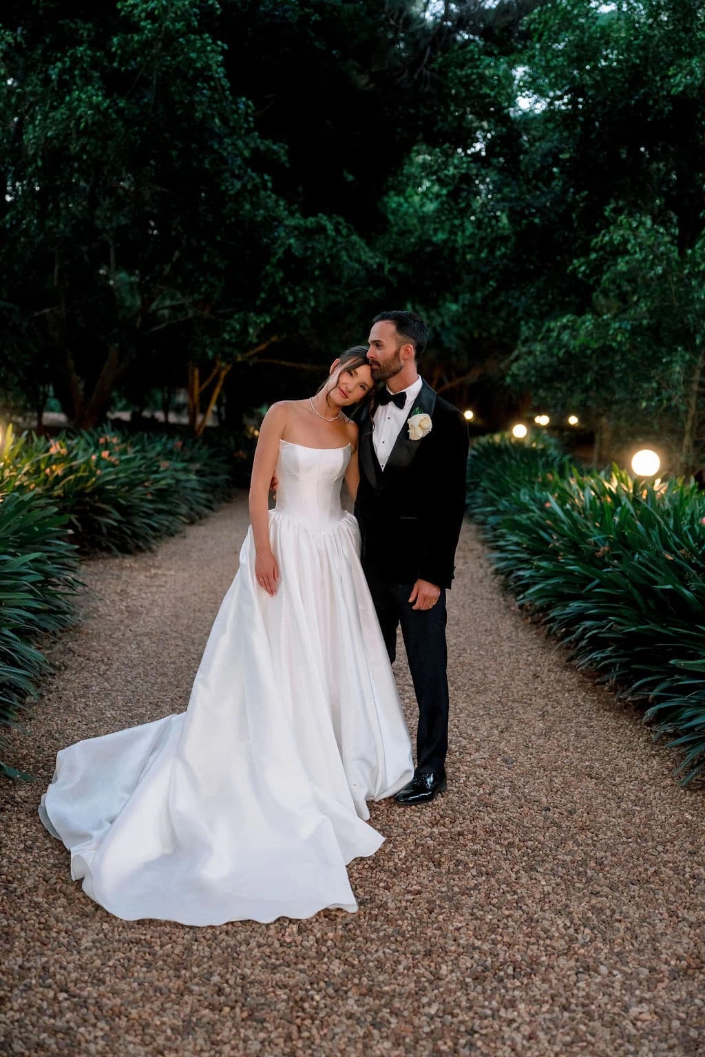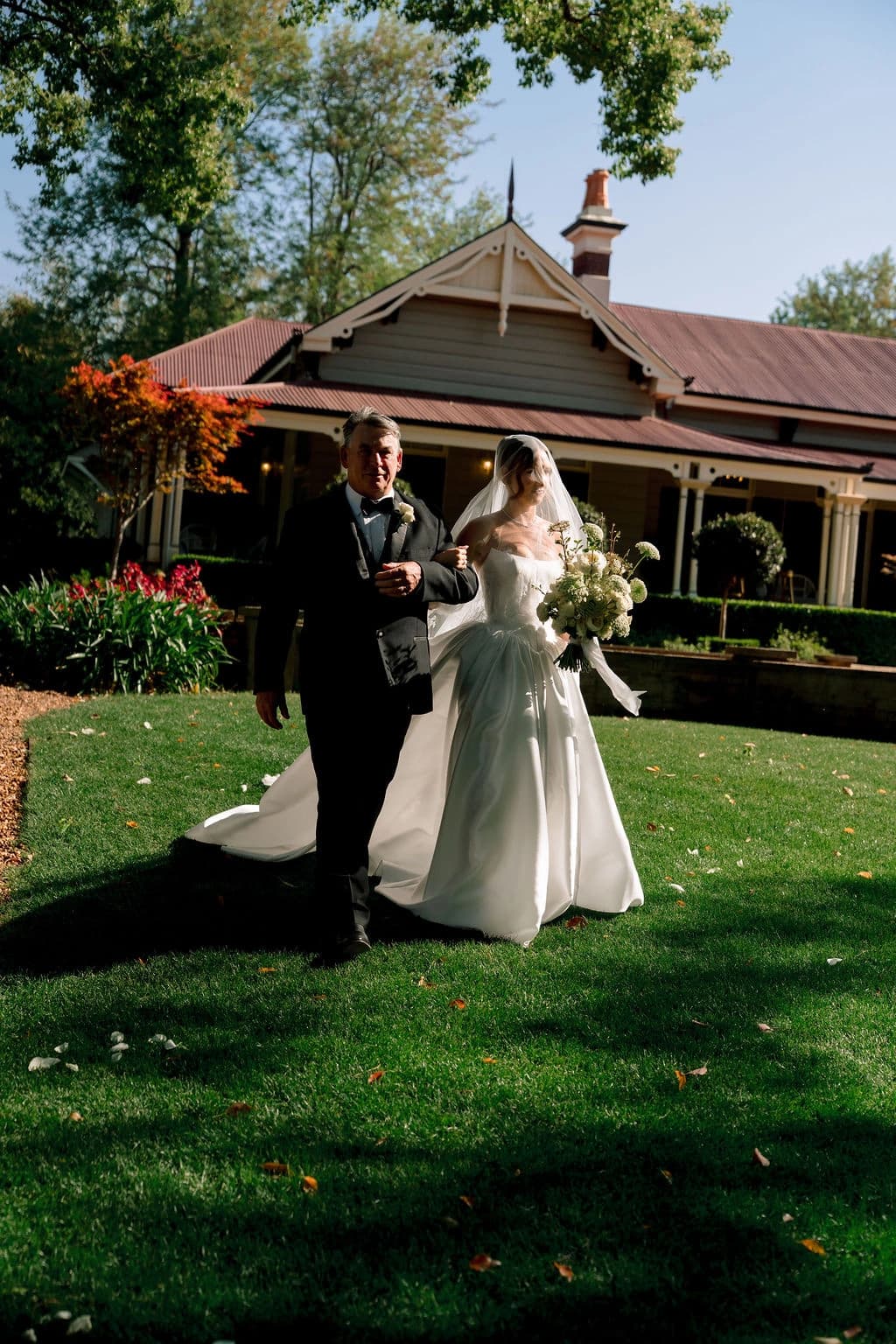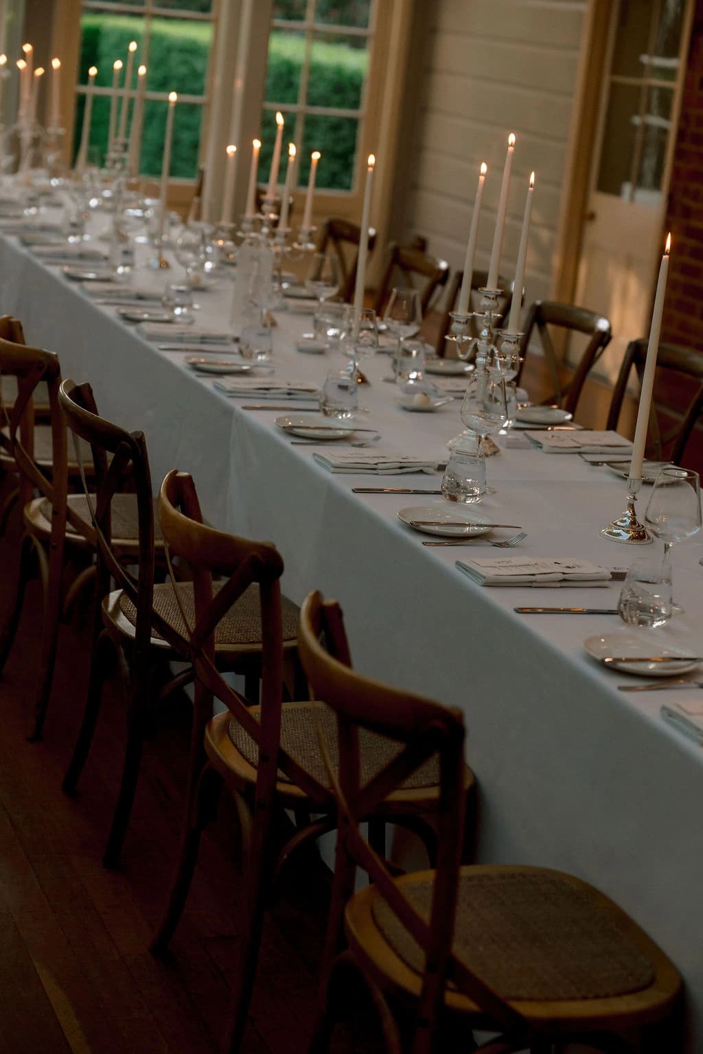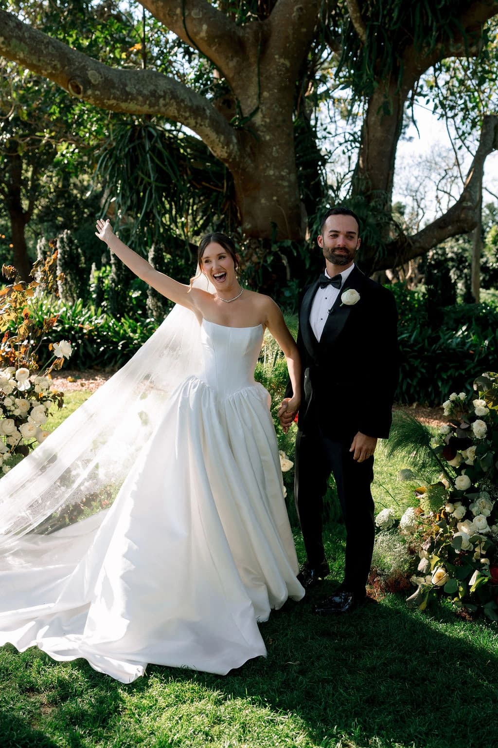 Beneath the generous canopy of The Governor’s Lawn, seventy-three guests gathered as ivory florals rose from sculptural greenery, punctuated by flashes of deep crimson anthurium. Sheridan arrived in a structured satin gown, its corseted bodice and sweeping skirt softened by a veil that caught the afternoon light. A diamond necklace rested delicately at her collarbone, echoing the quiet refinement of the day. Order-of-service cards, torn-edged and sealed in wax, hinted at the care woven into every detail. As timber chairs lined the grass and vows were spoken beneath ancient branches, celebration gave way to candlelit elegance inside, where long tables, silver candelabra and softly glowing tapers carried the story into evening.
