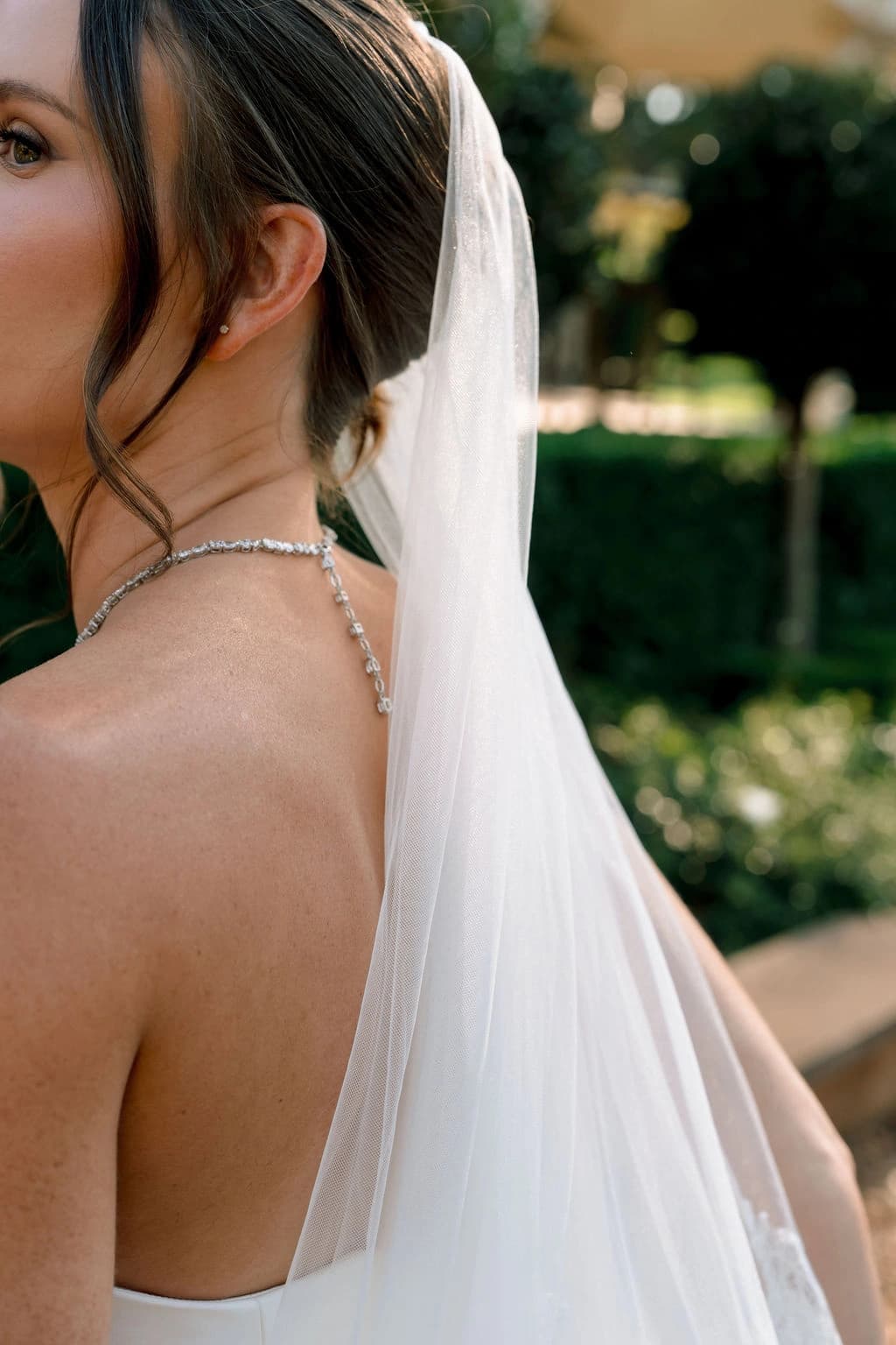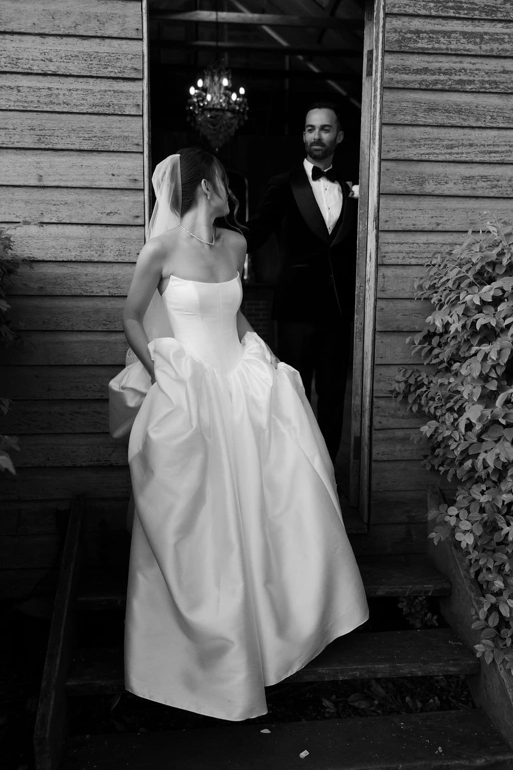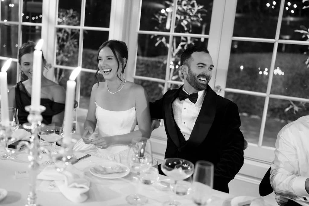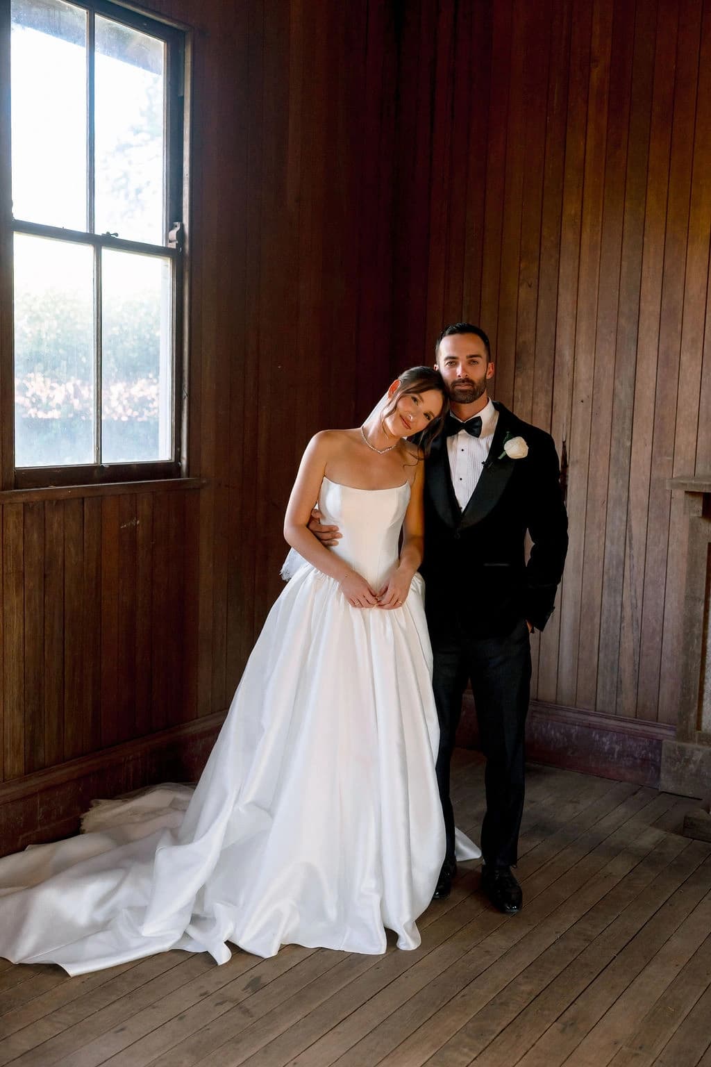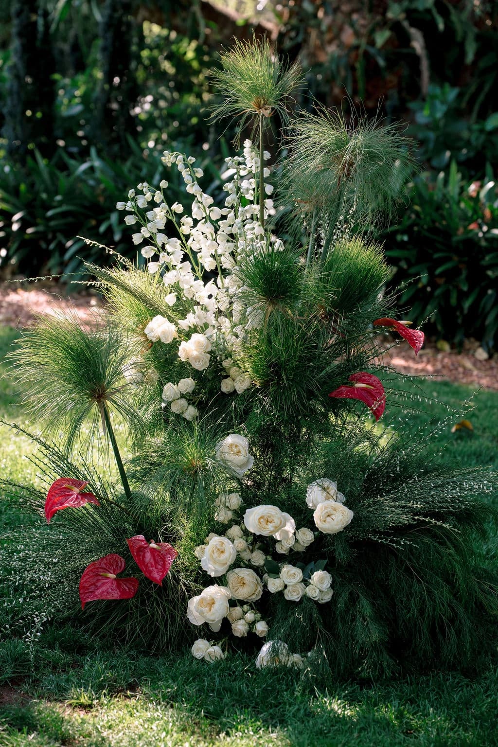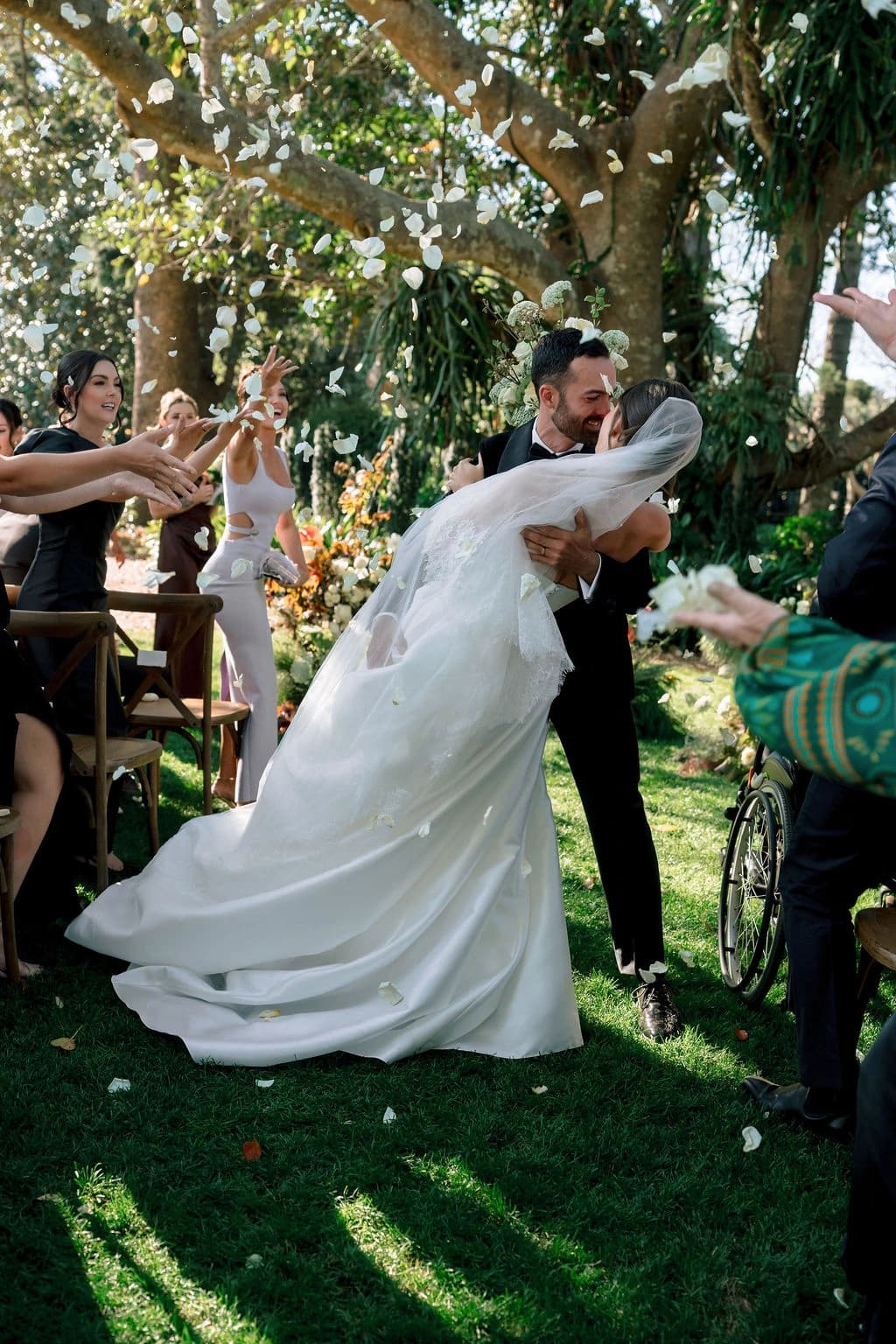 Beneath the generous canopy of The Governor’s Lawn, seventy-three guests gathered as ivory florals rose from sculptural greenery, punctuated by flashes of deep crimson anthurium. Sheridan arrived in a structured satin gown, its corseted bodice and sweeping skirt softened by a veil that caught the afternoon light. A diamond necklace rested delicately at her collarbone, echoing the quiet refinement of the day. Order-of-service cards, torn-edged and sealed in wax, hinted at the care woven into every detail. As timber chairs lined the grass and vows were spoken beneath ancient branches, celebration gave way to candlelit elegance inside, where long tables, silver candelabra and softly glowing tapers carried the story into evening.