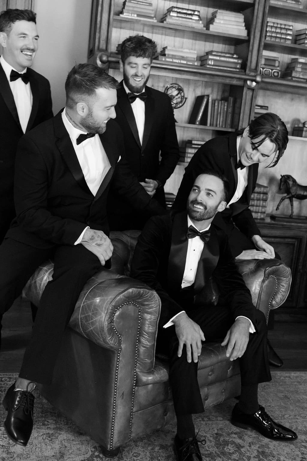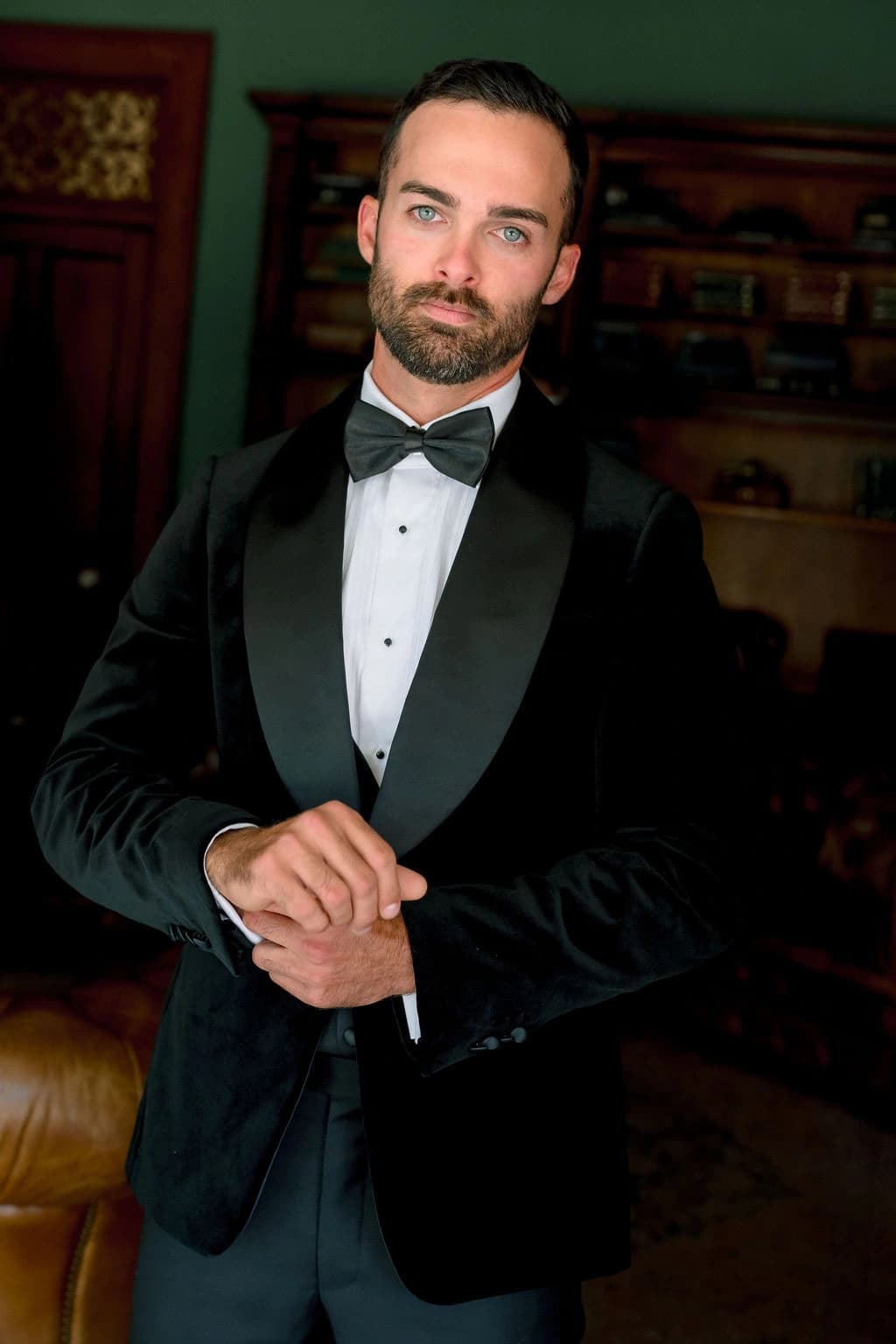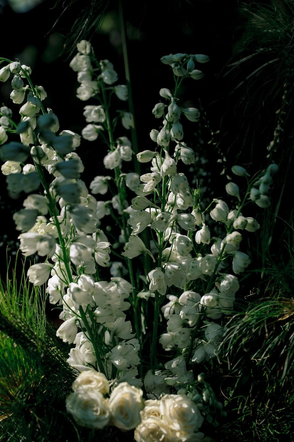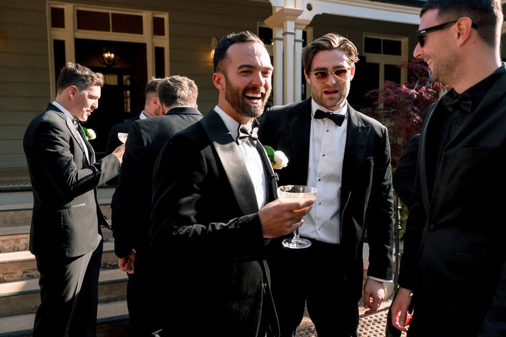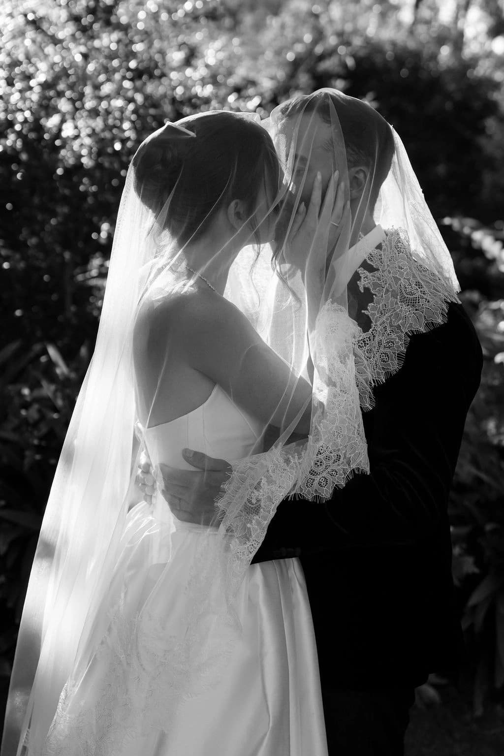 Beneath the generous canopy of The Governor’s Lawn, seventy-three guests gathered as ivory florals rose from sculptural greenery, punctuated by flashes of deep crimson anthurium. Sheridan arrived in a structured satin gown, its corseted bodice and sweeping skirt softened by a veil that caught the afternoon light. A diamond necklace rested delicately at her collarbone, echoing the quiet refinement of the day. Order-of-service cards, torn-edged and sealed in wax, hinted at the care woven into every detail. As timber chairs lined the grass and vows were spoken beneath ancient branches, celebration gave way to candlelit elegance inside, where long tables, silver candelabra and softly glowing tapers carried the story into evening.