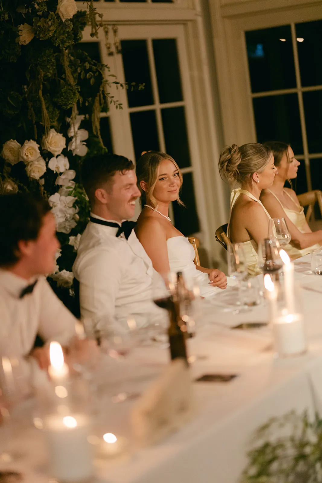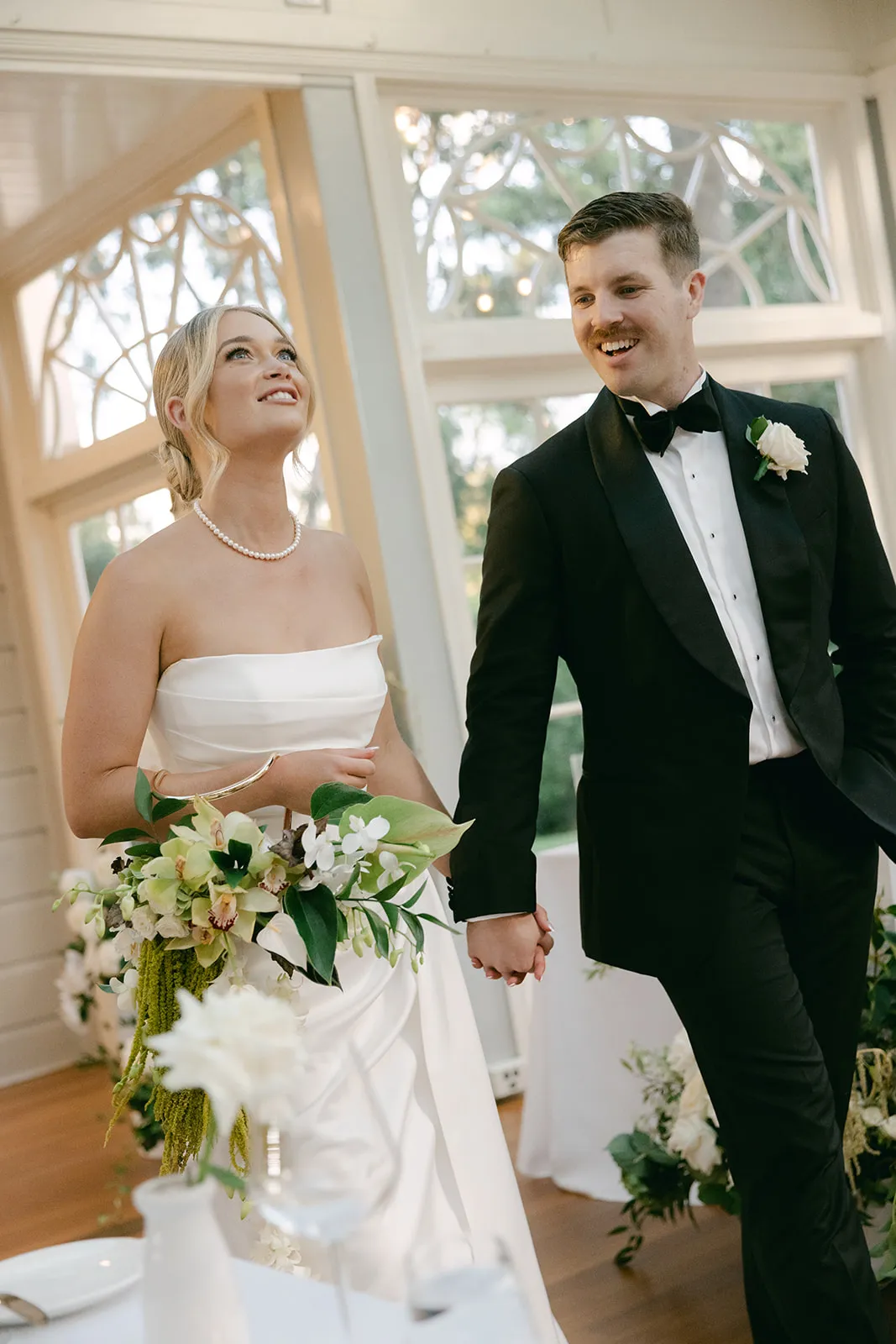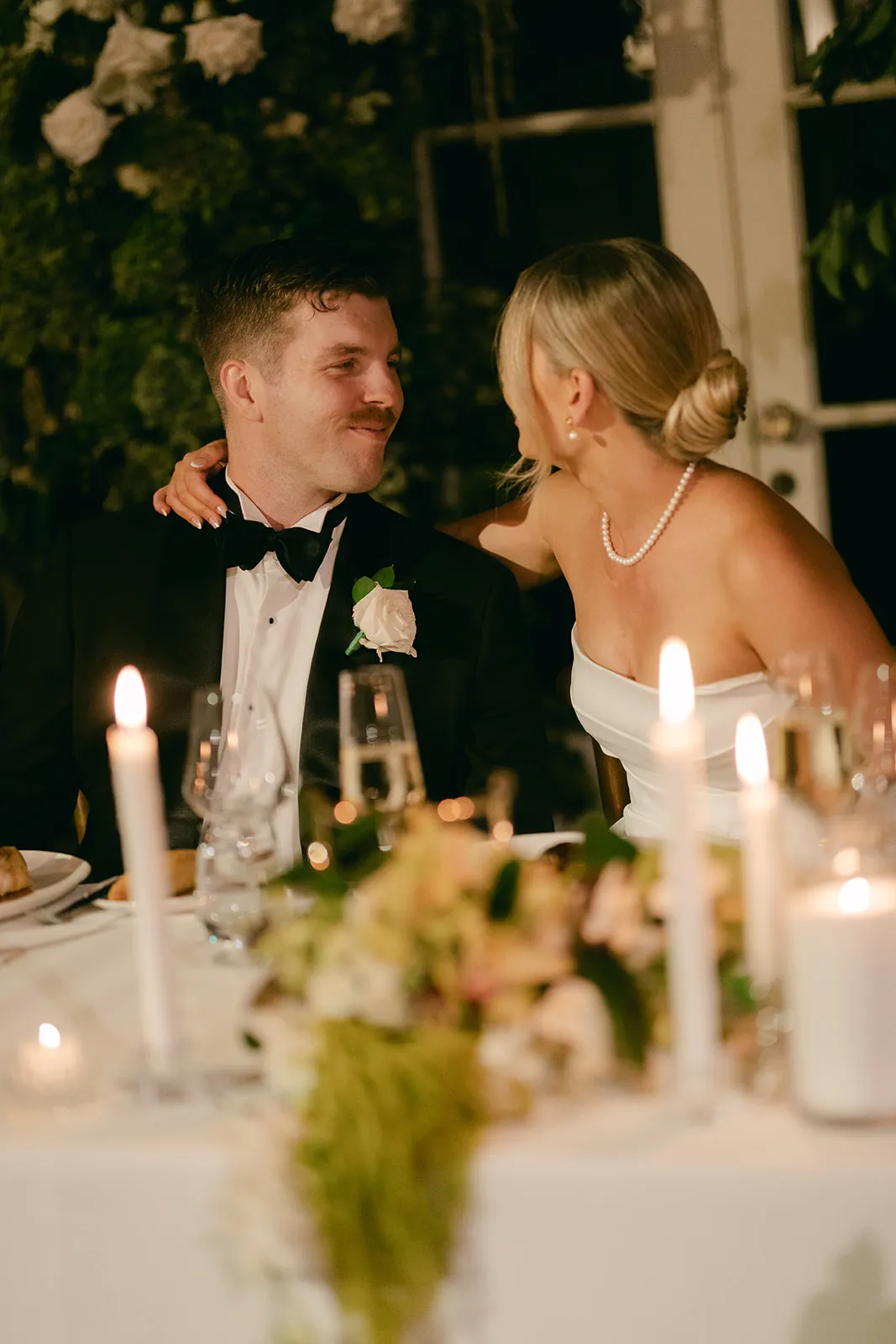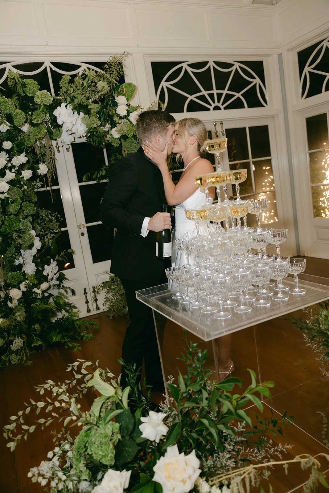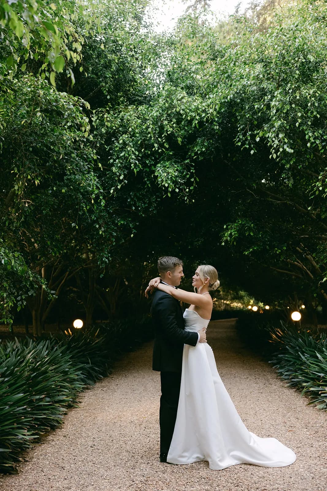 Beneath the Cedar’s Lawn, shaded by towering trees and framed by sculptural white blooms, Alyssa and Max exchanged vows — their words felt, not just heard, cradled by the soft rustle of leaves. Alyssa’s gown, a gentle ripple of fabric, moved with the same quiet grace as her steps, while Max’s black-tie formality offered a reassuring weight, grounding the day’s softer edges. Inside the Conservatory, candlelight glowed against pressed linen, white accents, and a tower of coupe glasses that shimmered beside an evening kiss. From the first, perfume-sweet notes of morning to dusk beneath the glowing lights, every detail felt purposeful, rooted in care and joie de vivre.