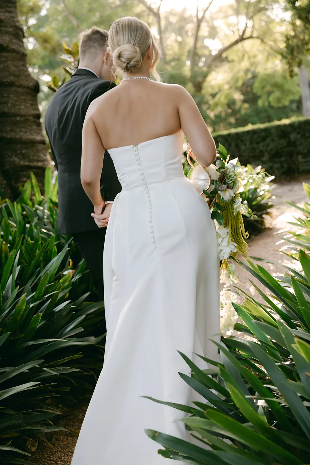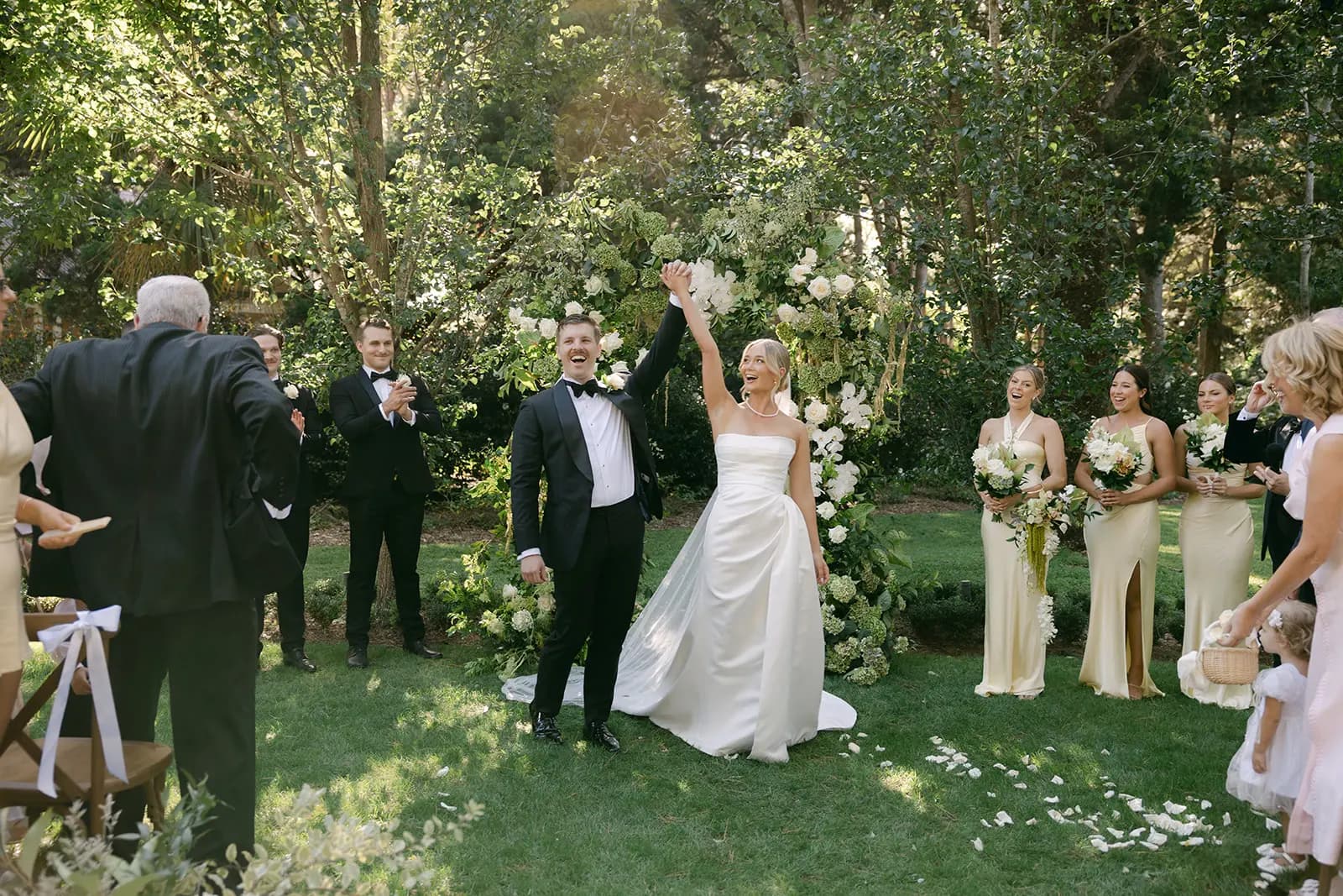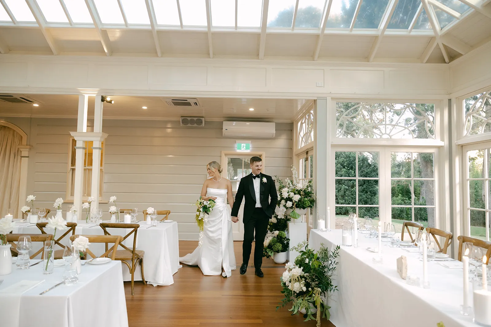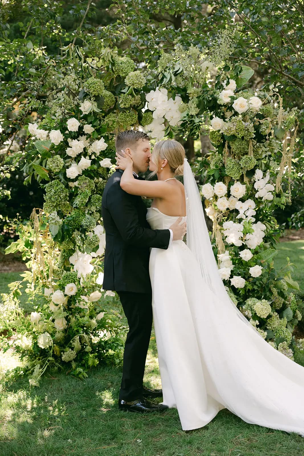 Beneath the Cedar’s Lawn, shaded by towering trees and framed by sculptural white blooms, Alyssa and Max exchanged vows — their words felt, not just heard, cradled by the soft rustle of leaves. Alyssa’s gown, a gentle ripple of fabric, moved with the same quiet grace as her steps, while Max’s black-tie formality offered a reassuring weight, grounding the day’s softer edges. Inside the Conservatory, candlelight glowed against pressed linen, white accents, and a tower of coupe glasses that shimmered beside an evening kiss. From the first, perfume-sweet notes of morning to dusk beneath the glowing lights, every detail felt purposeful, rooted in care and joie de vivre.