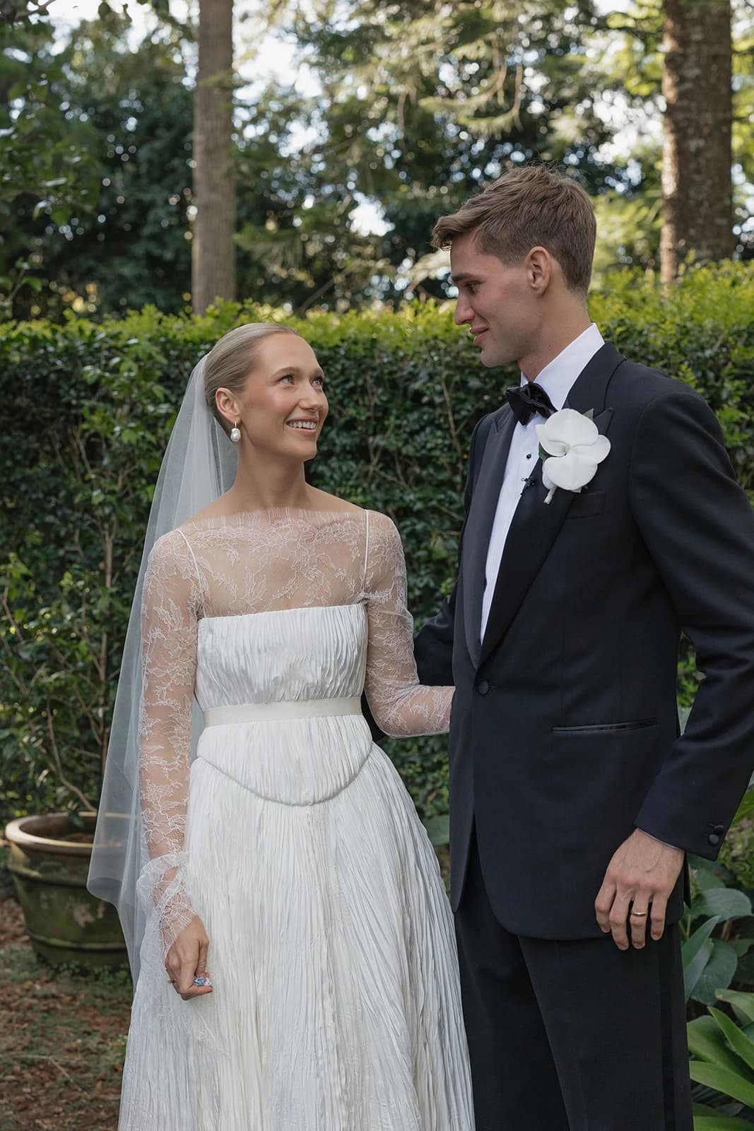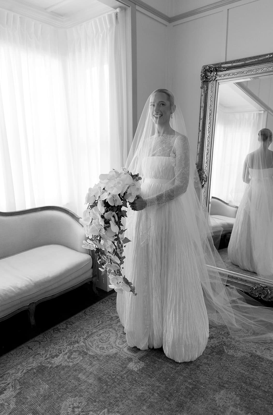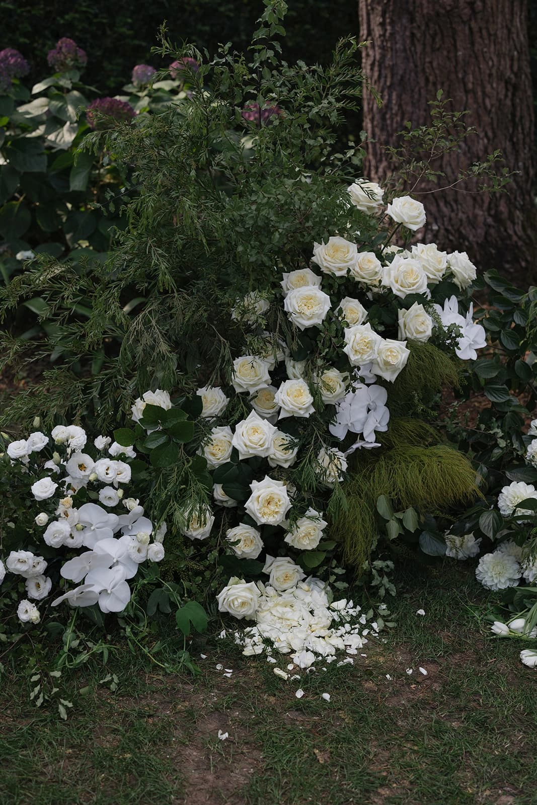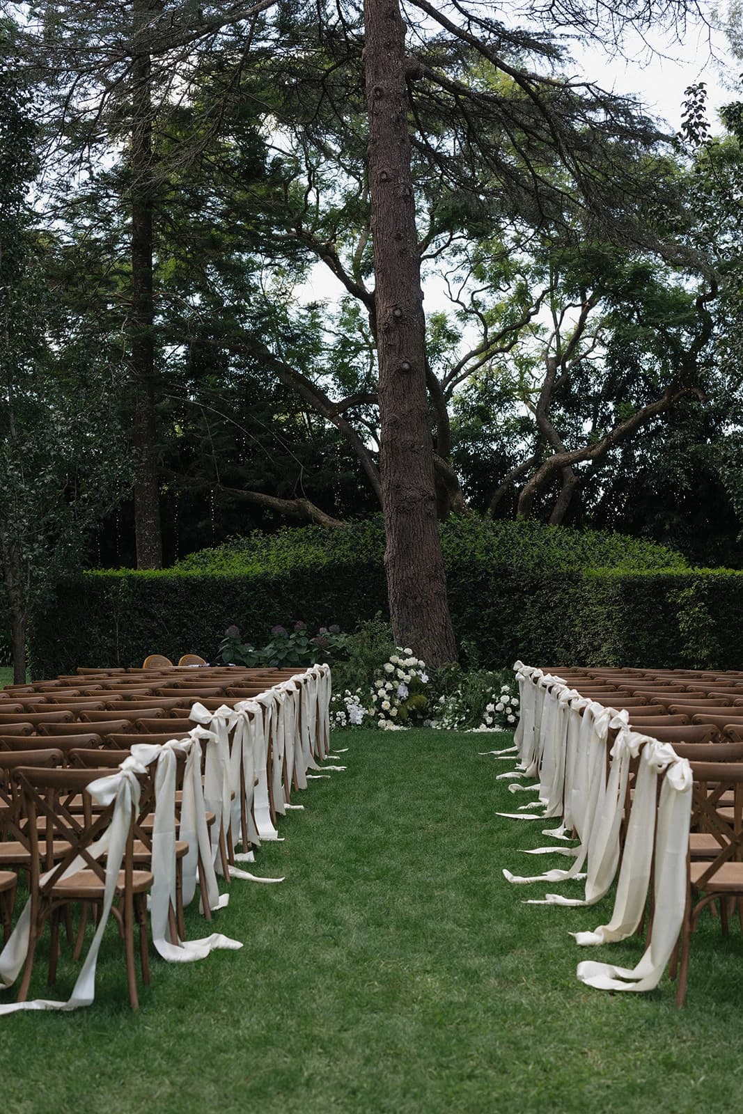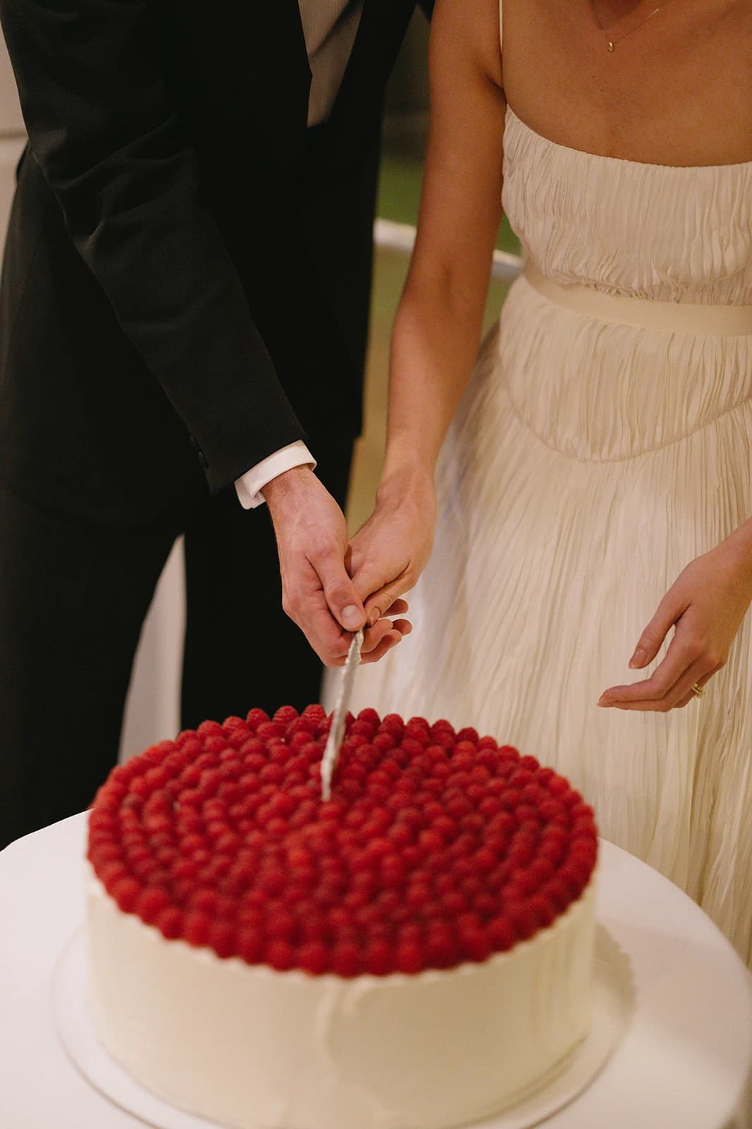 Their vows were spoken beneath the hush of towering trees, where ivory ribbons traced the aisle and roses clustered at the base of a grand cedar, wild and unstructured as if grown just for them. Her gown, pleated like pressed silk, caught the light with every step, and the air held the stillness of something sacred. Later, laughter gathered in the Conservatory, spilling into the night with the clink of glassware and candlelight flickering against pressed linens. There was a certain quiet joy to it all. Even the cake, crowned in perfect raspberries, felt artful in its restraint. A day composed with grace.