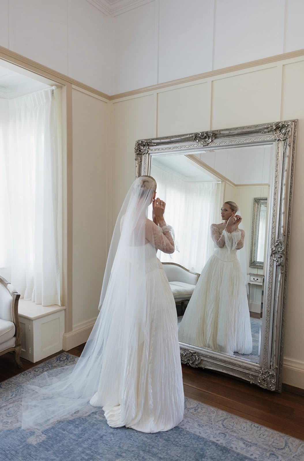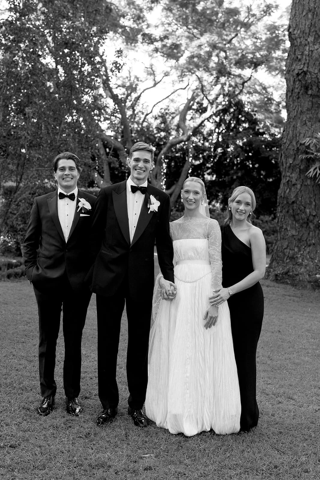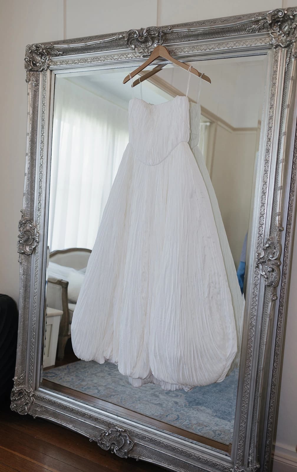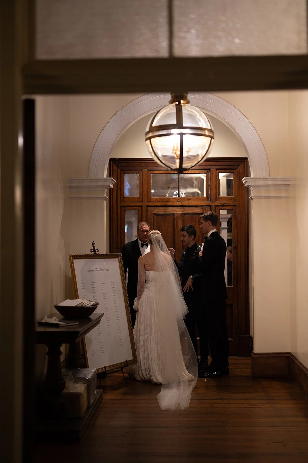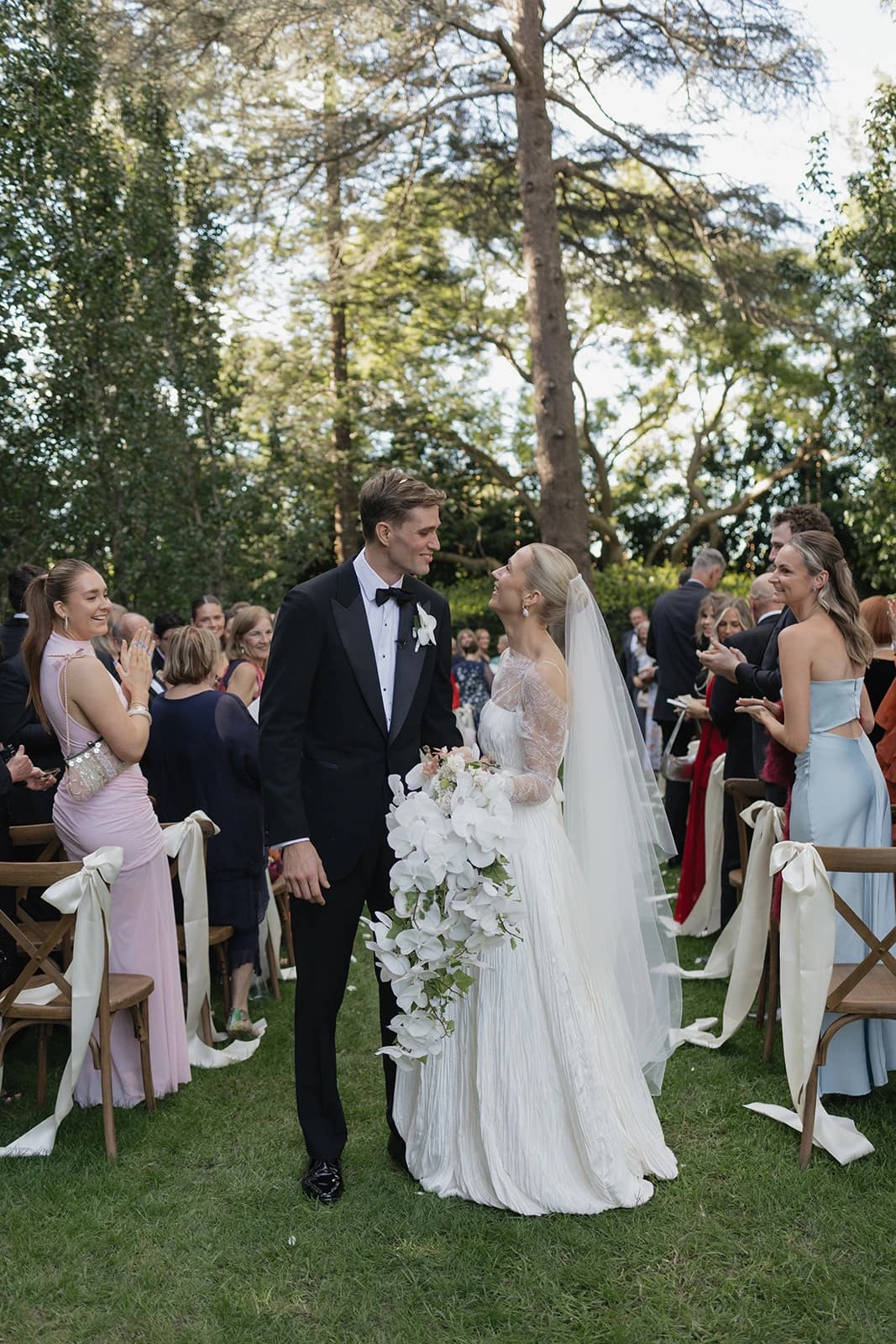 Their vows were spoken beneath the hush of towering trees, where ivory ribbons traced the aisle and roses clustered at the base of a grand cedar, wild and unstructured as if grown just for them. Her gown, pleated like pressed silk, caught the light with every step, and the air held the stillness of something sacred. Later, laughter gathered in the Conservatory, spilling into the night with the clink of glassware and candlelight flickering against pressed linens. There was a certain quiet joy to it all. Even the cake, crowned in perfect raspberries, felt artful in its restraint. A day composed with grace.