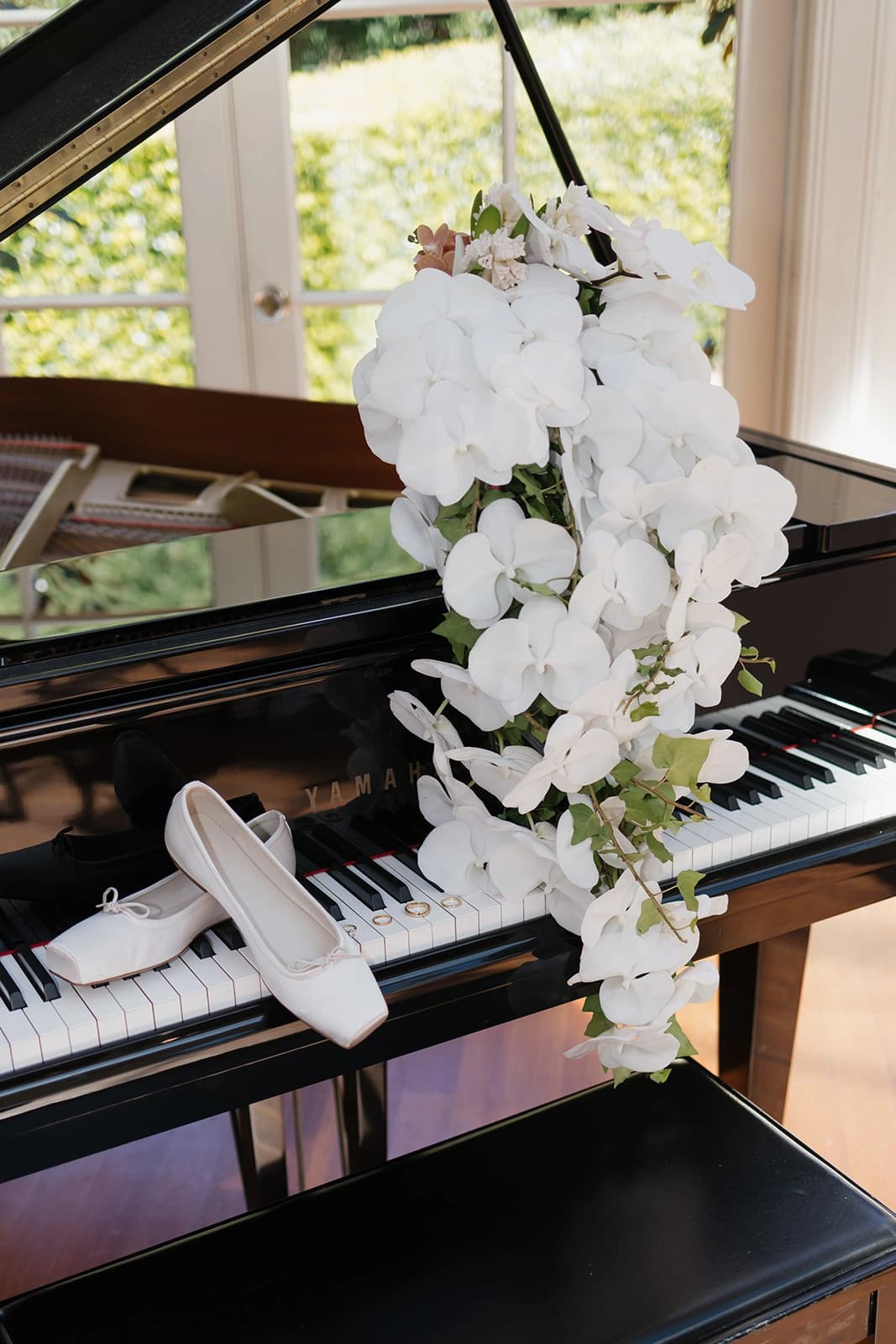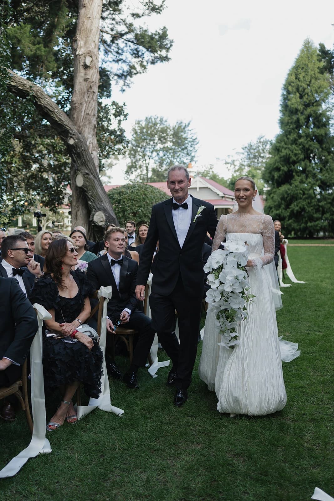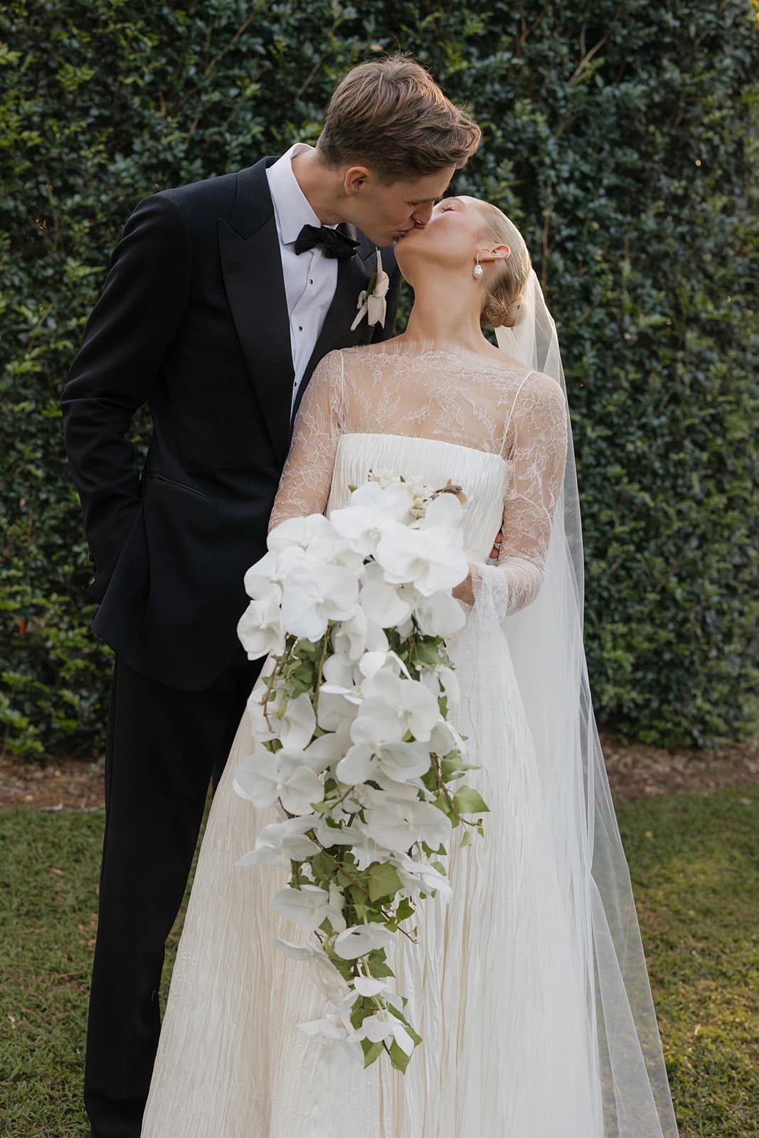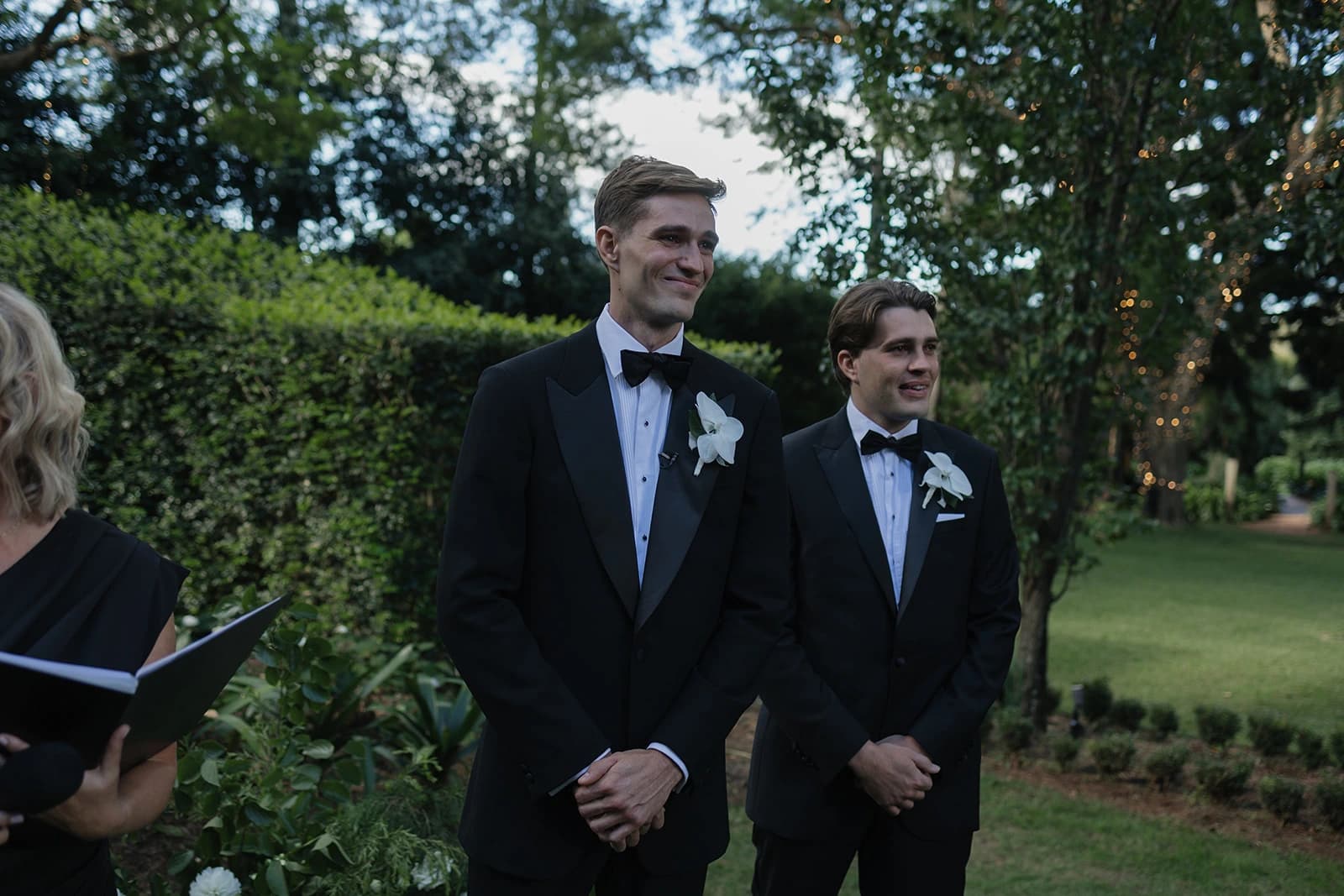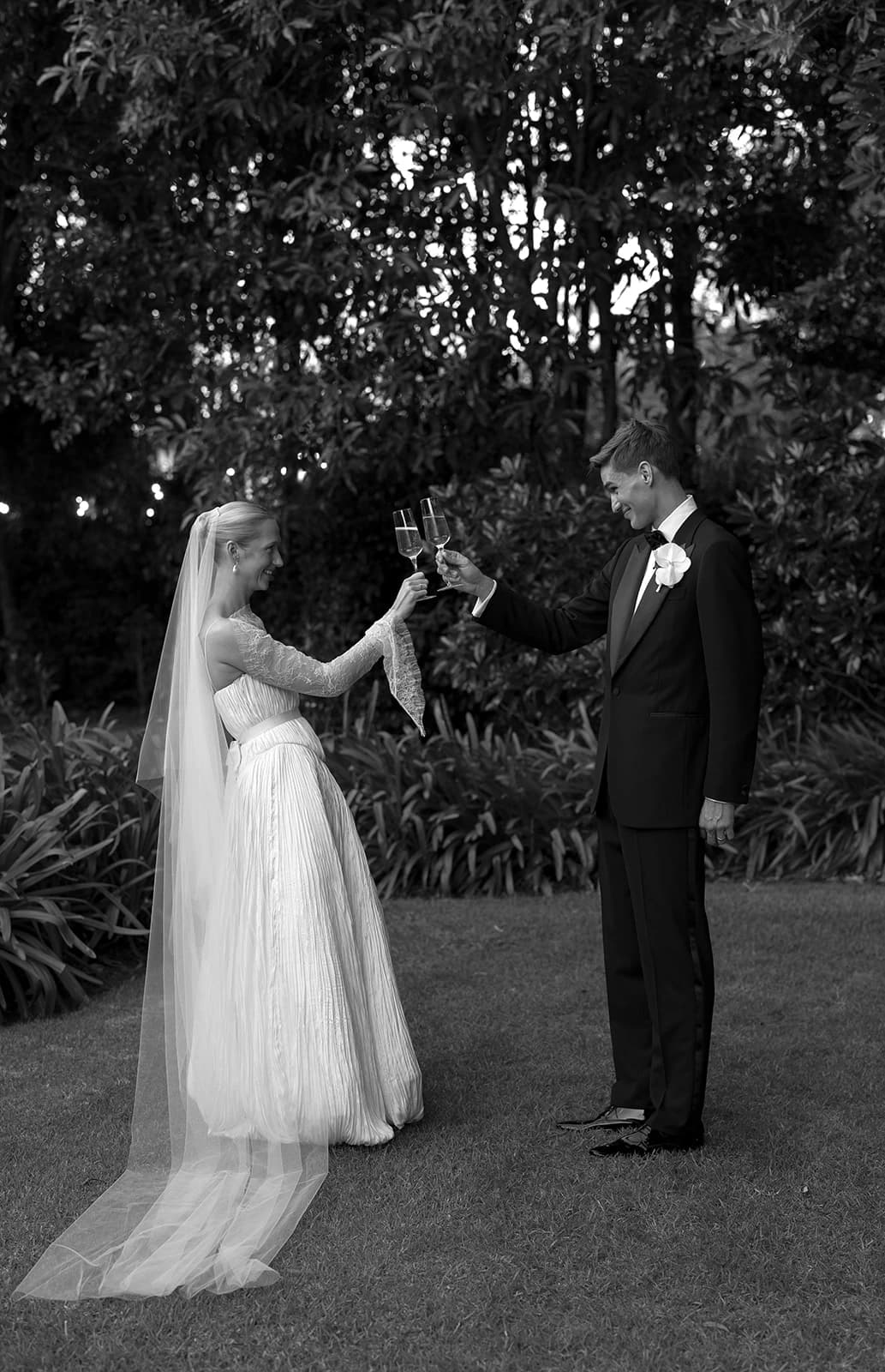 Their vows were spoken beneath the hush of towering trees, where ivory ribbons traced the aisle and roses clustered at the base of a grand cedar, wild and unstructured as if grown just for them. Her gown, pleated like pressed silk, caught the light with every step, and the air held the stillness of something sacred. Later, laughter gathered in the Conservatory, spilling into the night with the clink of glassware and candlelight flickering against pressed linens. There was a certain quiet joy to it all. Even the cake, crowned in perfect raspberries, felt artful in its restraint. A day composed with grace.