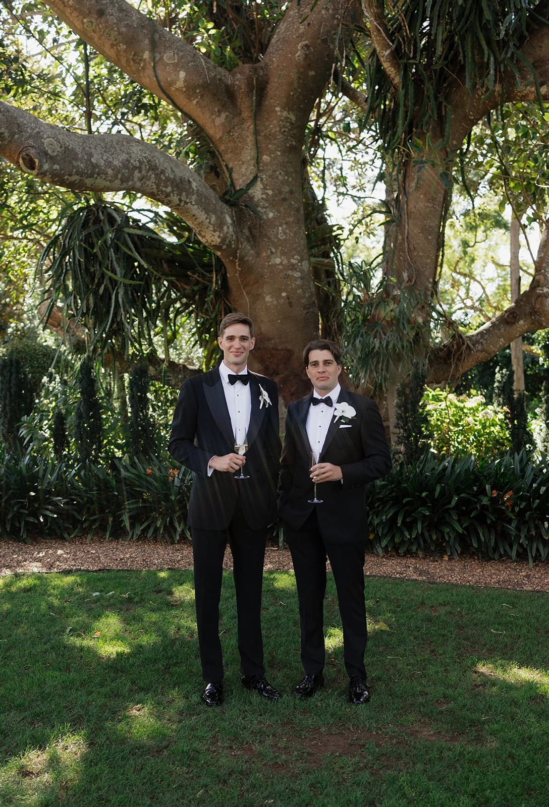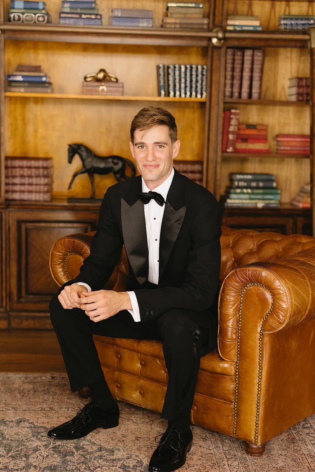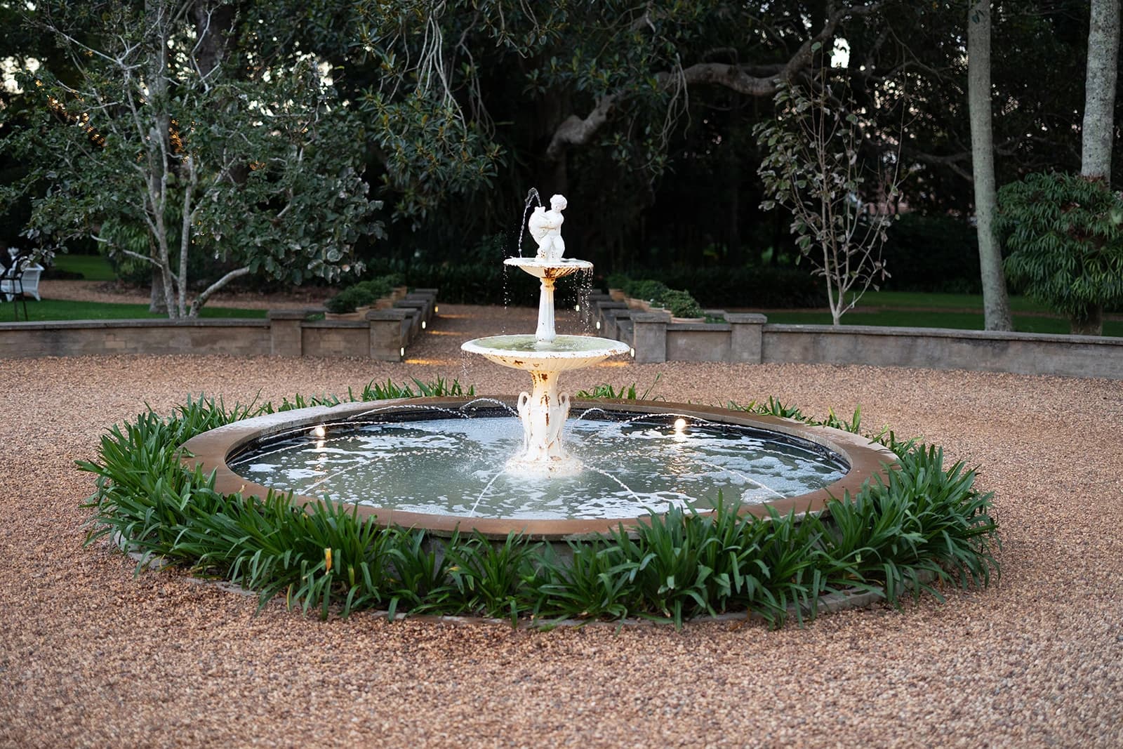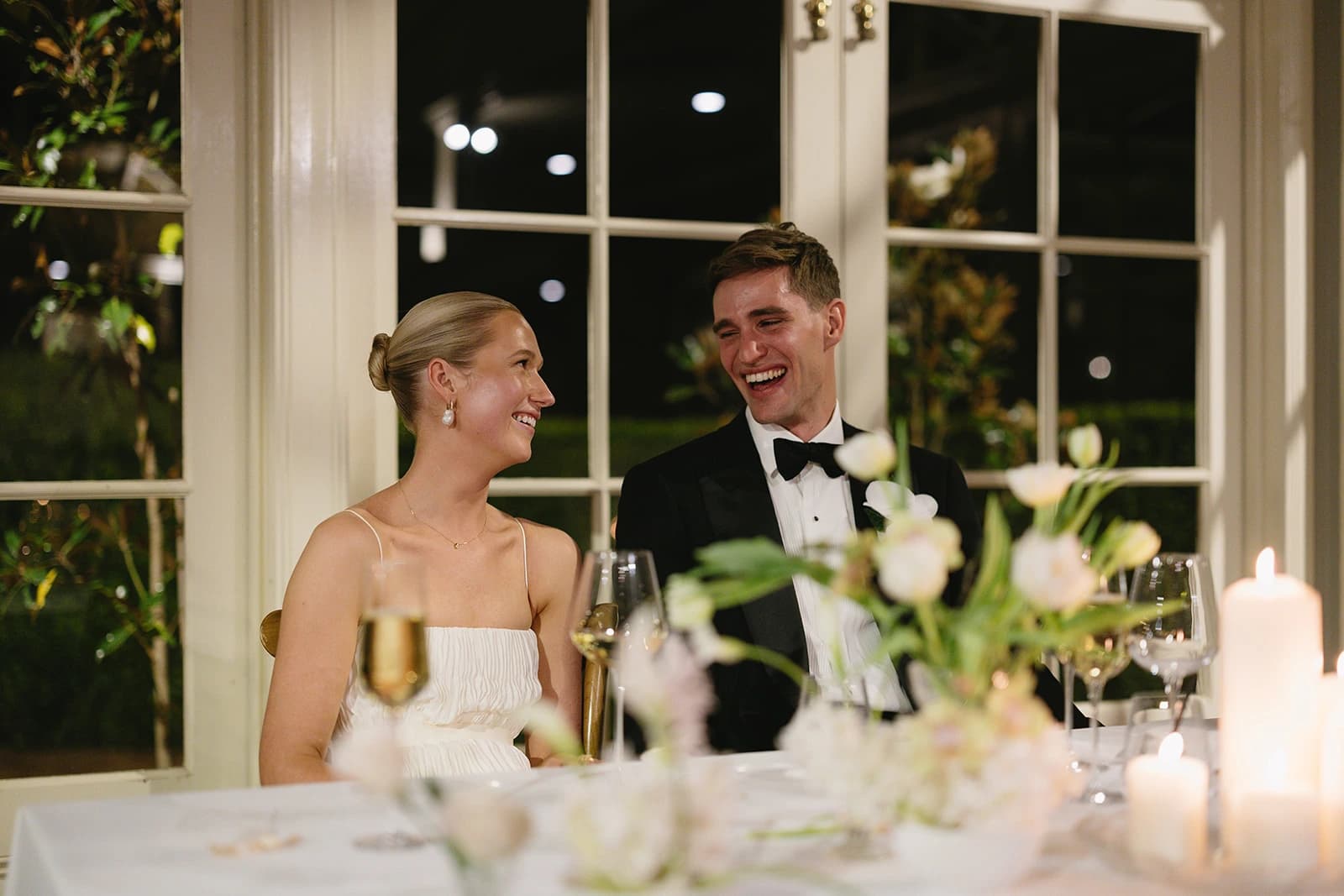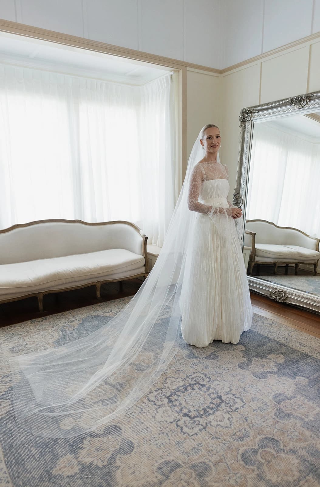 Their vows were spoken beneath the hush of towering trees, where ivory ribbons traced the aisle and roses clustered at the base of a grand cedar, wild and unstructured as if grown just for them. Her gown, pleated like pressed silk, caught the light with every step, and the air held the stillness of something sacred. Later, laughter gathered in the Conservatory, spilling into the night with the clink of glassware and candlelight flickering against pressed linens. There was a certain quiet joy to it all. Even the cake, crowned in perfect raspberries, felt artful in its restraint. A day composed with grace.