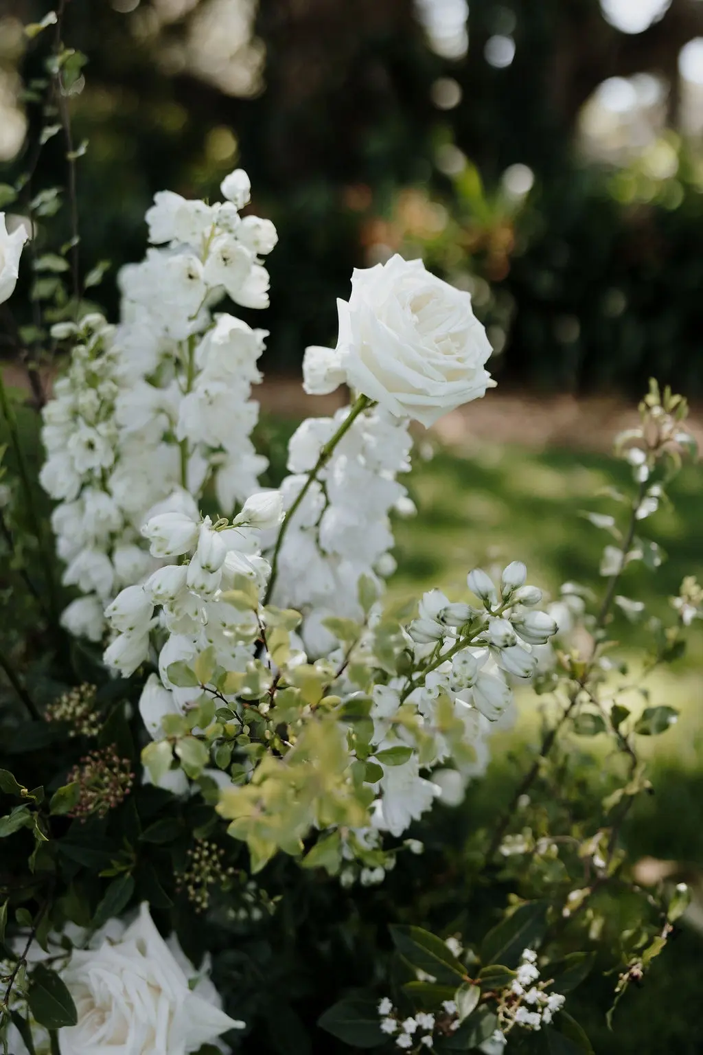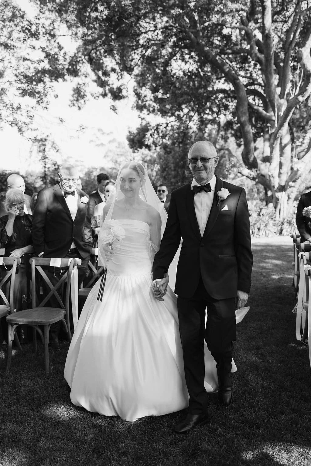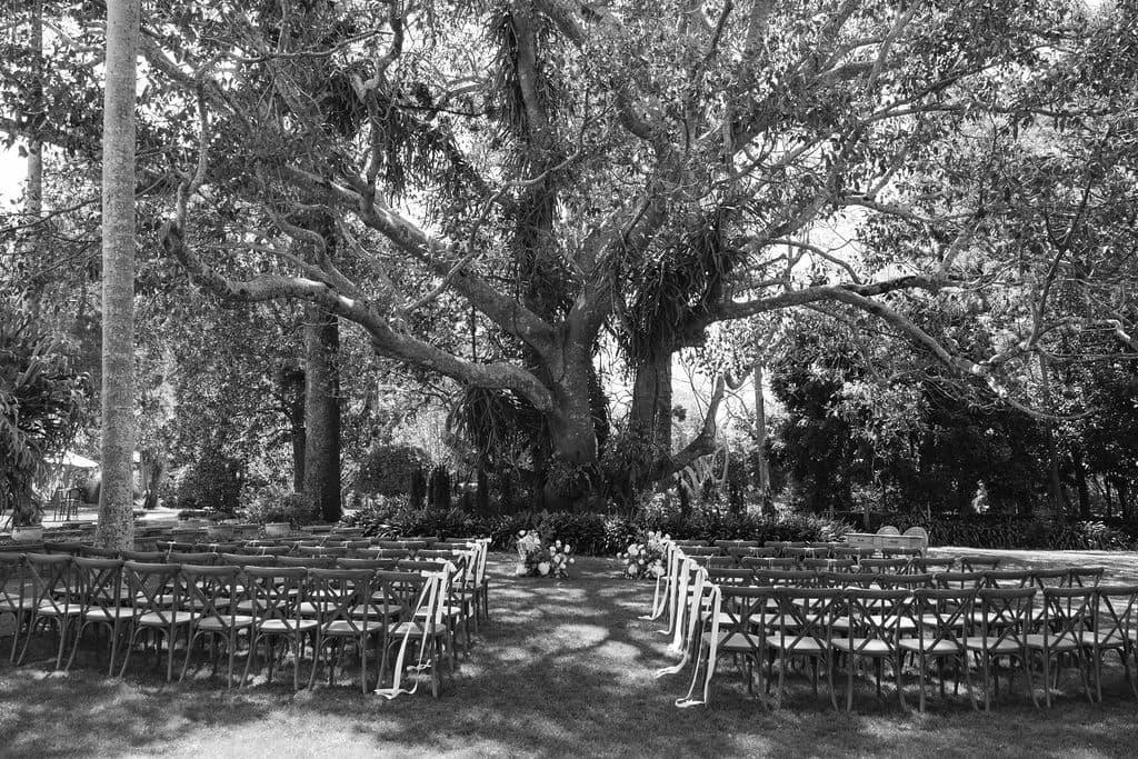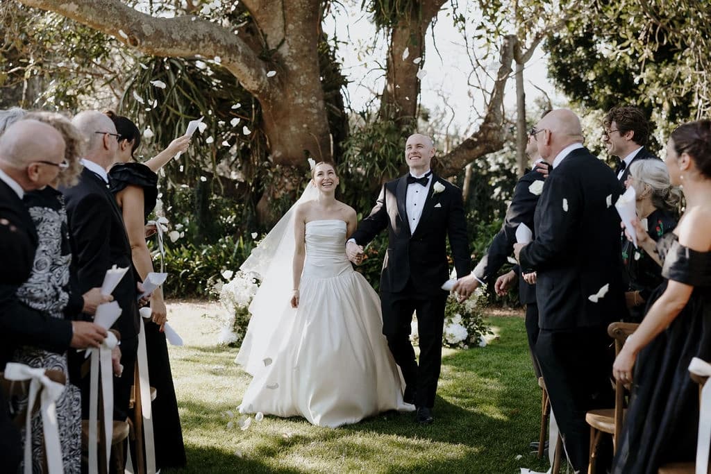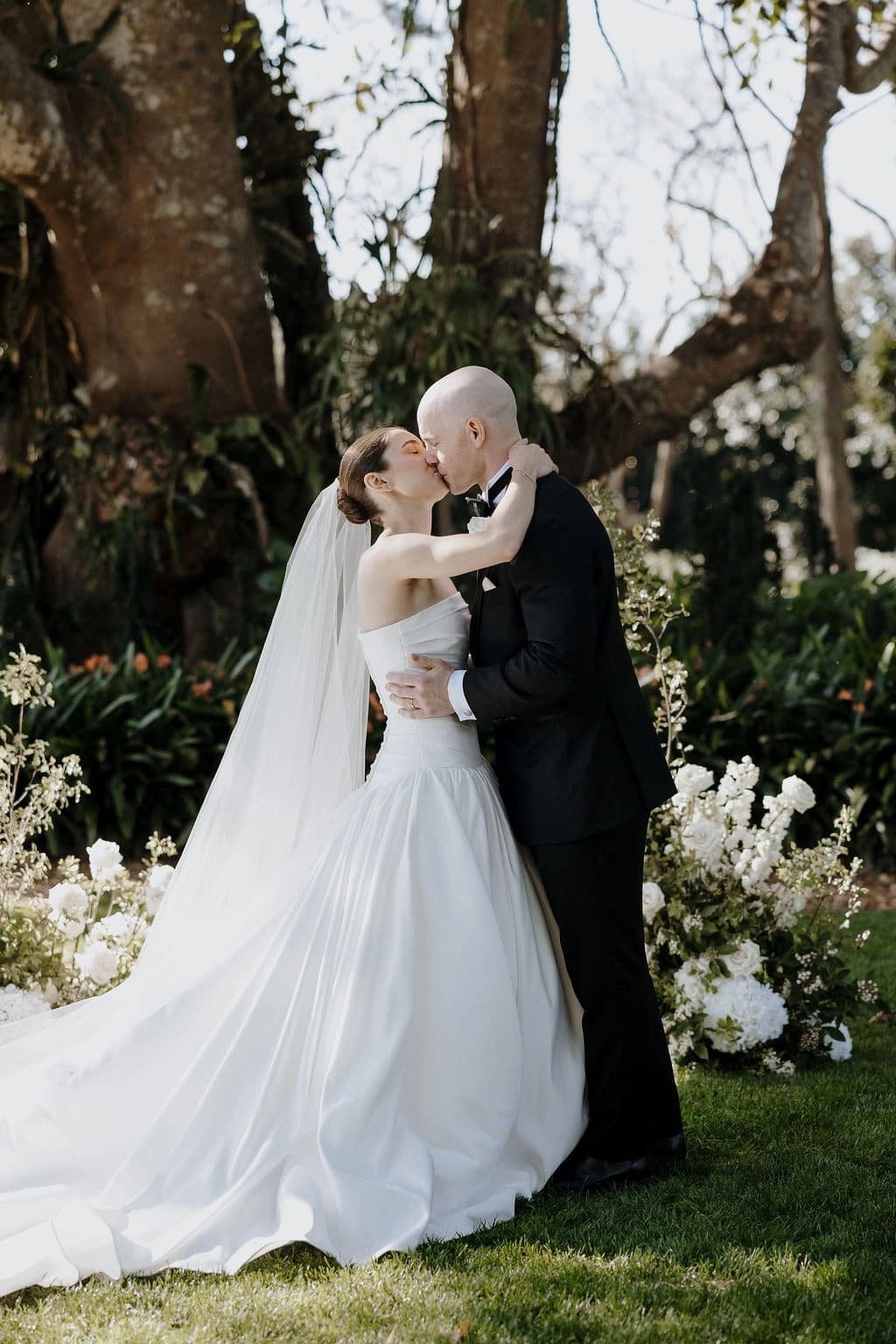 October light lingered gently across the Governor’s Lawn, soft and clear beneath the great fig trees. White roses and delphiniums framed the aisle, their petals shifting in the breeze while long ivory ribbons trailed from each chair, lifting softly as guests gathered. Her gown — a sculptural silk design with delicate ruching and a sweeping full skirt — moved with quiet grace, the fabric catching the light as she walked. He stood waiting in a black tuxedo and hand-tied bow, the scene poised in stillness. When vows were spoken, laughter and petals filled the air, a garden moment suspended in time. Later, the Conservatory was surrounded by blooms once more as candlelight gathered on the tables. She had changed into a sleek halter gown with long scarf ties that floated as they danced, the room warm with applause and the ease of celebration — a night that felt as graceful as it began.