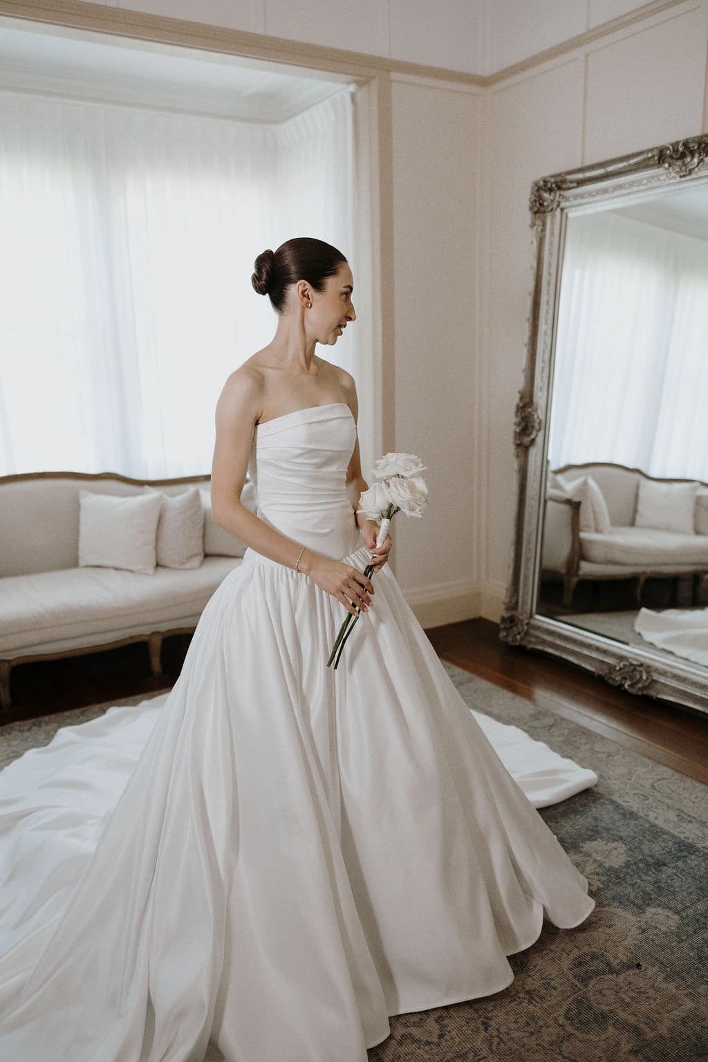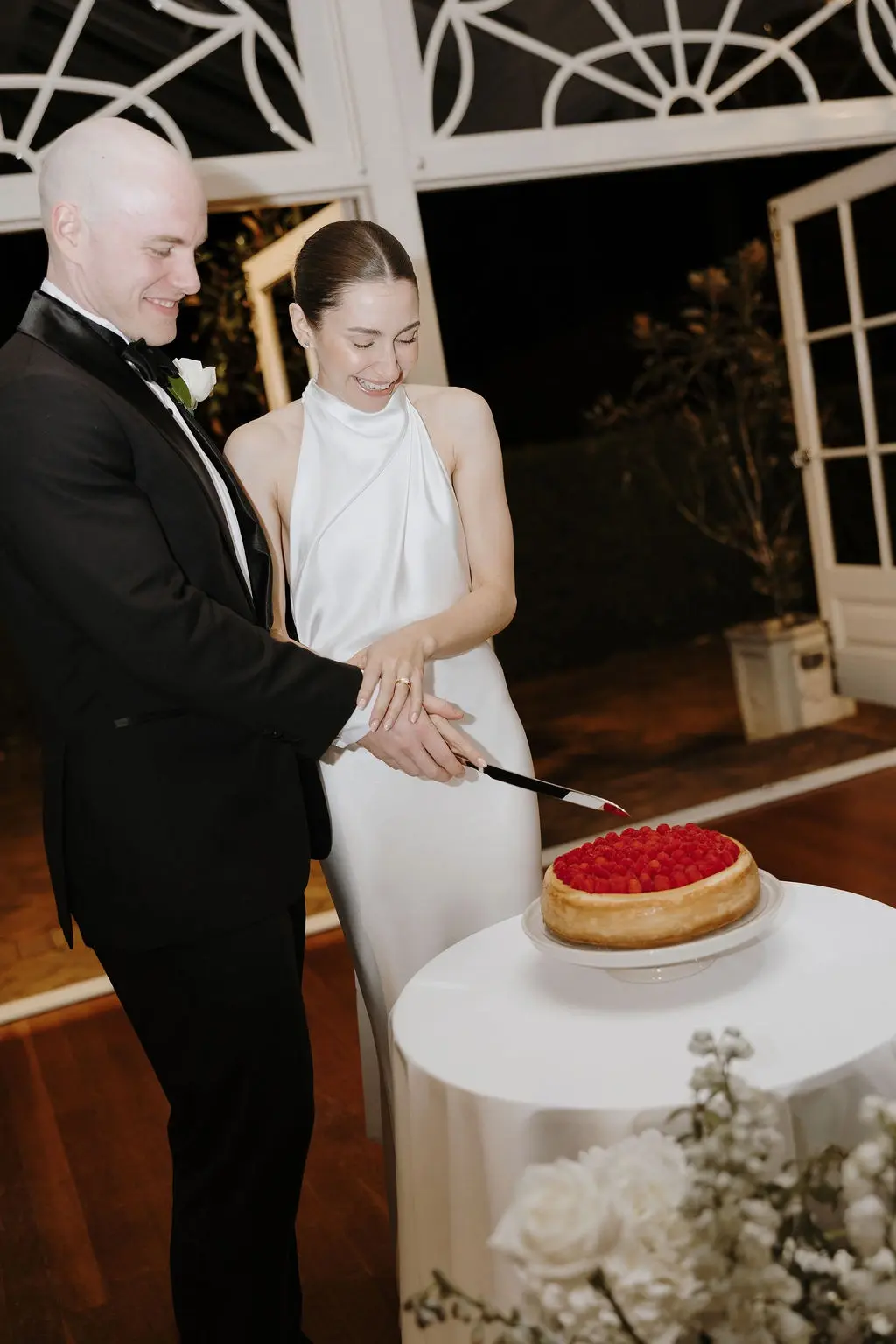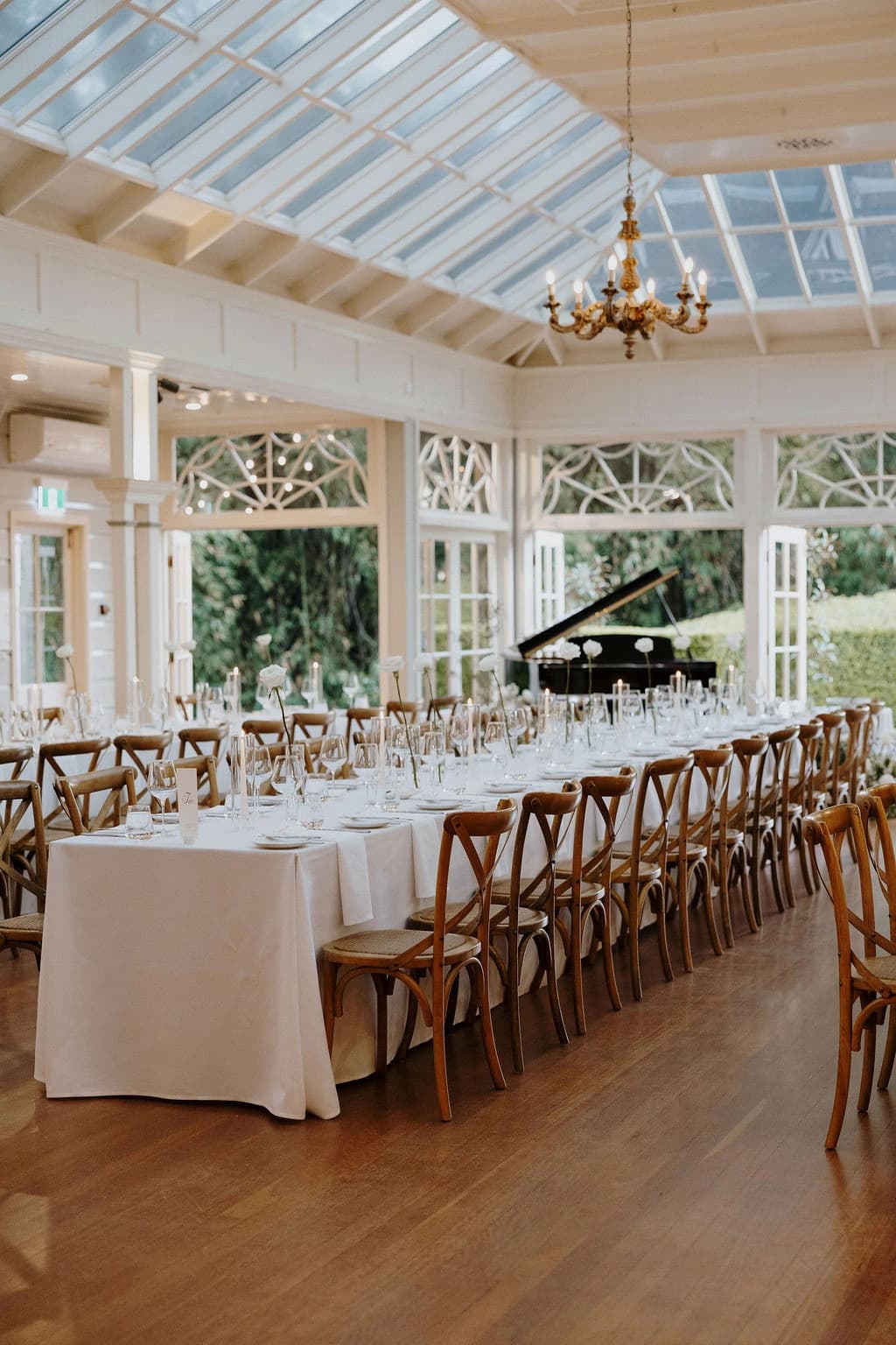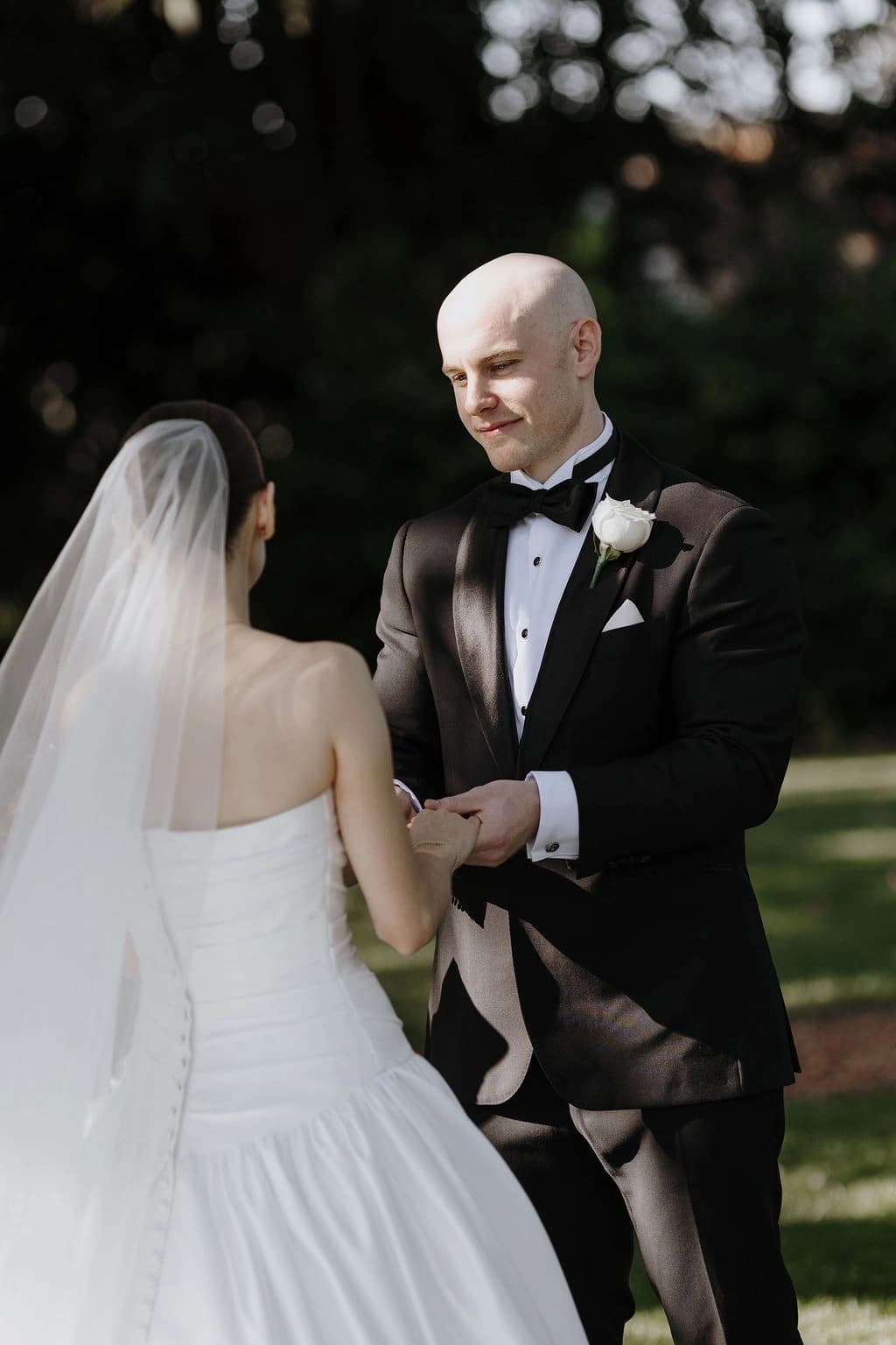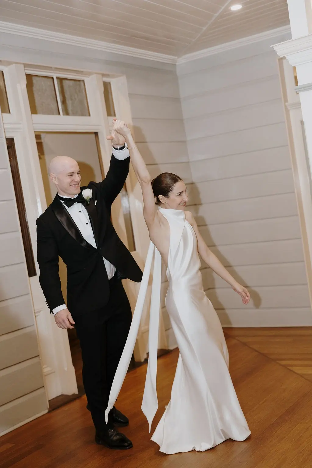 October light lingered gently across the Governor’s Lawn, soft and clear beneath the great fig trees. White roses and delphiniums framed the aisle, their petals shifting in the breeze while long ivory ribbons trailed from each chair, lifting softly as guests gathered. Her gown — a sculptural silk design with delicate ruching and a sweeping full skirt — moved with quiet grace, the fabric catching the light as she walked. He stood waiting in a black tuxedo and hand-tied bow, the scene poised in stillness. When vows were spoken, laughter and petals filled the air, a garden moment suspended in time. Later, the Conservatory was surrounded by blooms once more as candlelight gathered on the tables. She had changed into a sleek halter gown with long scarf ties that floated as they danced, the room warm with applause and the ease of celebration — a night that felt as graceful as it began.