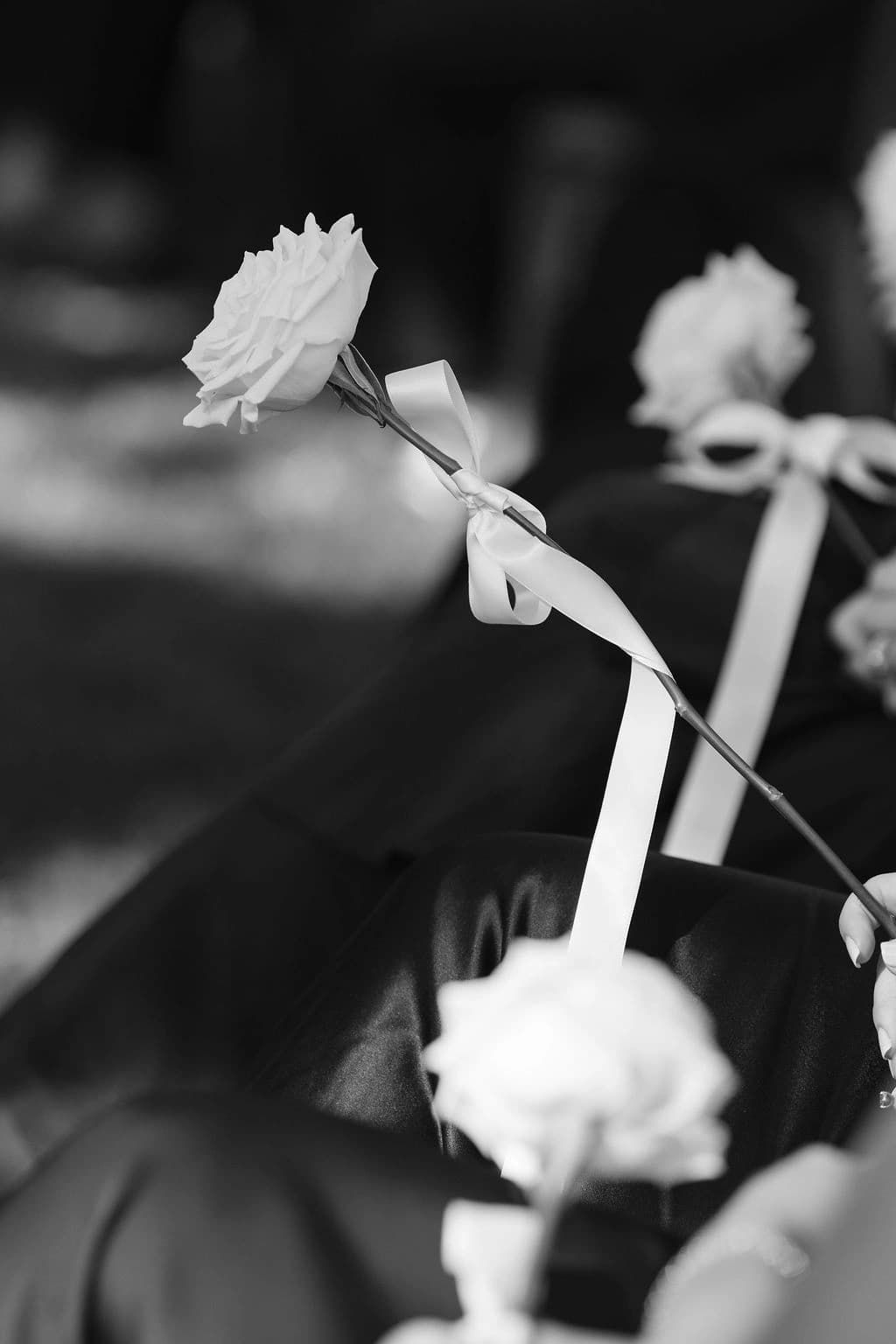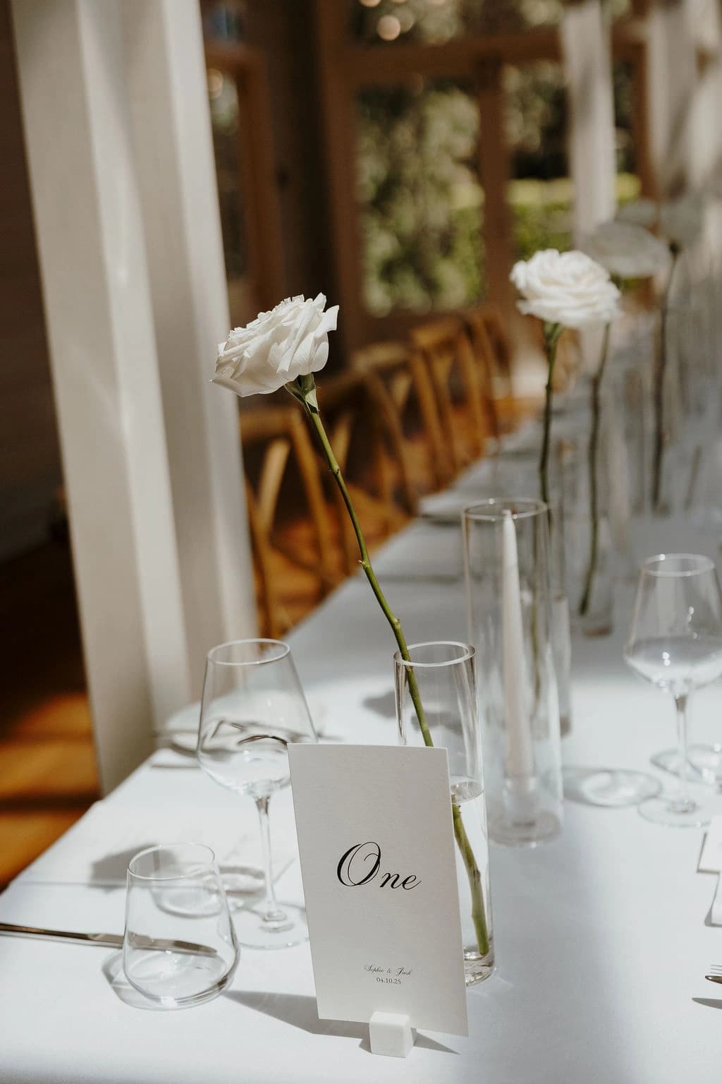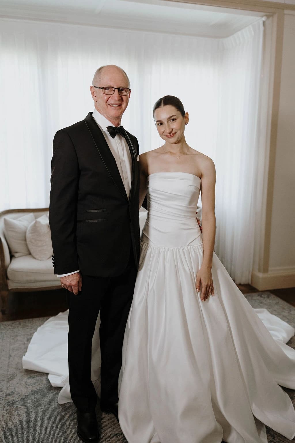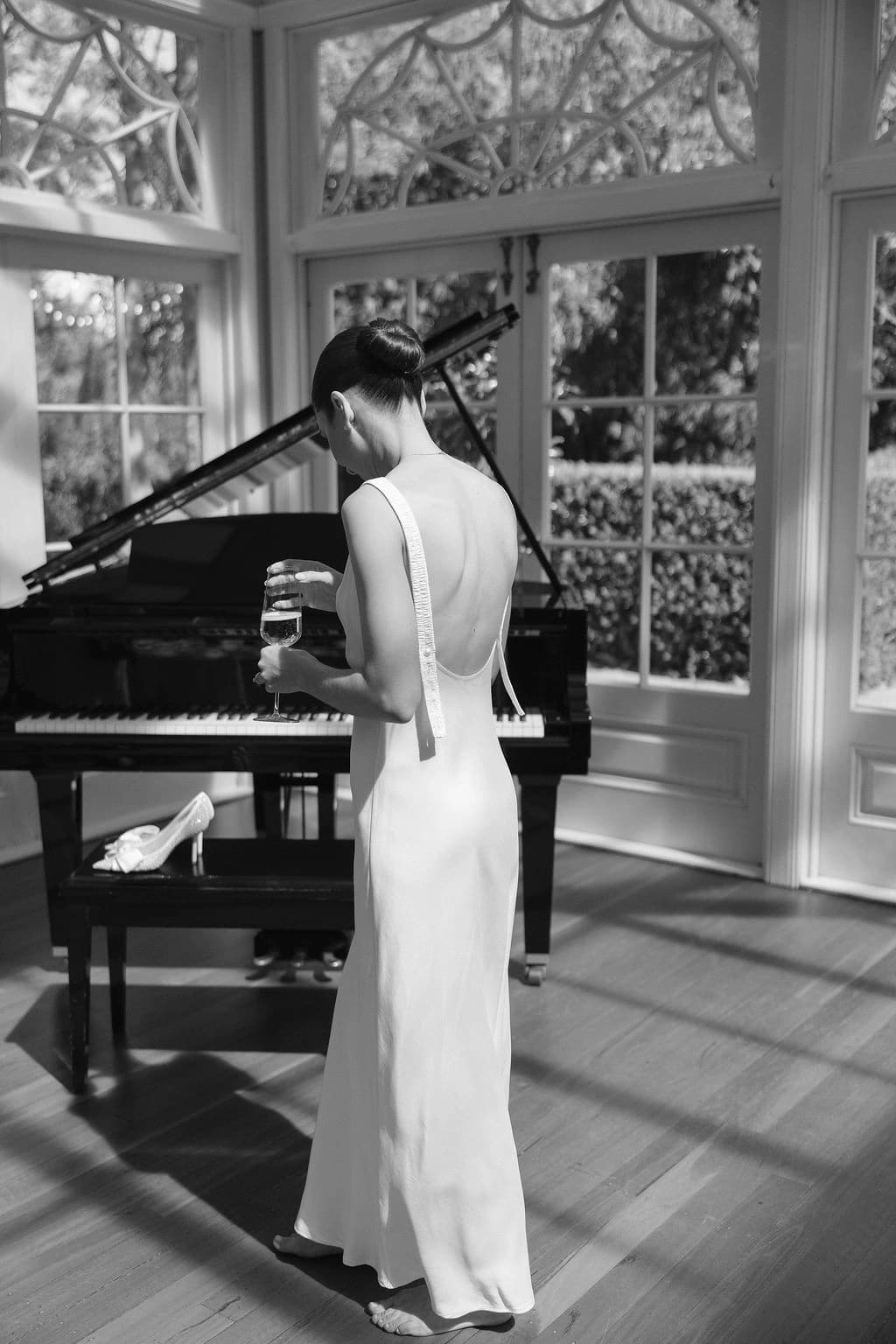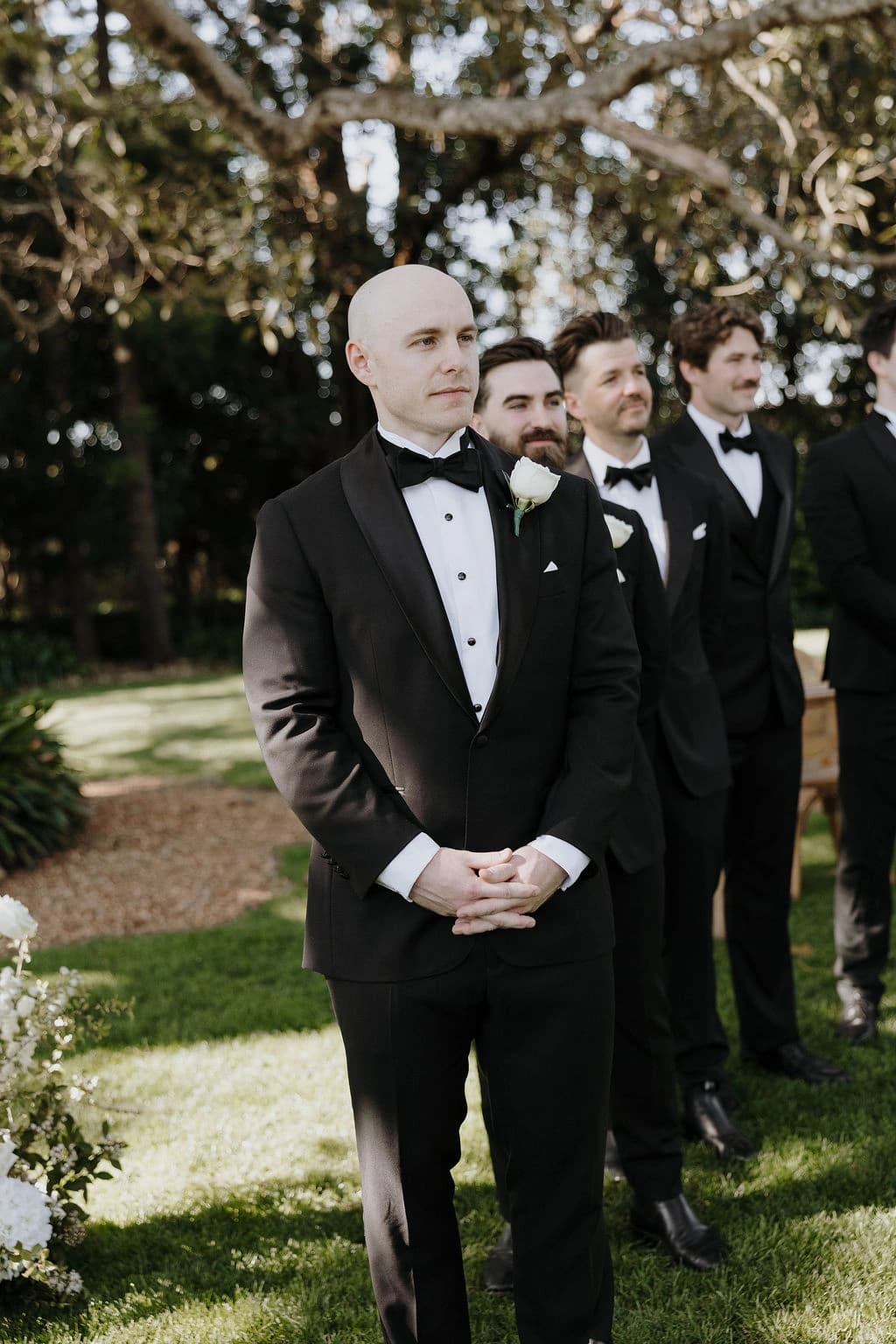 October light lingered gently across the Governor’s Lawn, soft and clear beneath the great fig trees. White roses and delphiniums framed the aisle, their petals shifting in the breeze while long ivory ribbons trailed from each chair, lifting softly as guests gathered. Her gown — a sculptural silk design with delicate ruching and a sweeping full skirt — moved with quiet grace, the fabric catching the light as she walked. He stood waiting in a black tuxedo and hand-tied bow, the scene poised in stillness. When vows were spoken, laughter and petals filled the air, a garden moment suspended in time. Later, the Conservatory was surrounded by blooms once more as candlelight gathered on the tables. She had changed into a sleek halter gown with long scarf ties that floated as they danced, the room warm with applause and the ease of celebration — a night that felt as graceful as it began.