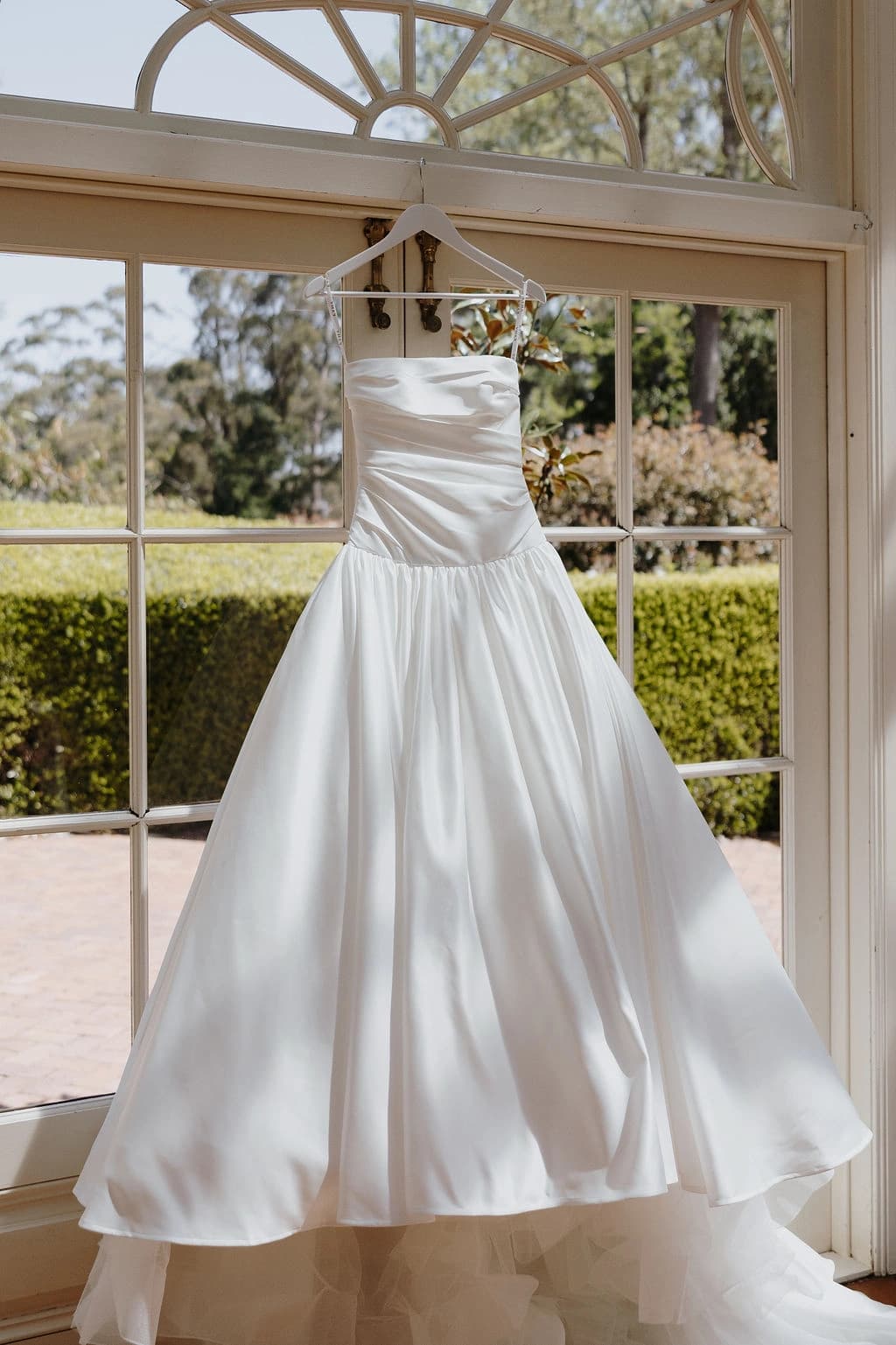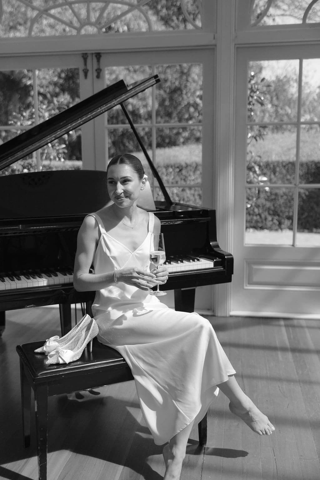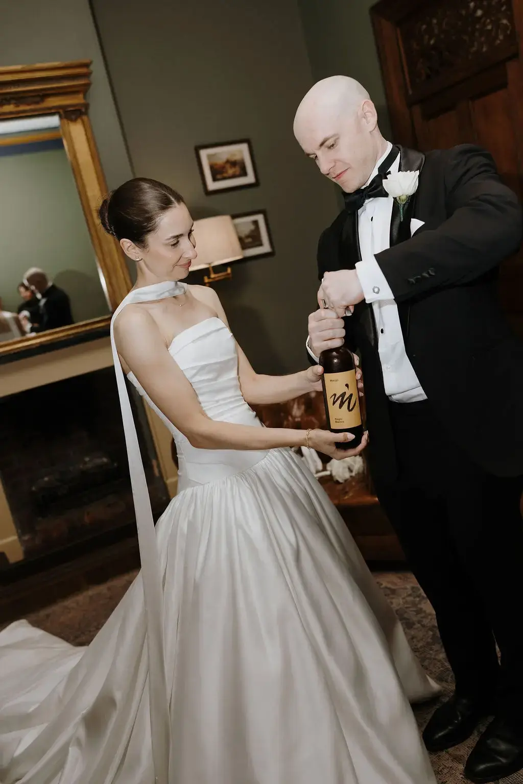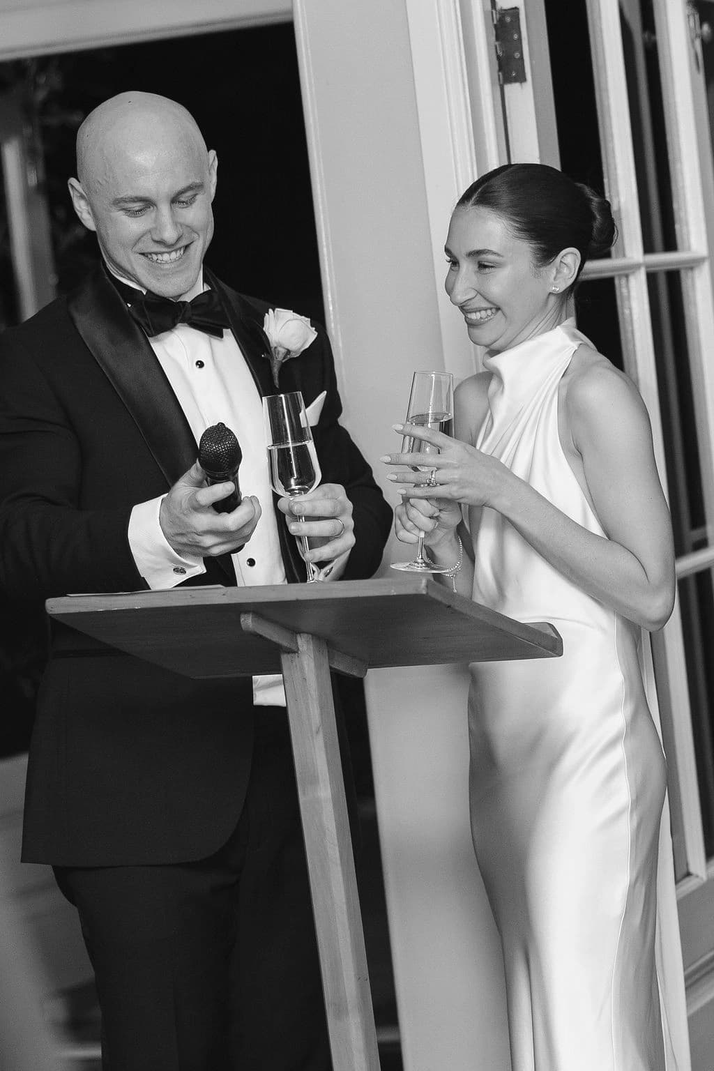 October light lingered gently across the Governor’s Lawn, soft and clear beneath the great fig trees. White roses and delphiniums framed the aisle, their petals shifting in the breeze while long ivory ribbons trailed from each chair, lifting softly as guests gathered. Her gown — a sculptural silk design with delicate ruching and a sweeping full skirt — moved with quiet grace, the fabric catching the light as she walked. He stood waiting in a black tuxedo and hand-tied bow, the scene poised in stillness. When vows were spoken, laughter and petals filled the air, a garden moment suspended in time. Later, the Conservatory was surrounded by blooms once more as candlelight gathered on the tables. She had changed into a sleek halter gown with long scarf ties that floated as they danced, the room warm with applause and the ease of celebration — a night that felt as graceful as it began.