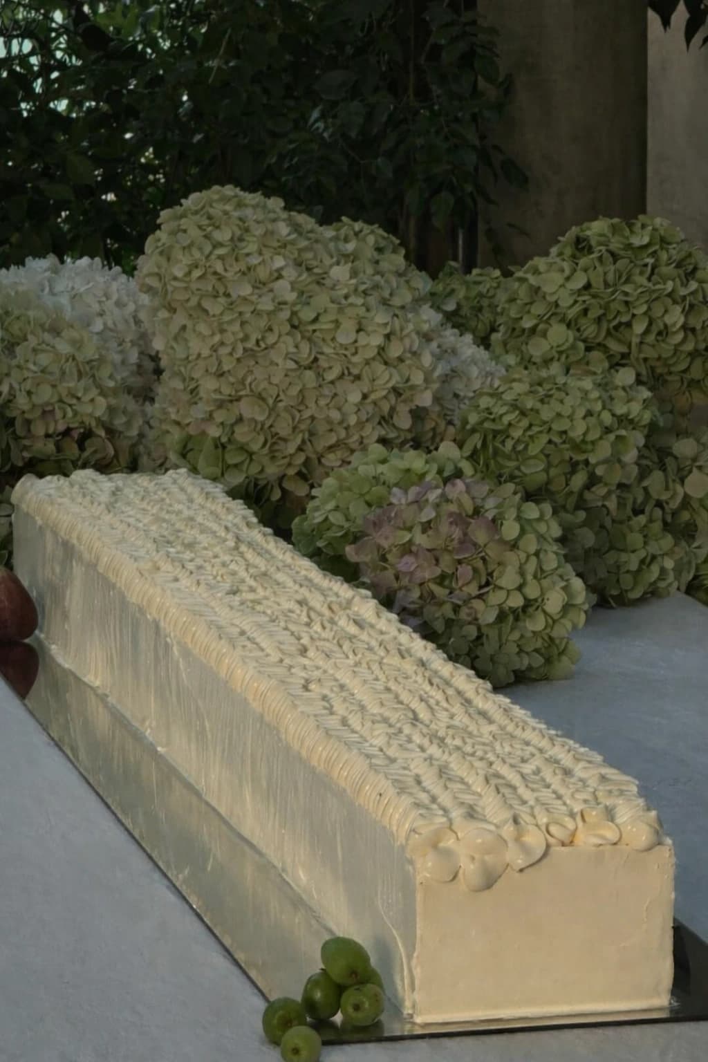 Where a round cake demands symmetry and a tiered cake commands verticality, the long horizontal form of a slab invites something more painterly. Baroque sugar work cascades across the surface in uninterrupted sweeps. Fresh blooms — ranunculus, hydrangea, spray roses — can be arranged in deliberate, asymmetric abundance, spilling from one end like a garden in mid-exhale. Freeze-dried raspberries and whole cherries scatter across snowy white frosting with the studied nonchalance of a still life. The format rewards ambition. It does not ask you to work in the round.