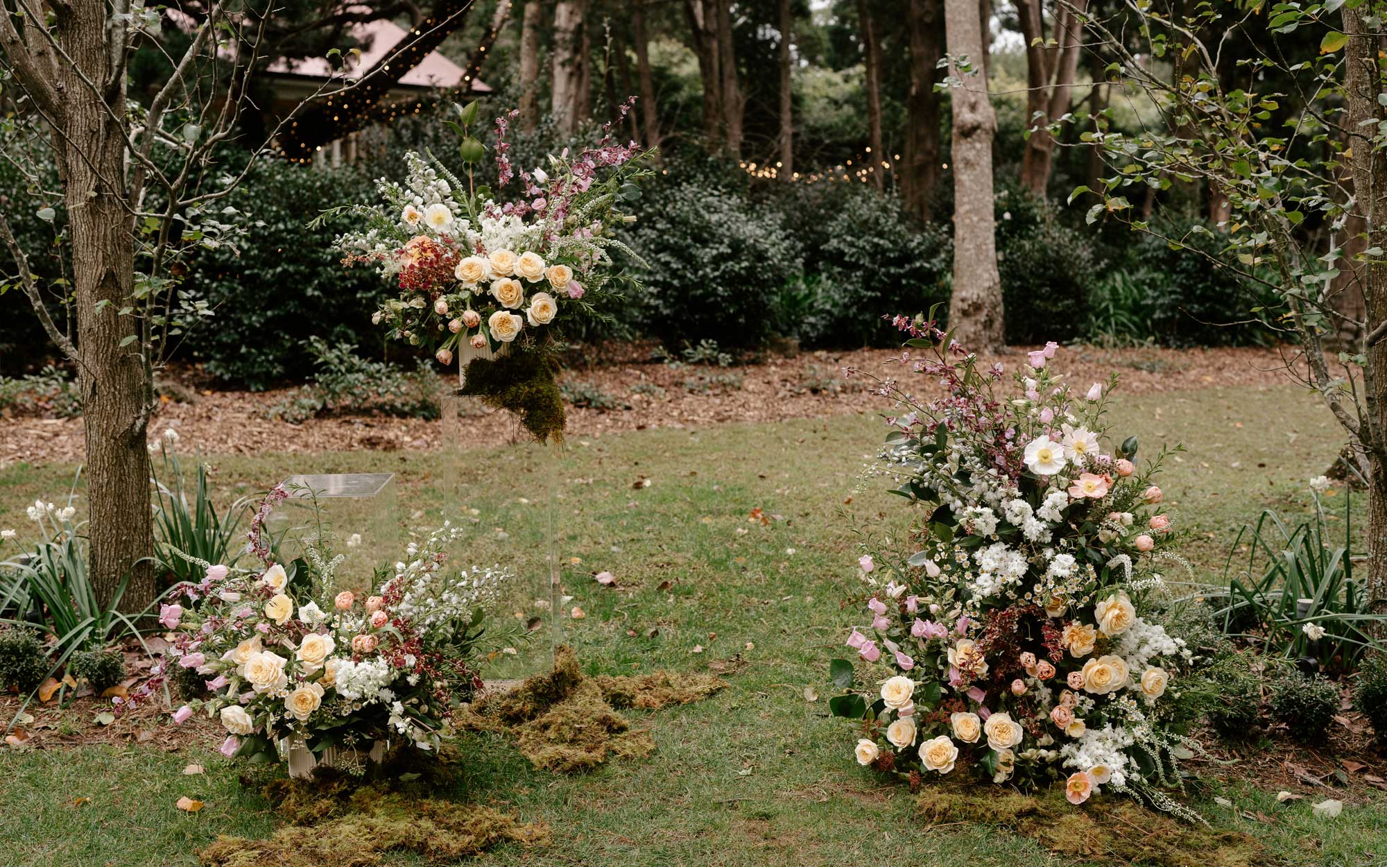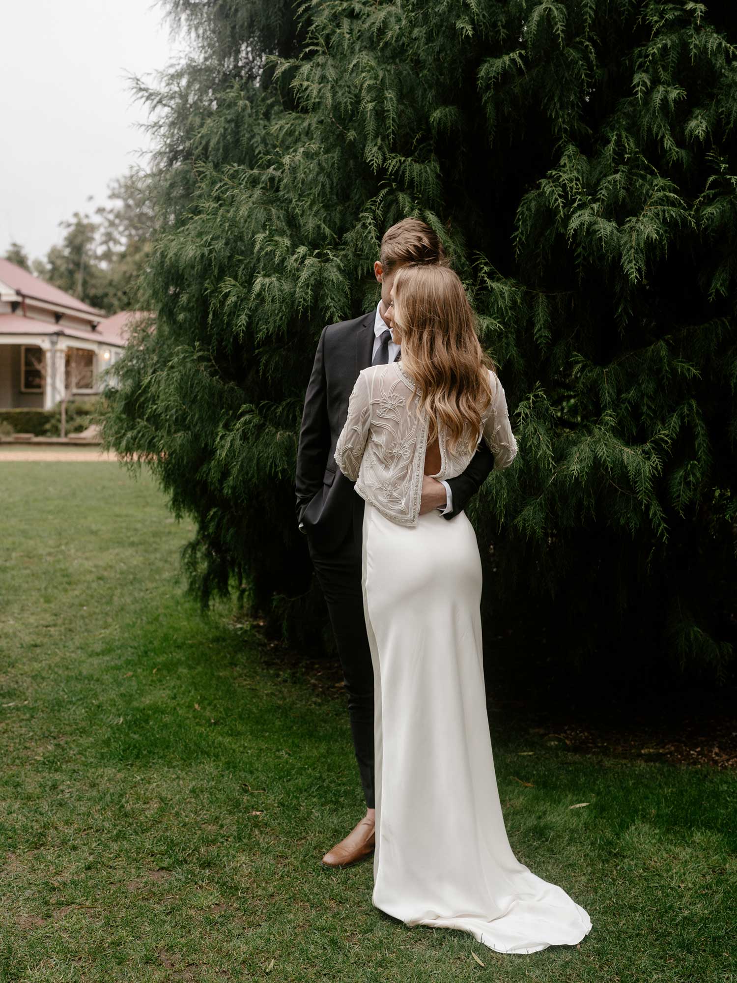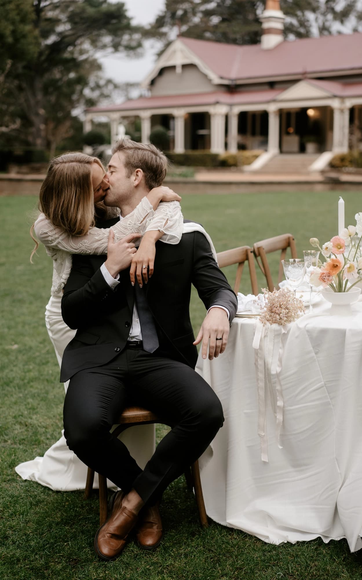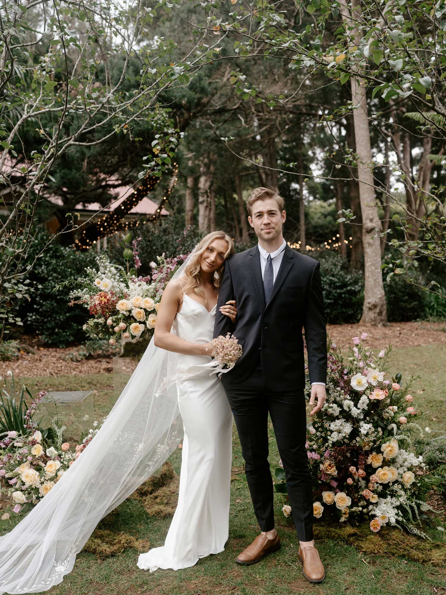 For their whimsical and romantic photoshoot, Trent and Jessie artfully shifted the focal point to the left of the majestic Himalayan Cedar, where they embraced the pear trees' natural arbour. This choice created a serene and picturesque backdrop that perfectly highlighted the stunning seasonal floral arrangements by talented Brisbane florist, Maddie Jayde Floral Designs, allowing this stunning feature to blend harmoniously with the surroundings.