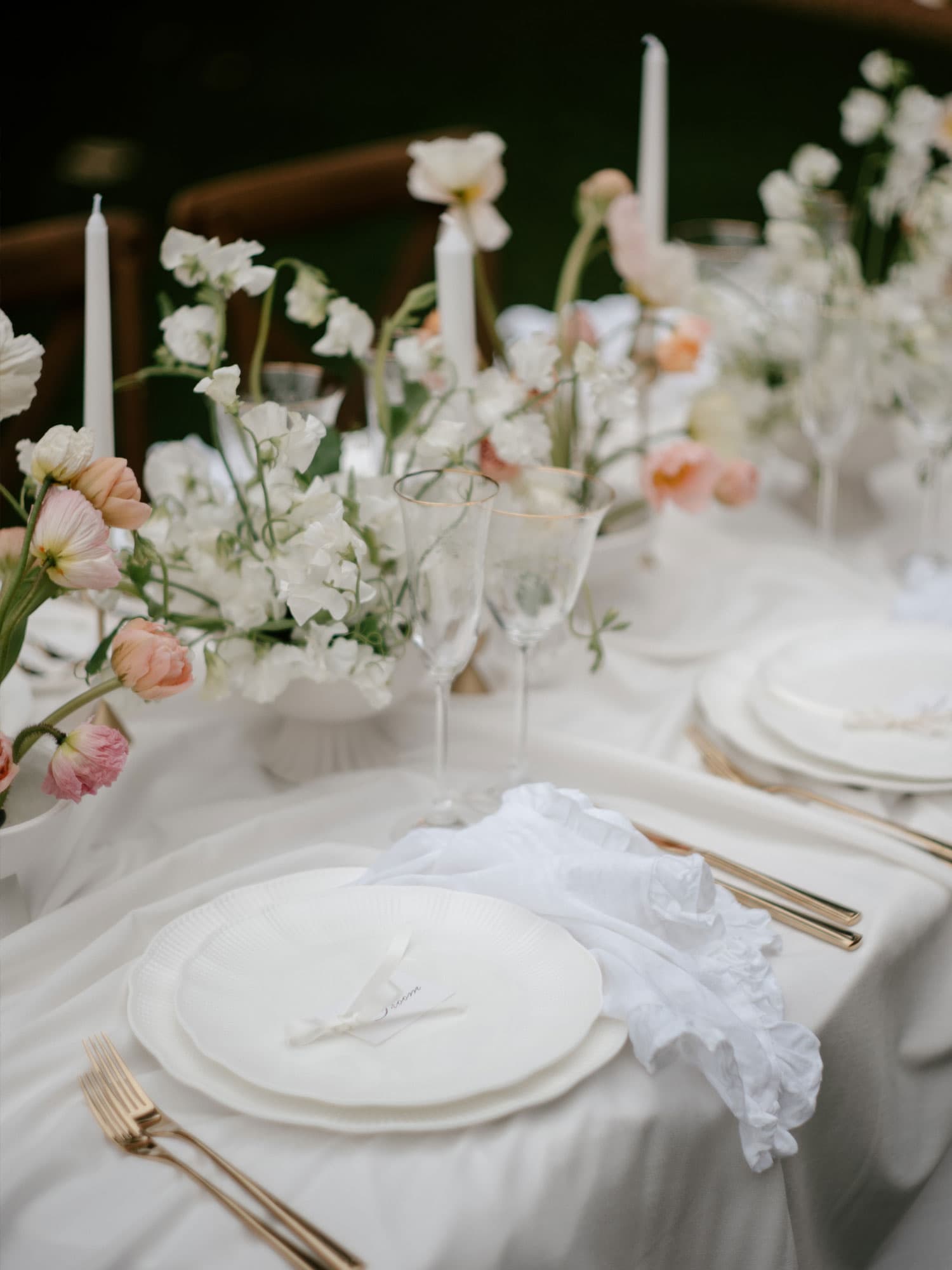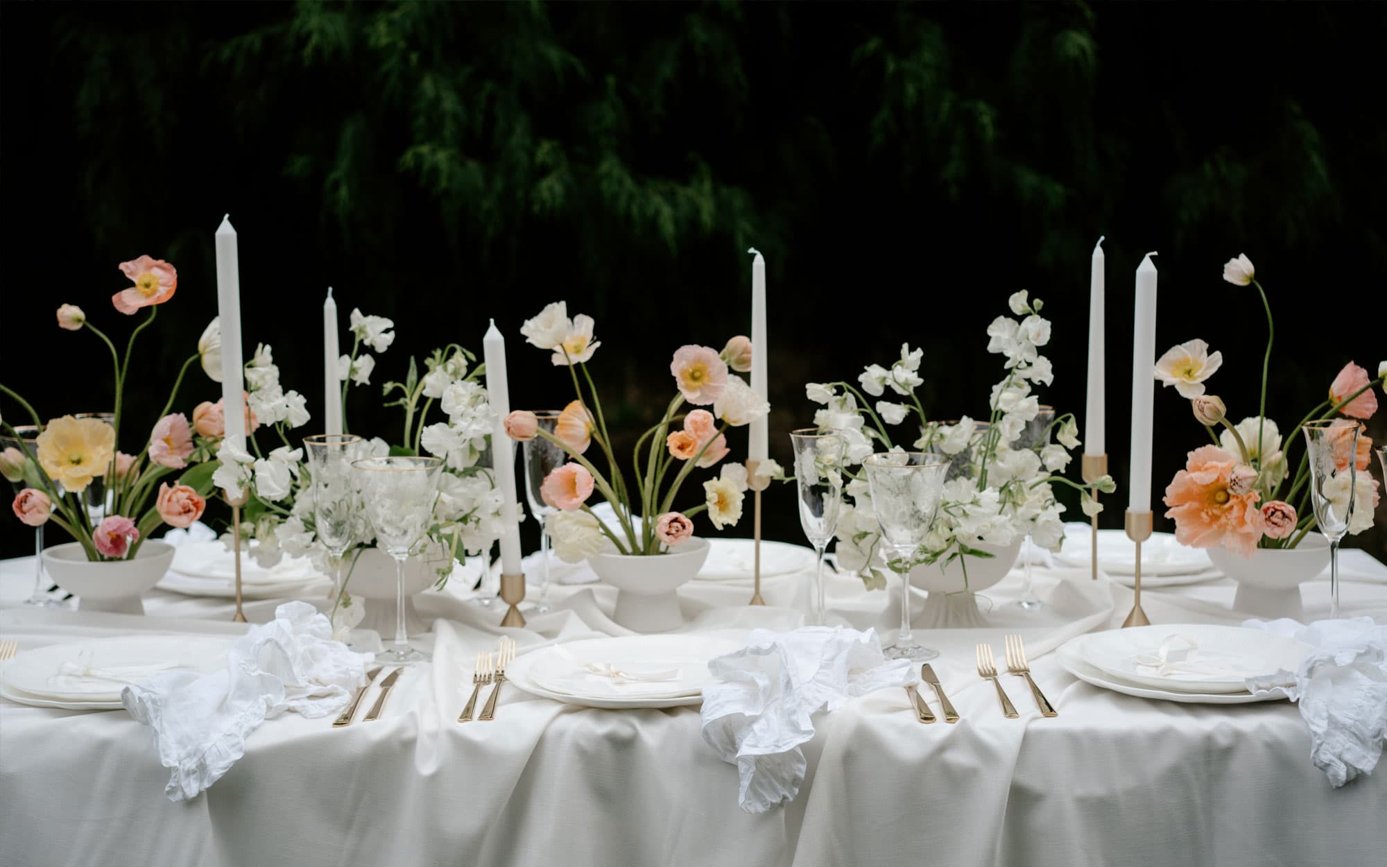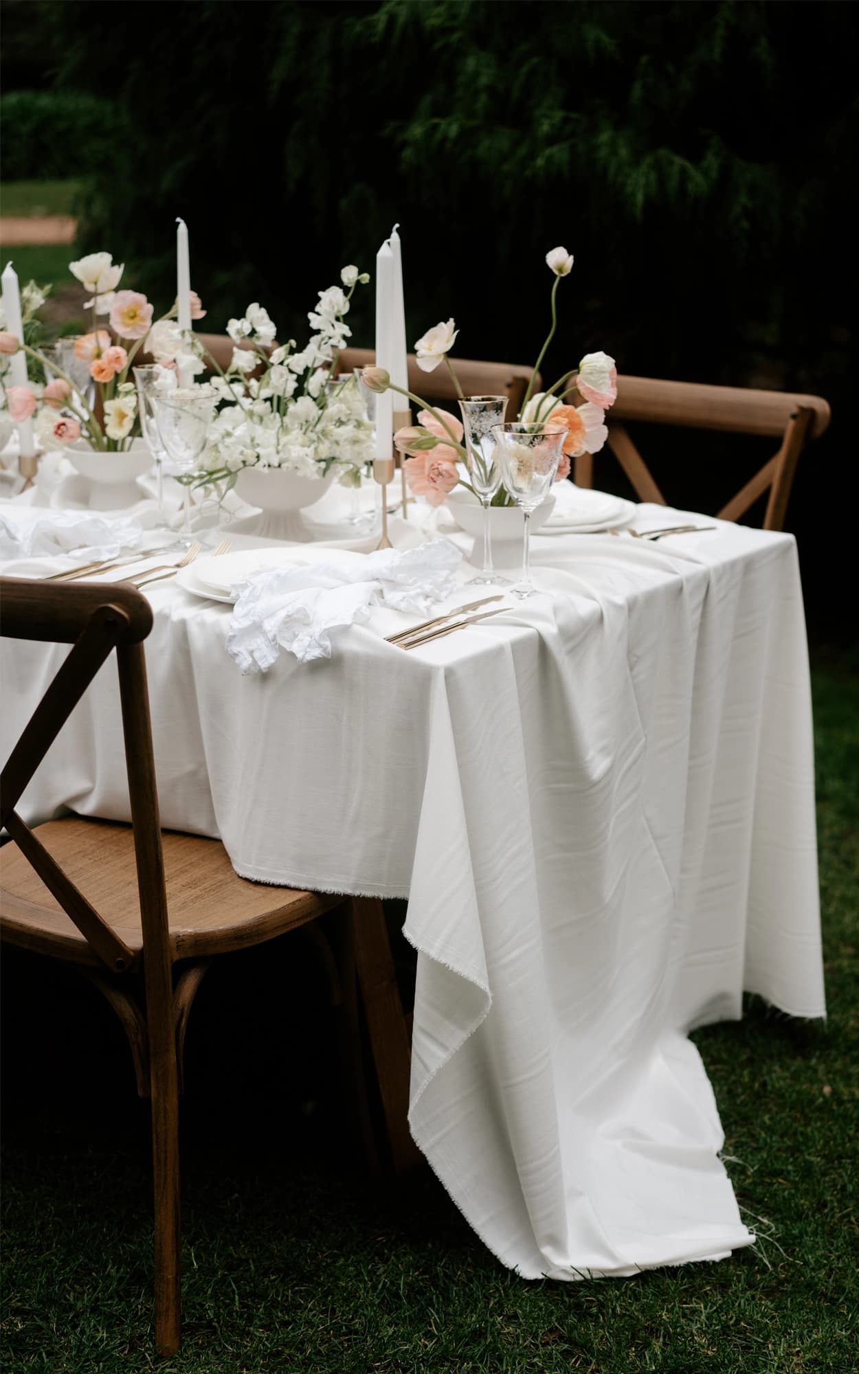 The creative team behind this romantic editorial photoshoot drew inspiration from a European garden party, arranging the banquet tables on our lush, sprawling lawns , framed beautifully by the majestic fir tree to the west and the historic homestead to the south. Atop crisp white linen, Elle & Co. curated an elegant mix of delicately textured fine bone china with scalloped edges from Table For Louis, complemented by soft gold cutlery. Sweet arrangements of poppies brought bursts of soft pastel hues, infusing a playful touch into the overall design.