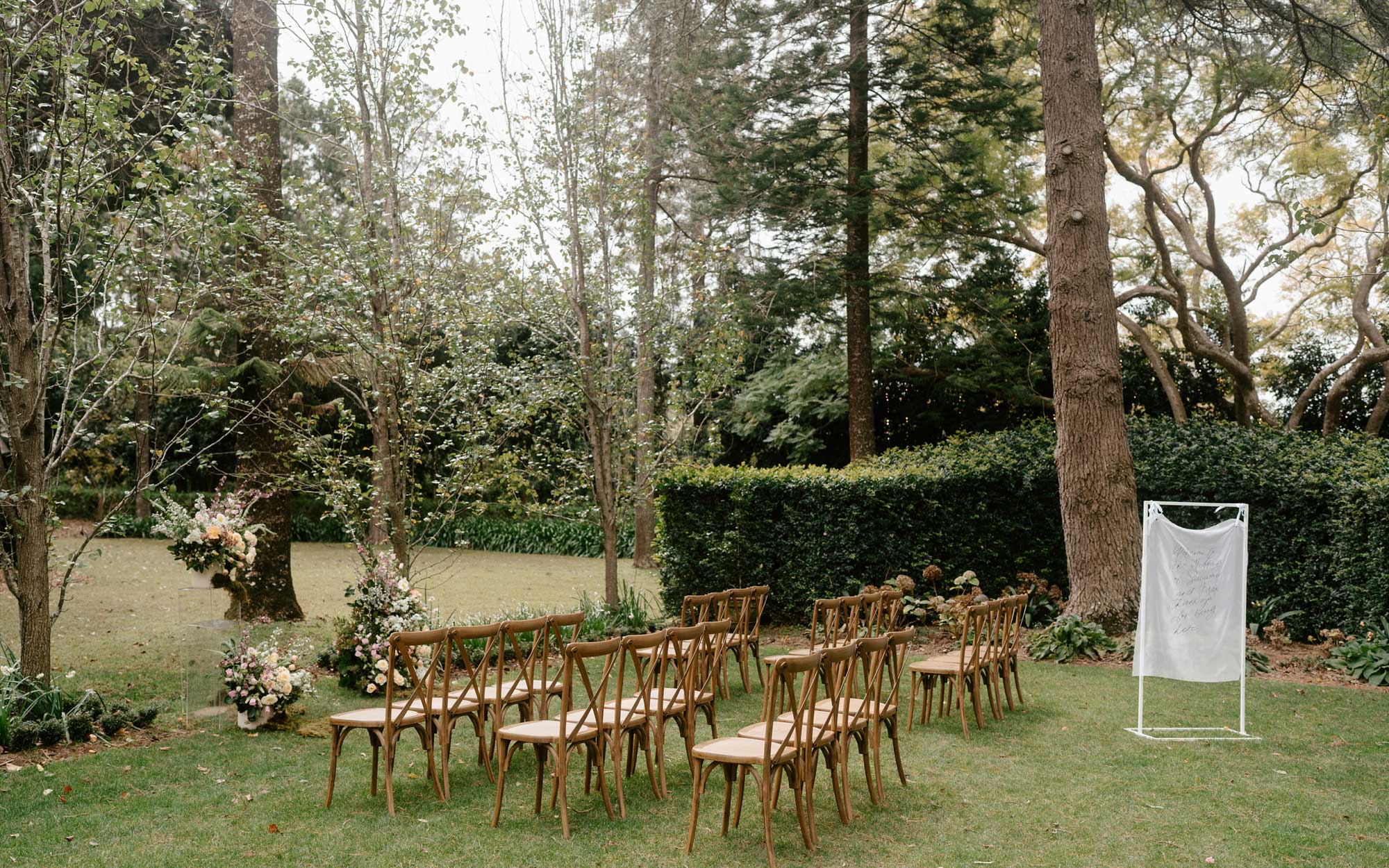 The Cedar Lawn is one of four beatuiful ceremony locations at Gabbinbar and is the perfect choice for couples wanting to make the most of their floral decorations while embracing a backdrop filled with natural greenery that creates a forest-like feeling. This tranquil area provides a majestic Himalayan cedar tree at the northern aspect and is framed by ornamental pear trees and a precision-cut orange jasmine hedge.