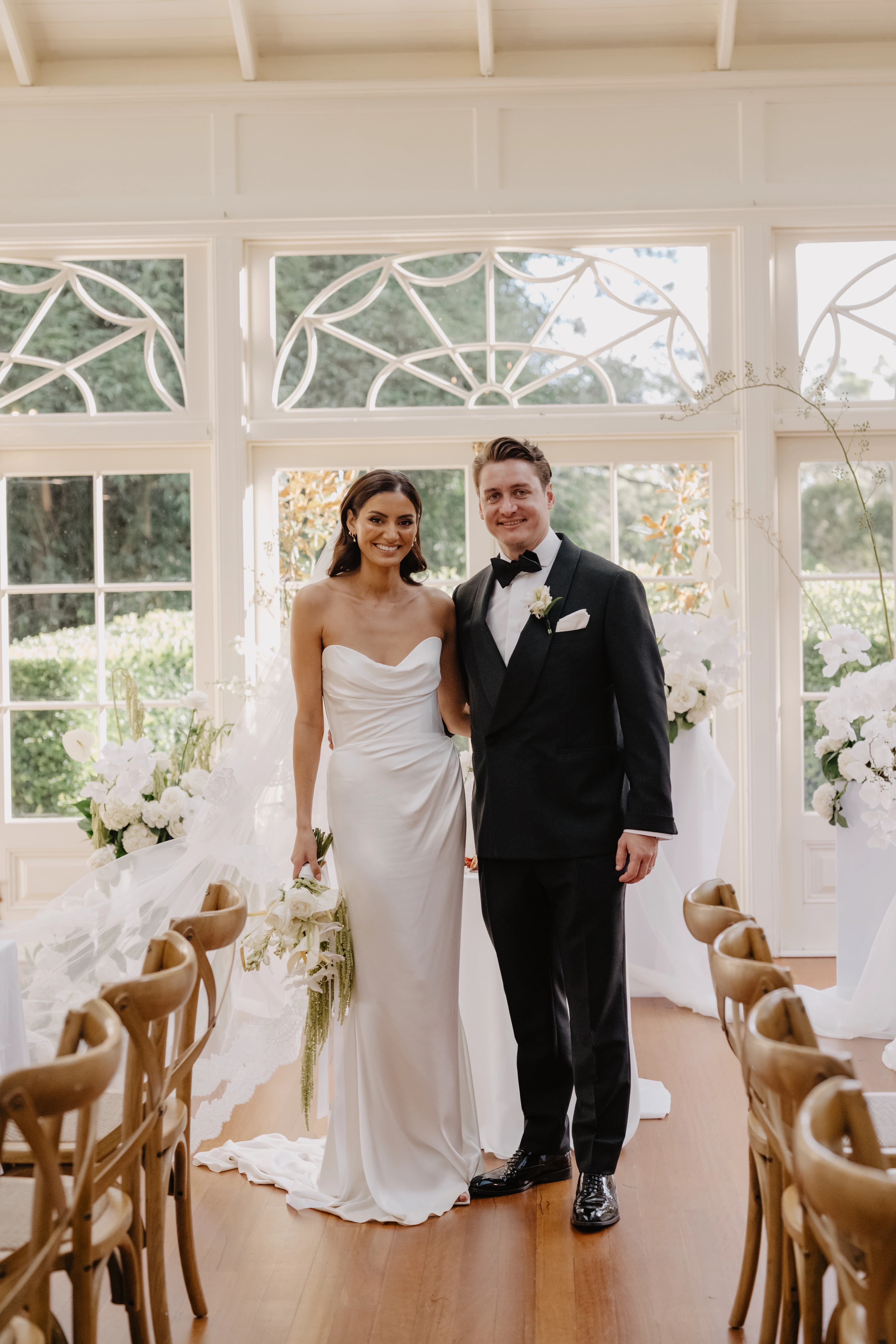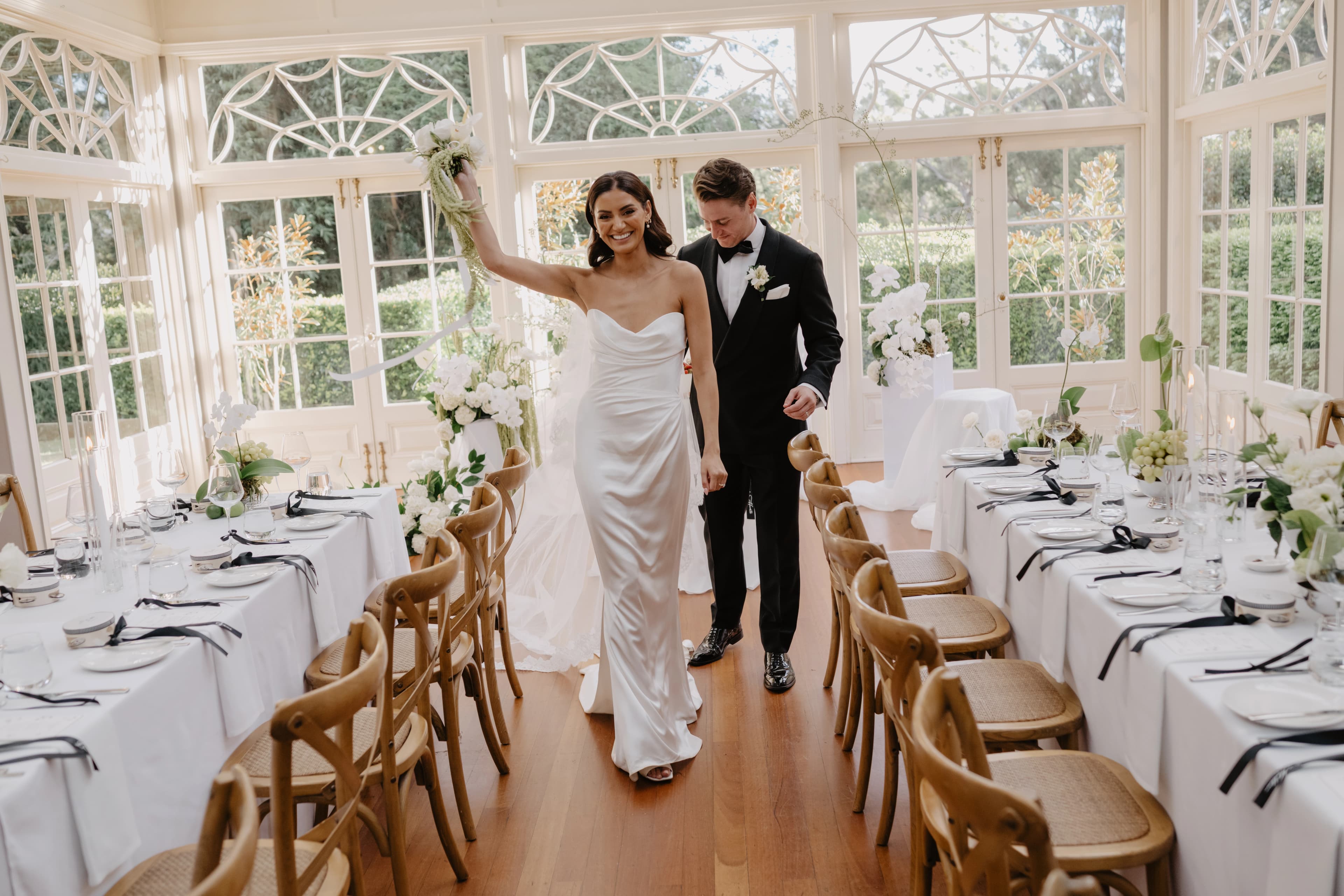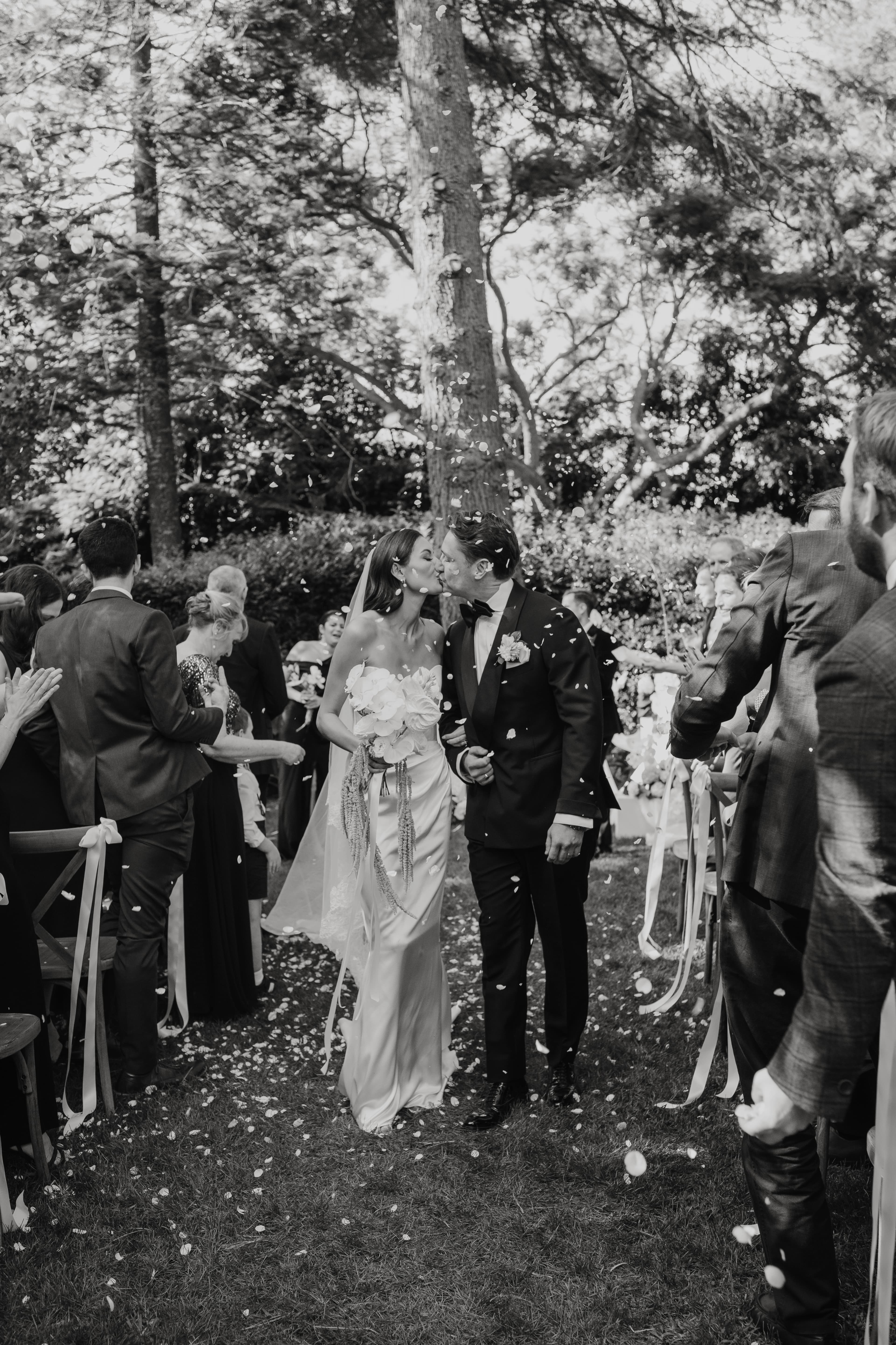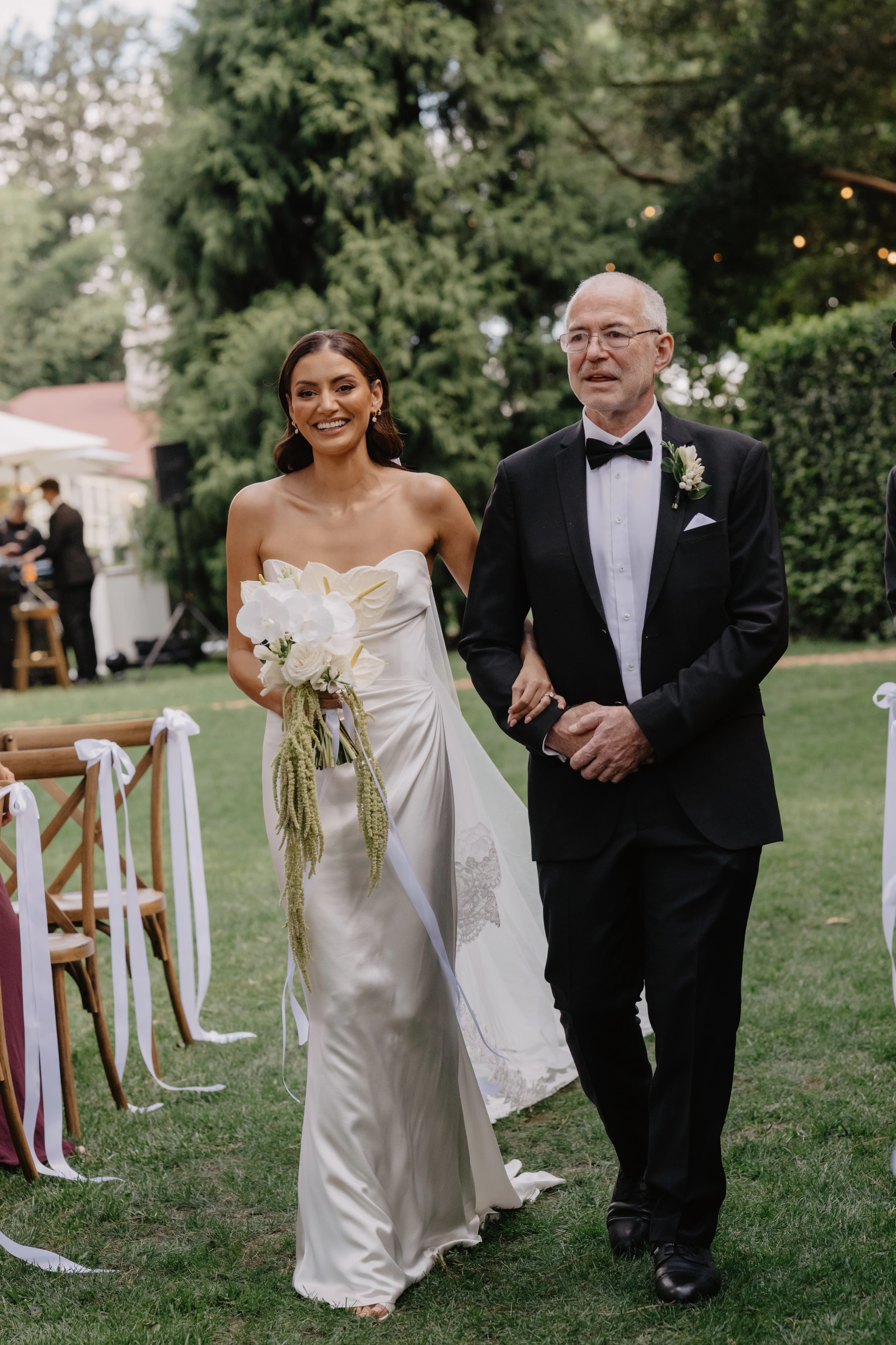 She entered with her father, her satin gown moving in liquid lines, veil edged in lace like fine engraving against air. The cedar stood before them as a sentinel, its branches folding into silence while orchids, garden roses and hydrangea gathered with greenery at its base — not as decoration but as offering, as though the garden itself leaned in to witness. White ribbons traced the aisle like streams of light, guiding guests into stillness as vows rose softly into the afternoon air. At the reception, the sense of intention carried through — pears nestled among florals, glassware tied with black ribbons etched in playful symbols and menus adorned with hand-drawn detail. Each table felt both refined and alive, blending elegance with personality. As candlelight gathered the evening close, the celebration seemed to distil into presence — luminous, grounded and enduring.