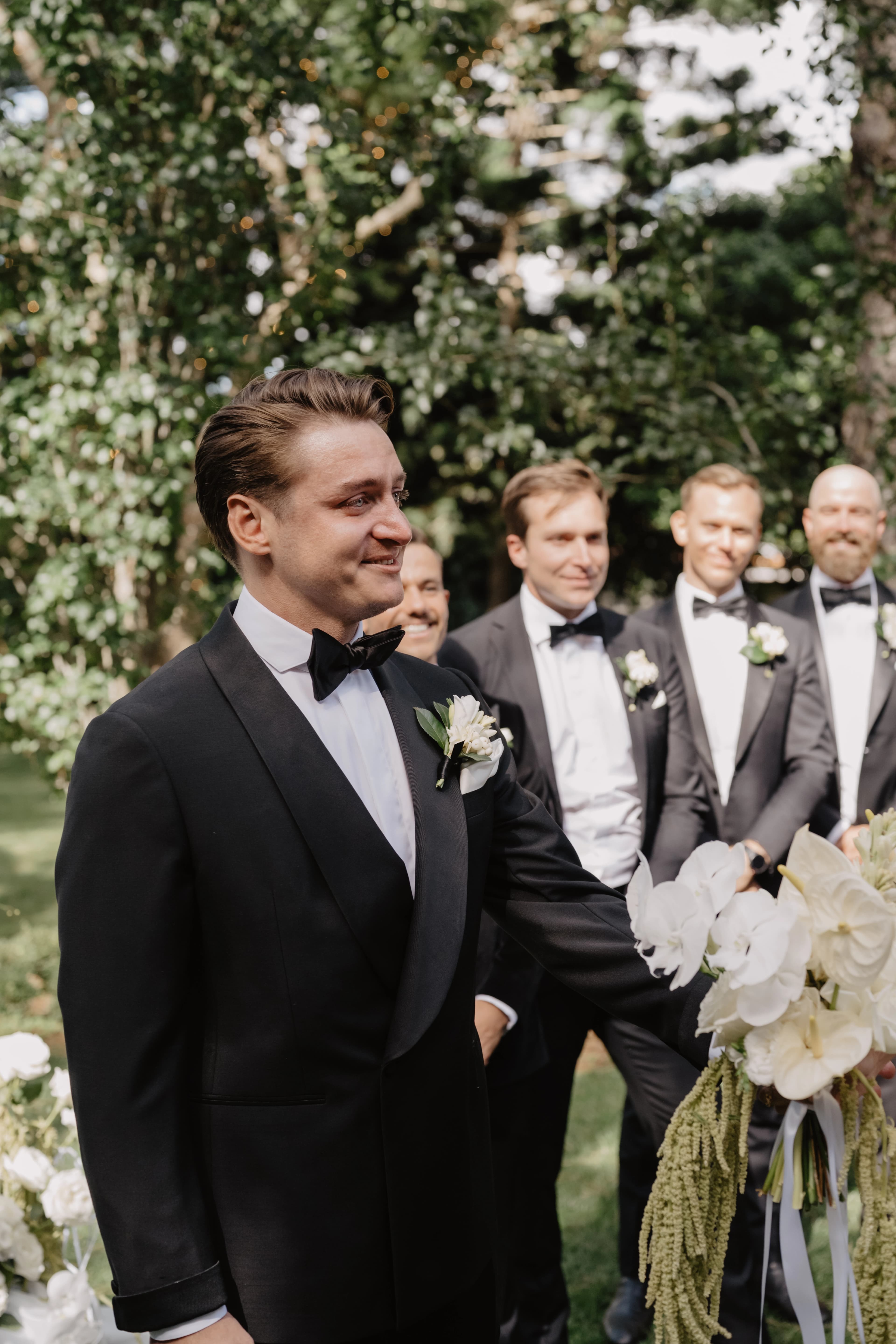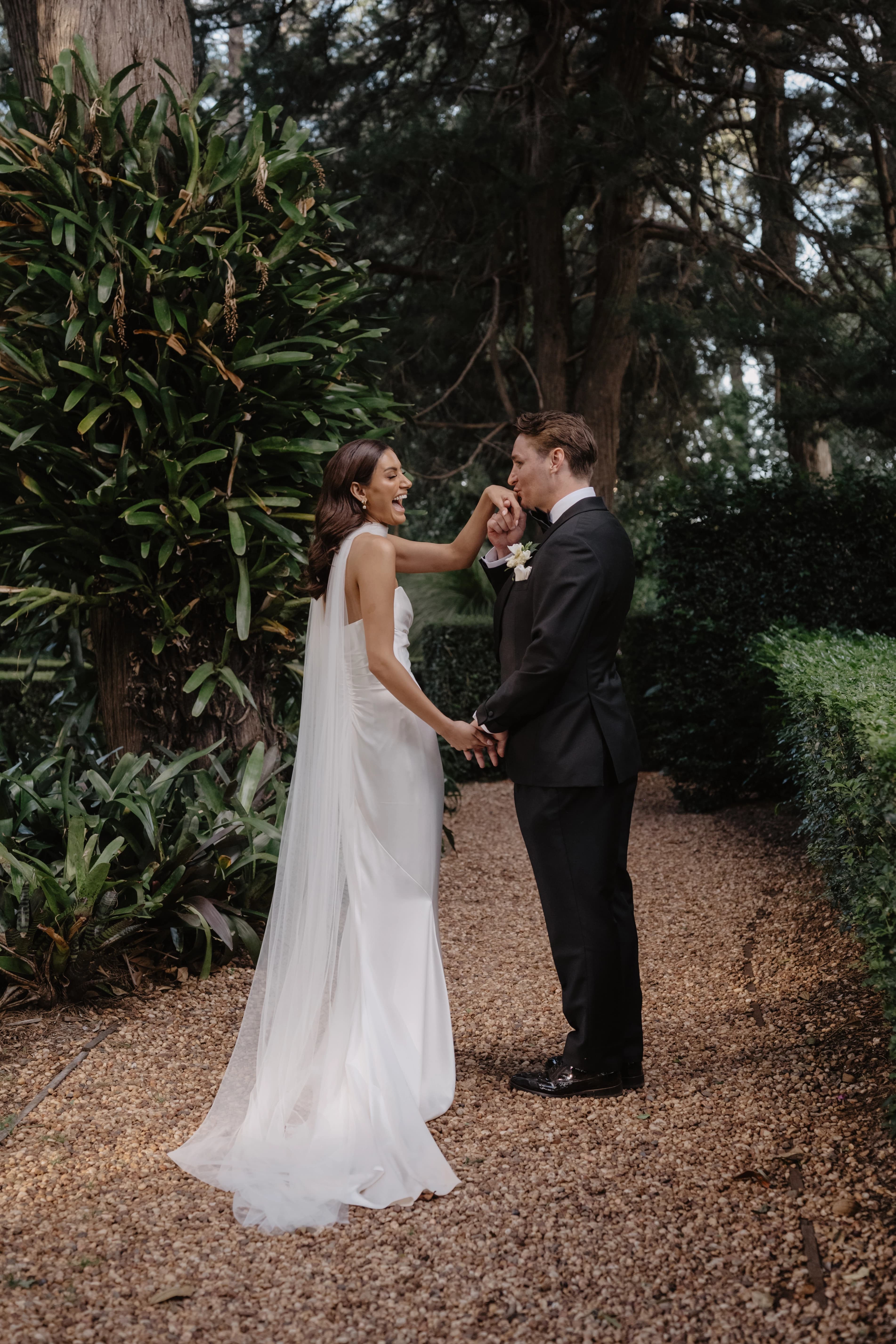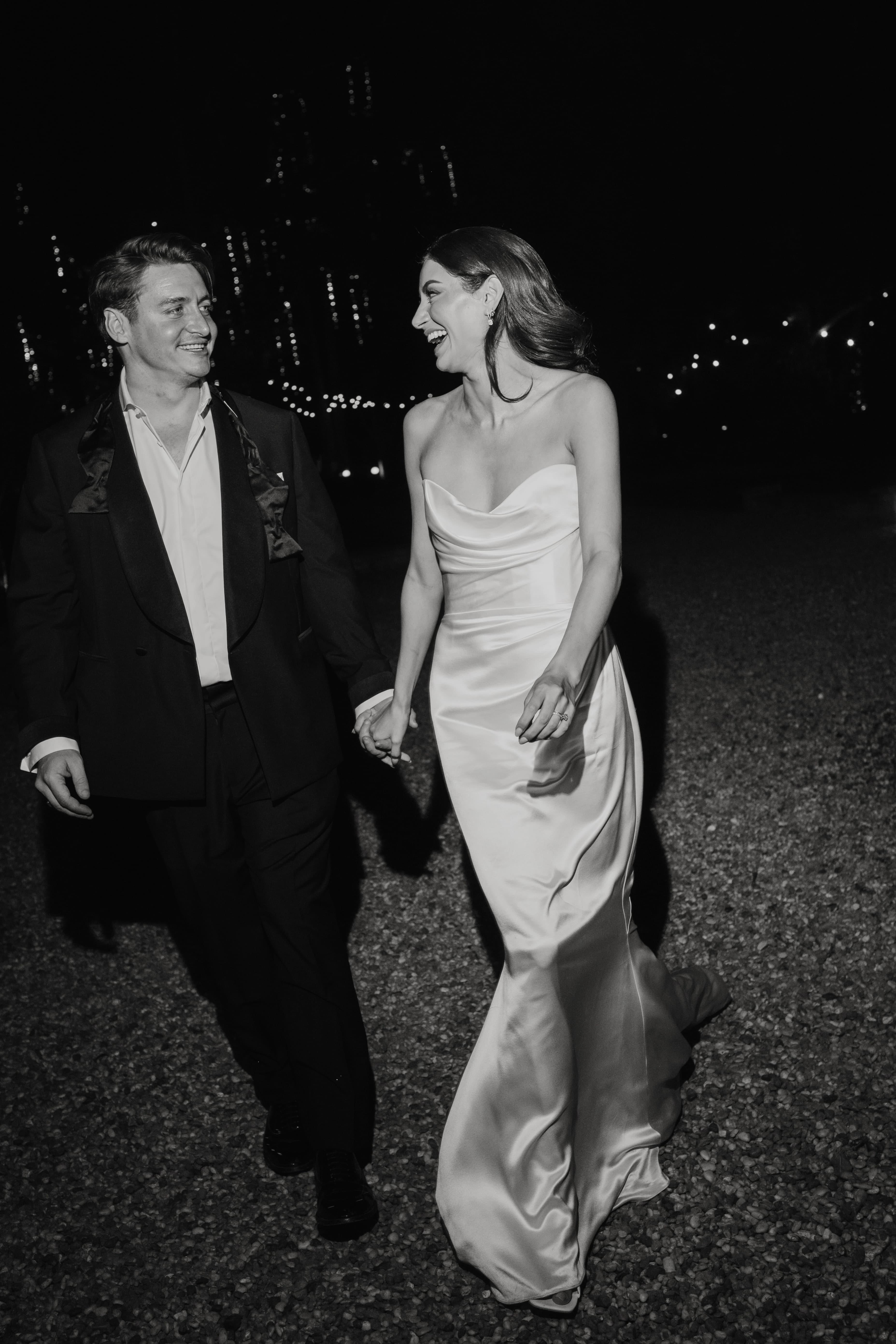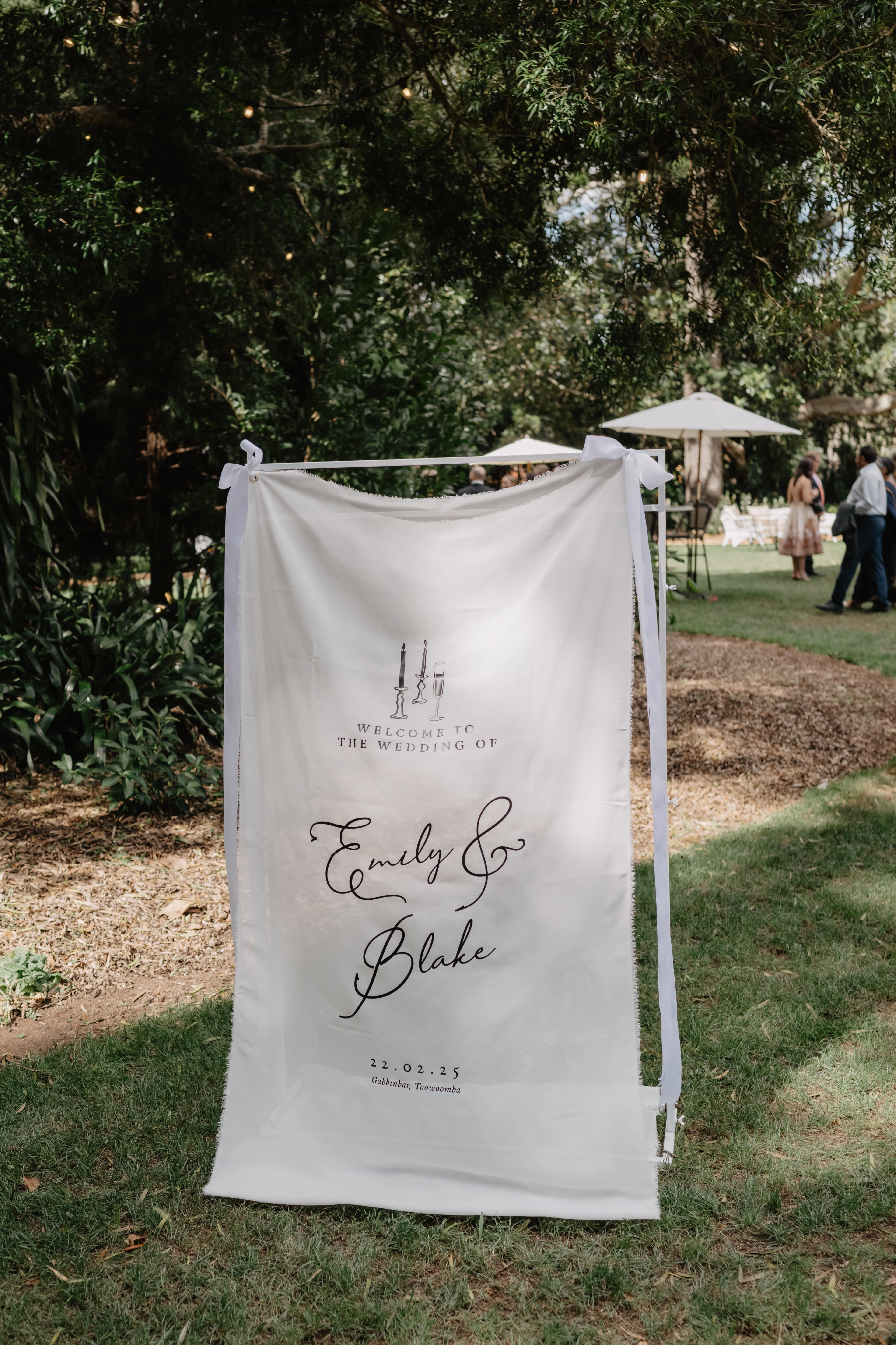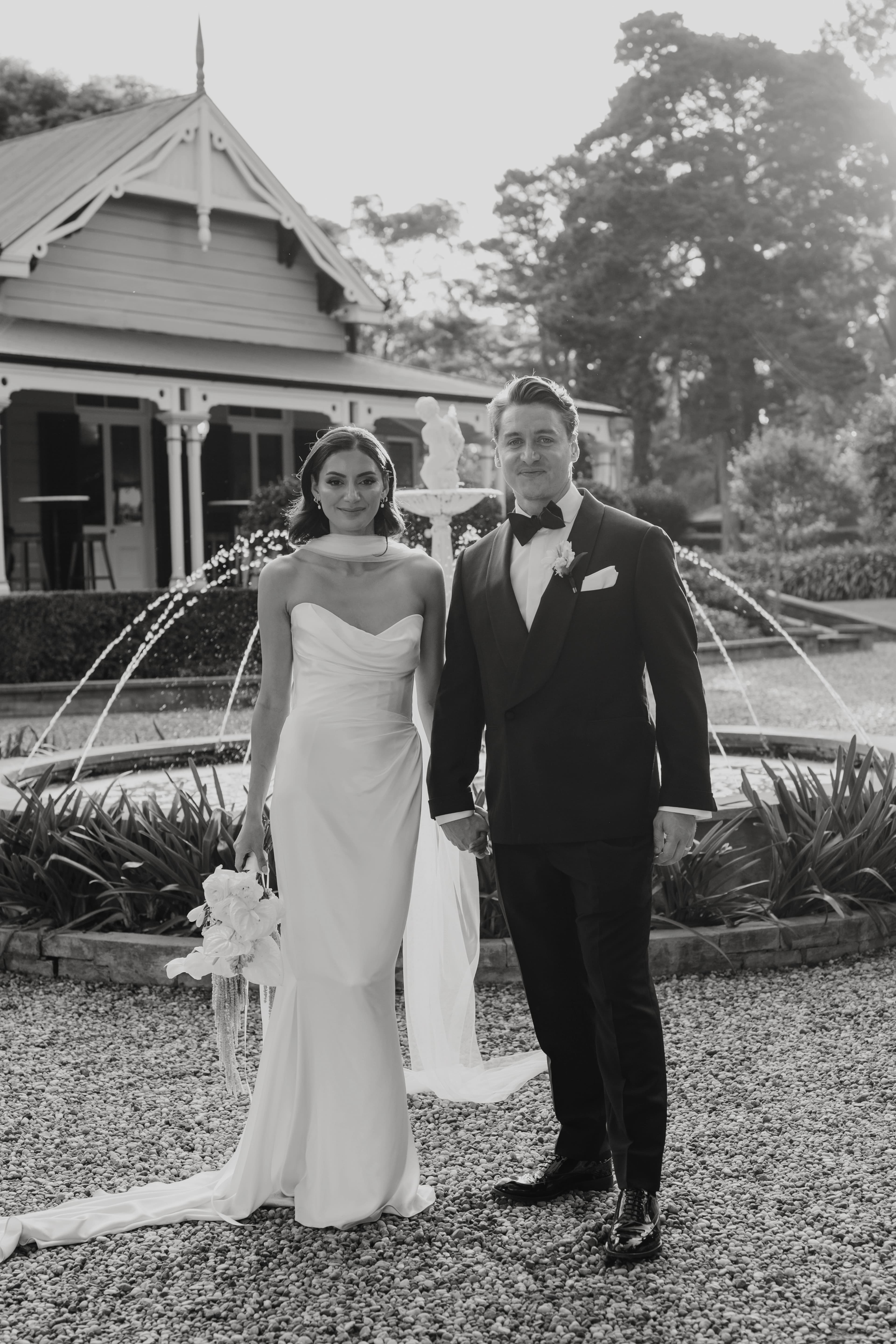 She entered with her father, her satin gown moving in liquid lines, veil edged in lace like fine engraving against air. The cedar stood before them as a sentinel, its branches folding into silence while orchids, garden roses and hydrangea gathered with greenery at its base — not as decoration but as offering, as though the garden itself leaned in to witness. White ribbons traced the aisle like streams of light, guiding guests into stillness as vows rose softly into the afternoon air. At the reception, the sense of intention carried through — pears nestled among florals, glassware tied with black ribbons etched in playful symbols and menus adorned with hand-drawn detail. Each table felt both refined and alive, blending elegance with personality. As candlelight gathered the evening close, the celebration seemed to distil into presence — luminous, grounded and enduring.