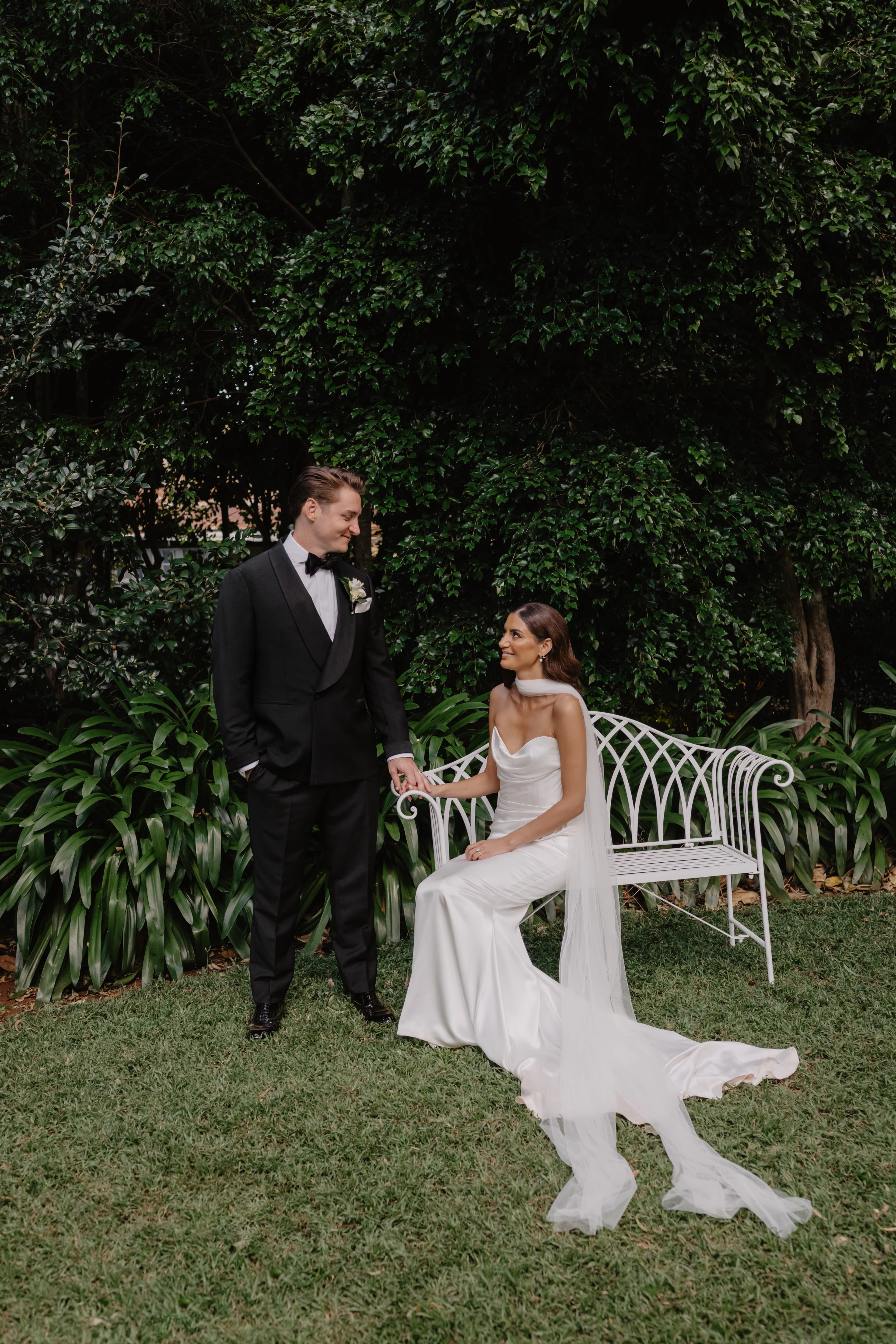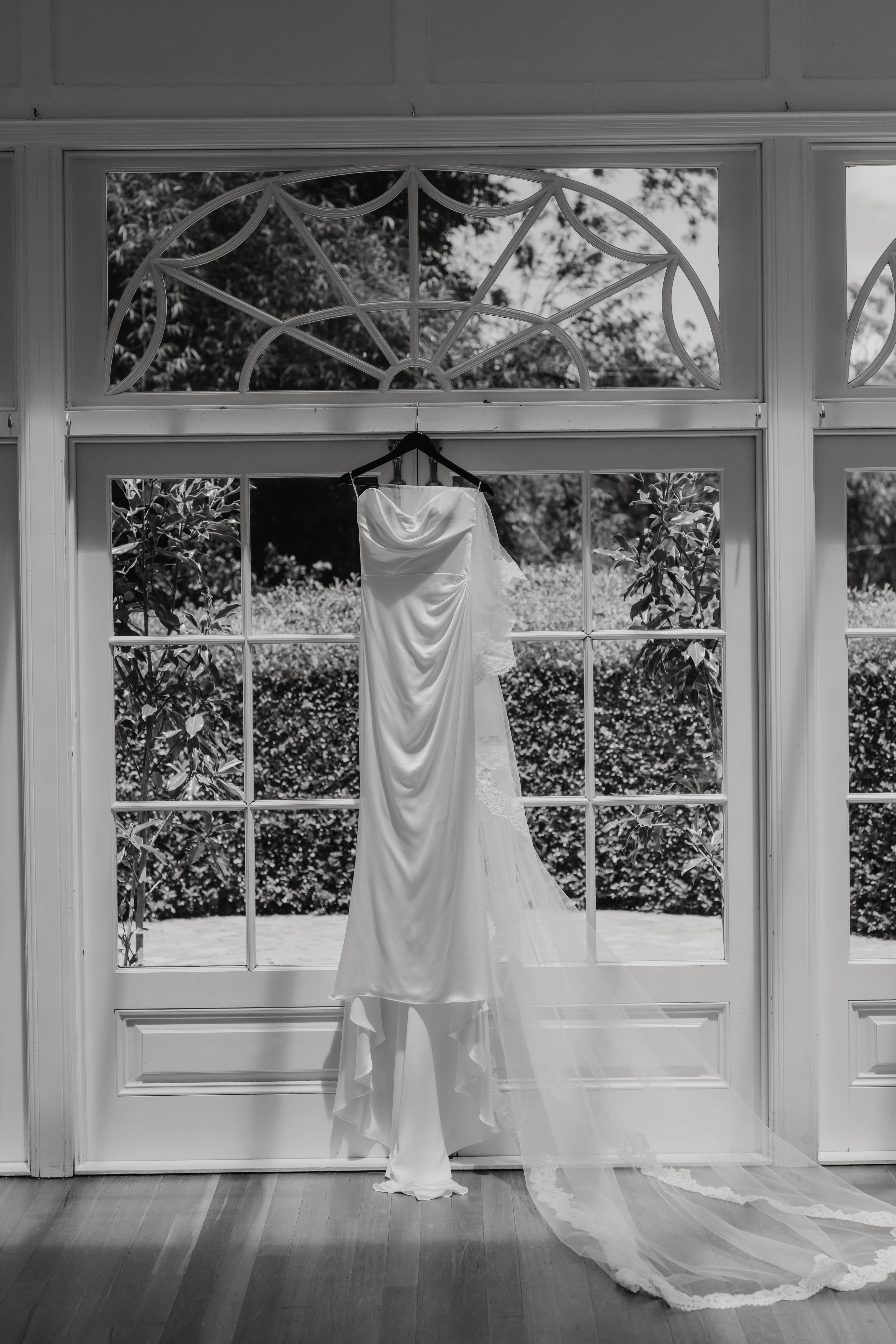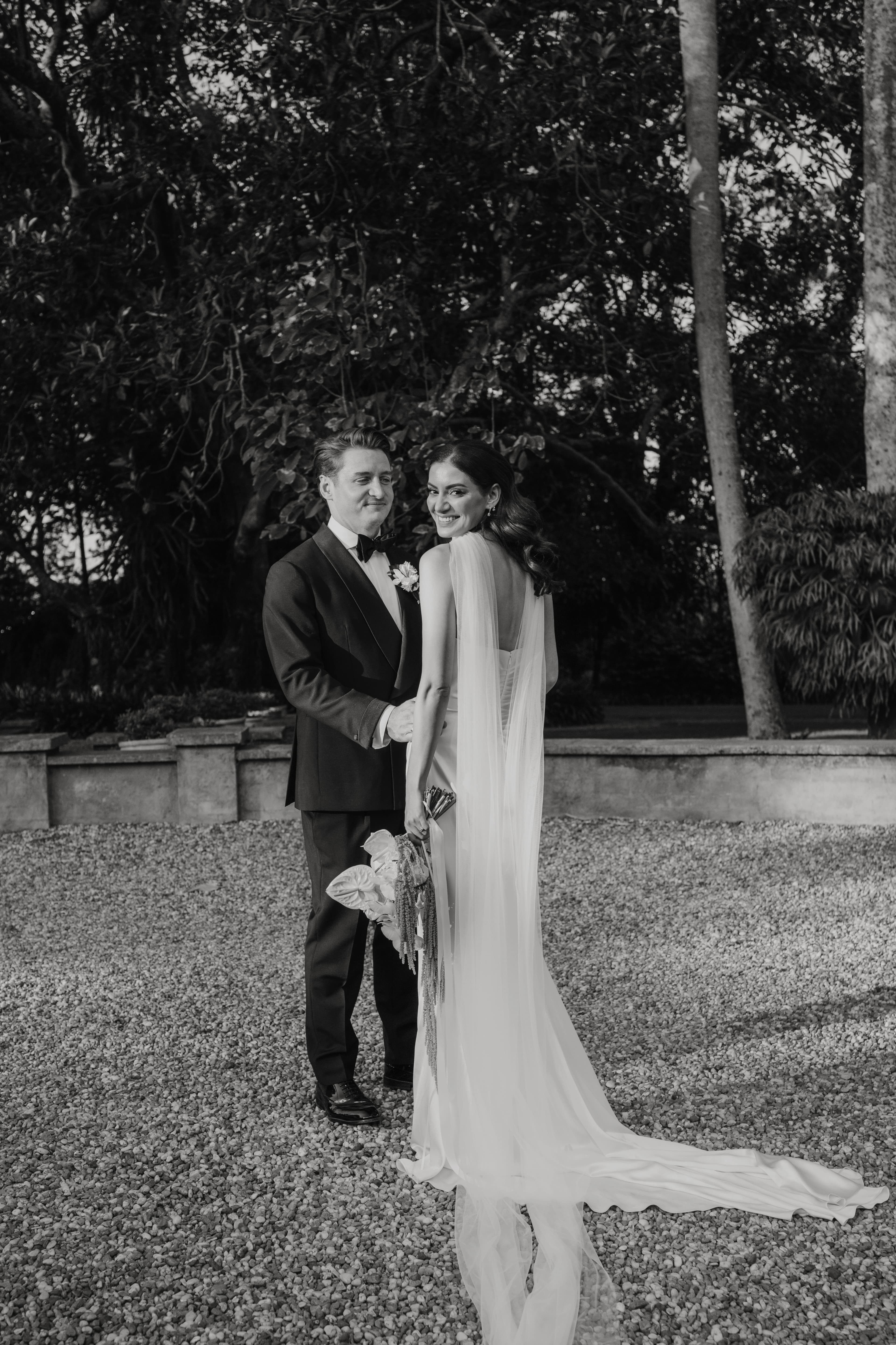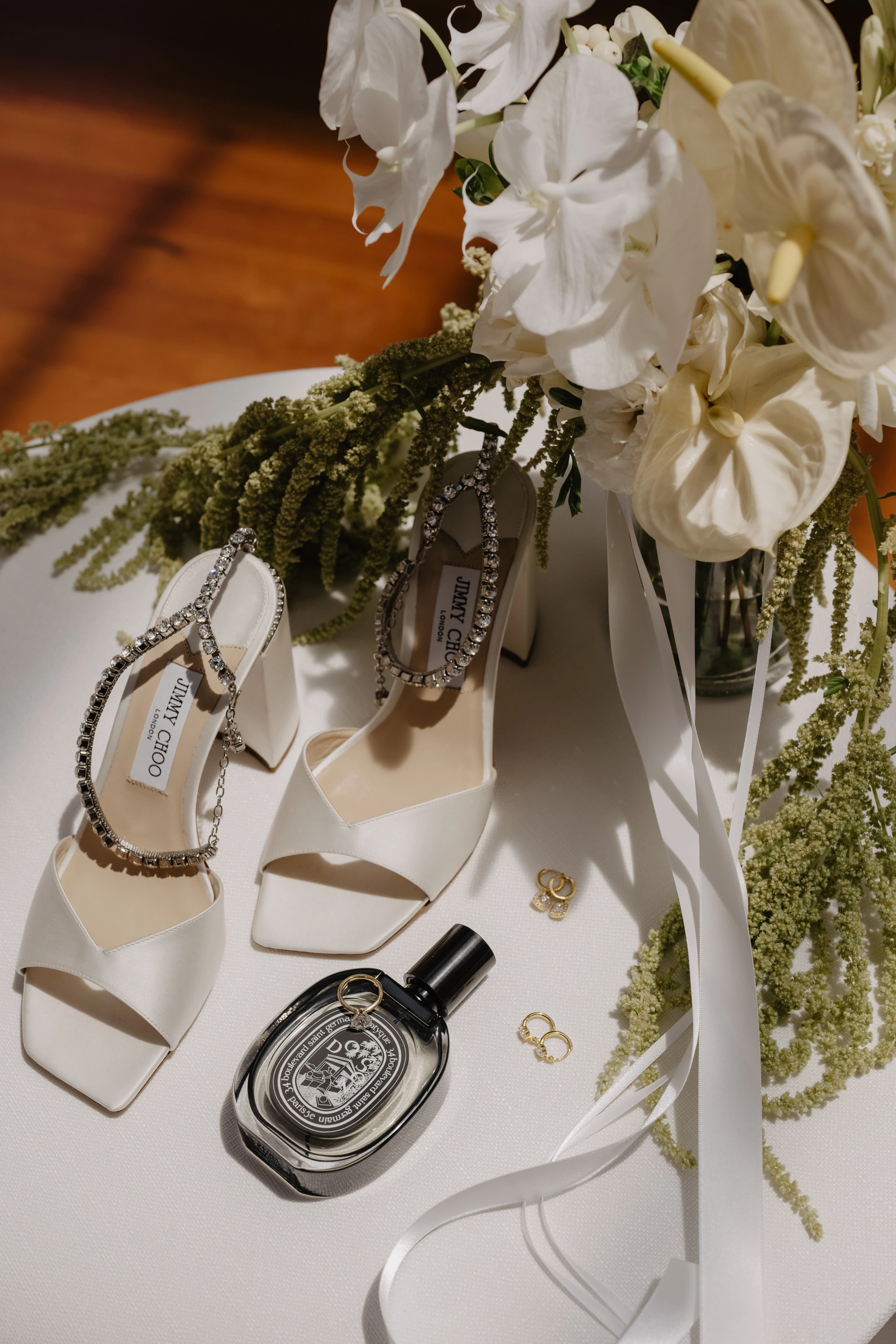 She entered with her father, her satin gown moving in liquid lines, veil edged in lace like fine engraving against air. The cedar stood before them as a sentinel, its branches folding into silence while orchids, garden roses and hydrangea gathered with greenery at its base — not as decoration but as offering, as though the garden itself leaned in to witness. White ribbons traced the aisle like streams of light, guiding guests into stillness as vows rose softly into the afternoon air. At the reception, the sense of intention carried through — pears nestled among florals, glassware tied with black ribbons etched in playful symbols and menus adorned with hand-drawn detail. Each table felt both refined and alive, blending elegance with personality. As candlelight gathered the evening close, the celebration seemed to distil into presence — luminous, grounded and enduring.
