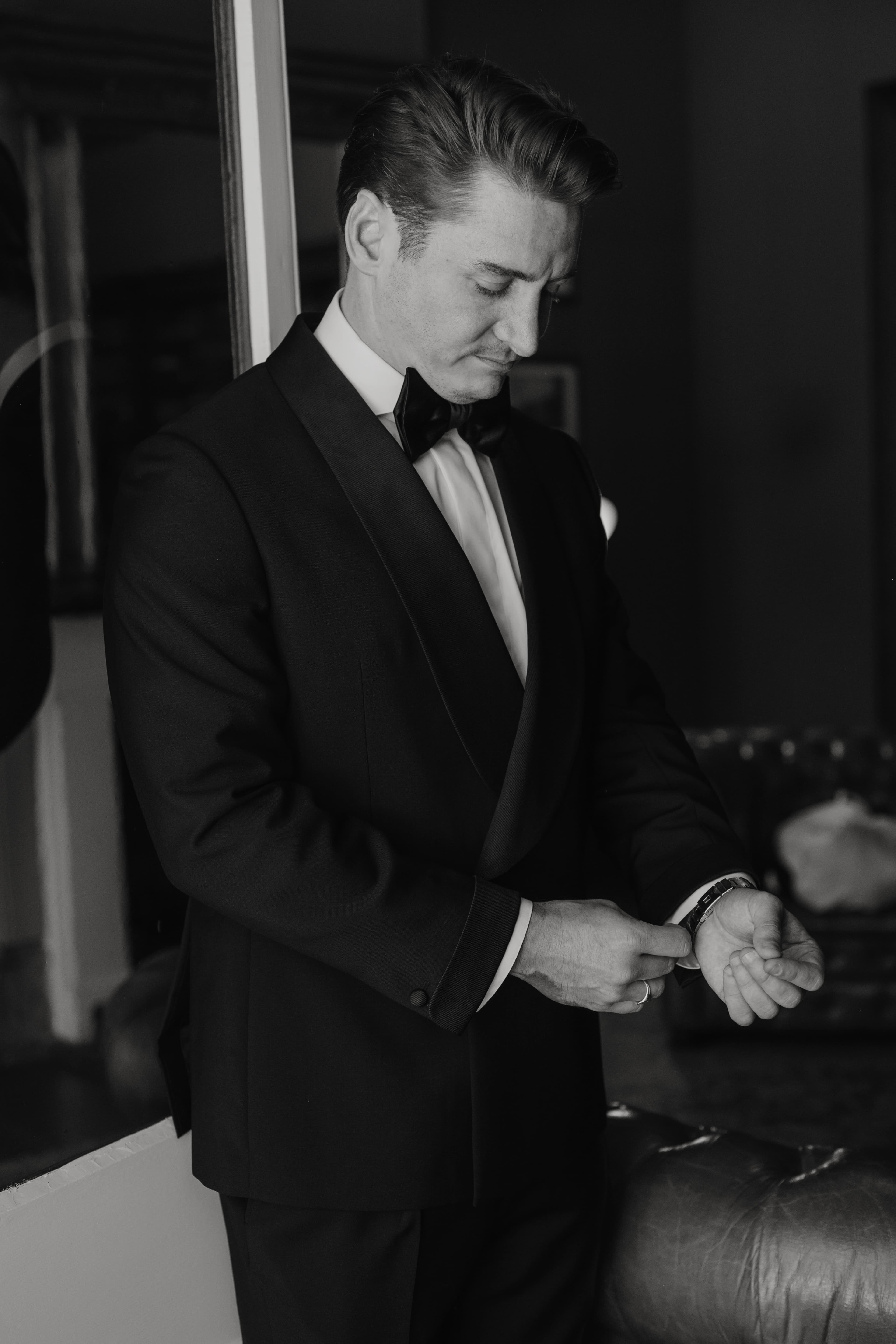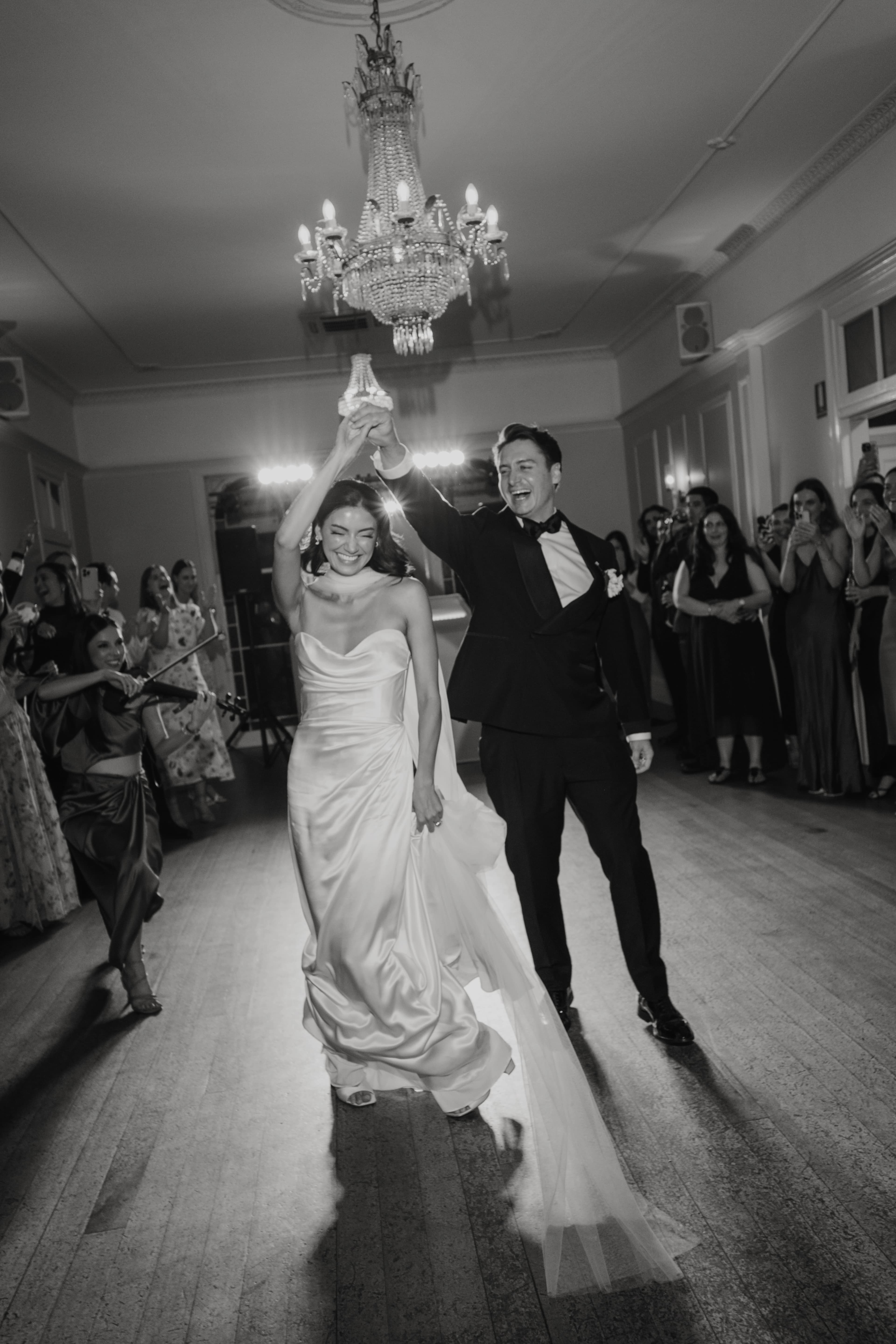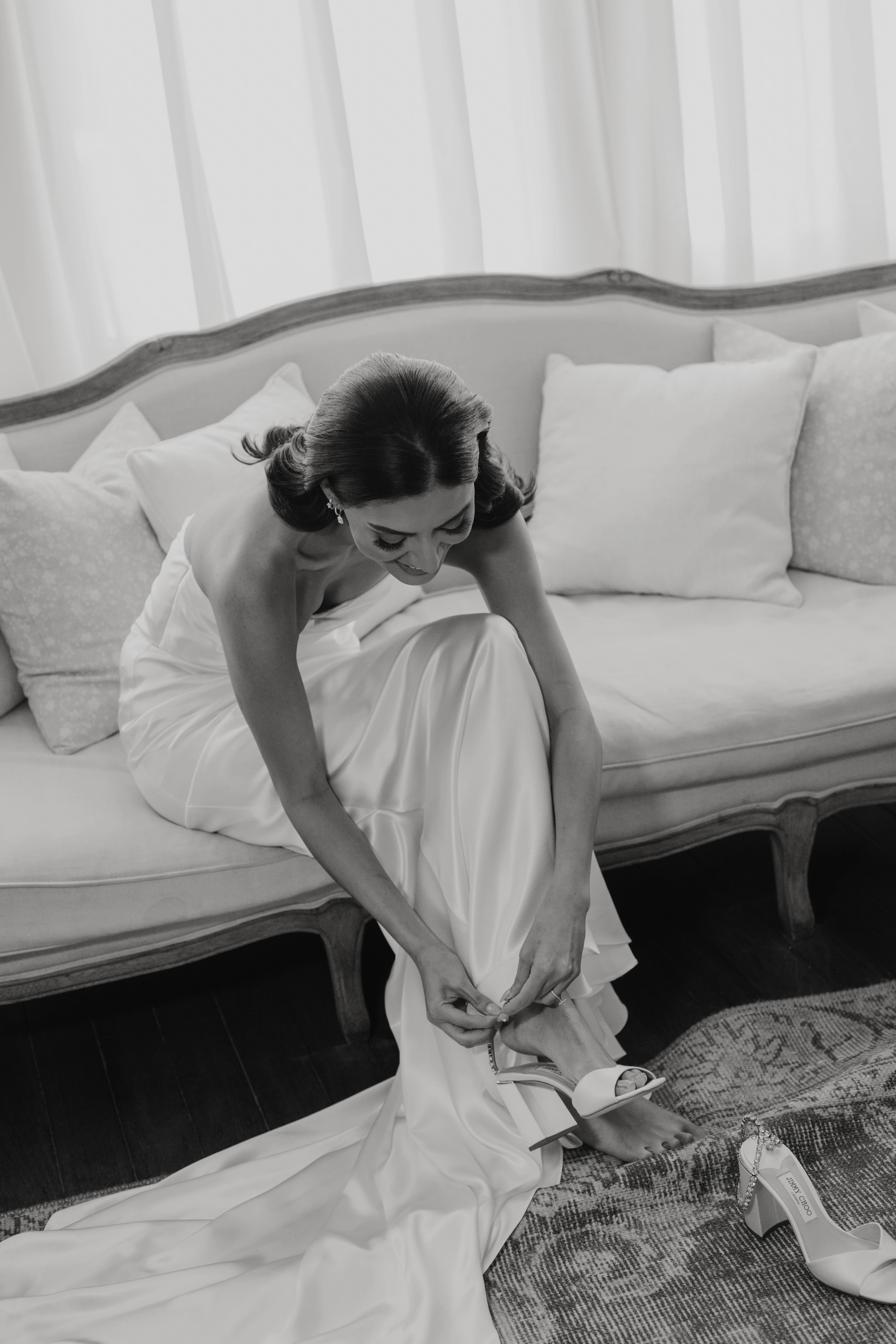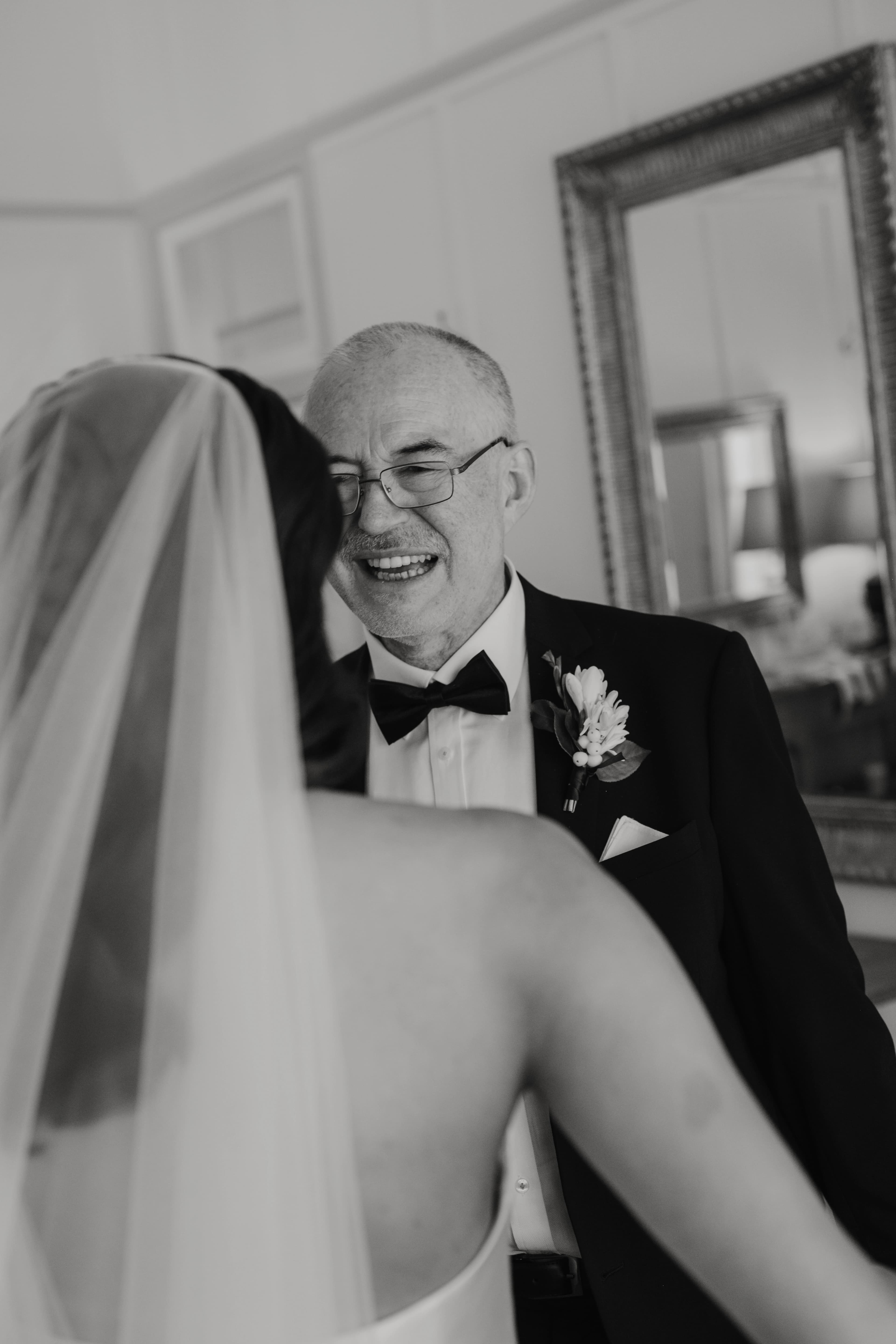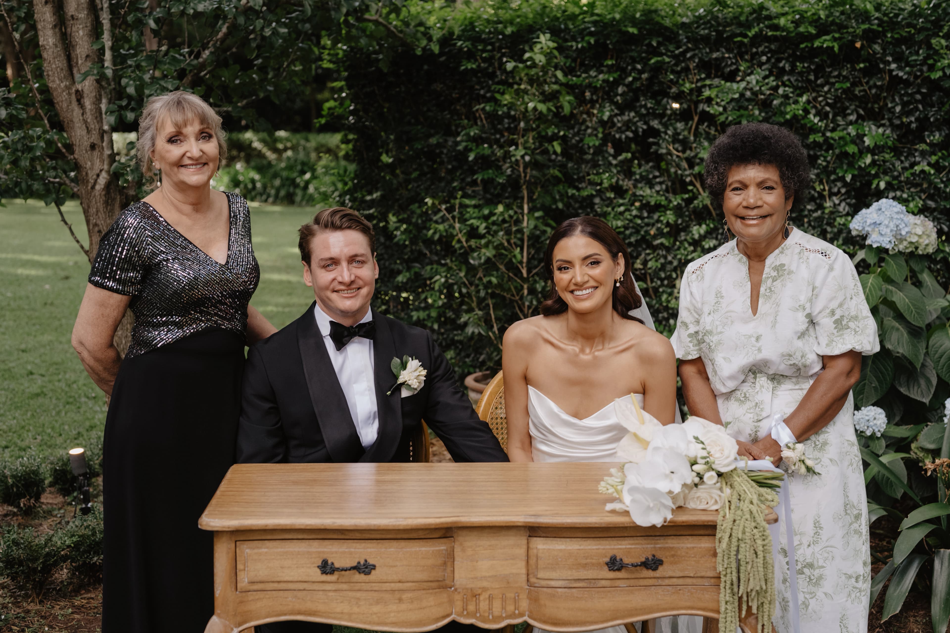 She entered with her father, her satin gown moving in liquid lines, veil edged in lace like fine engraving against air. The cedar stood before them as a sentinel, its branches folding into silence while orchids, garden roses and hydrangea gathered with greenery at its base — not as decoration but as offering, as though the garden itself leaned in to witness. White ribbons traced the aisle like streams of light, guiding guests into stillness as vows rose softly into the afternoon air. At the reception, the sense of intention carried through — pears nestled among florals, glassware tied with black ribbons etched in playful symbols and menus adorned with hand-drawn detail. Each table felt both refined and alive, blending elegance with personality. As candlelight gathered the evening close, the celebration seemed to distil into presence — luminous, grounded and enduring.