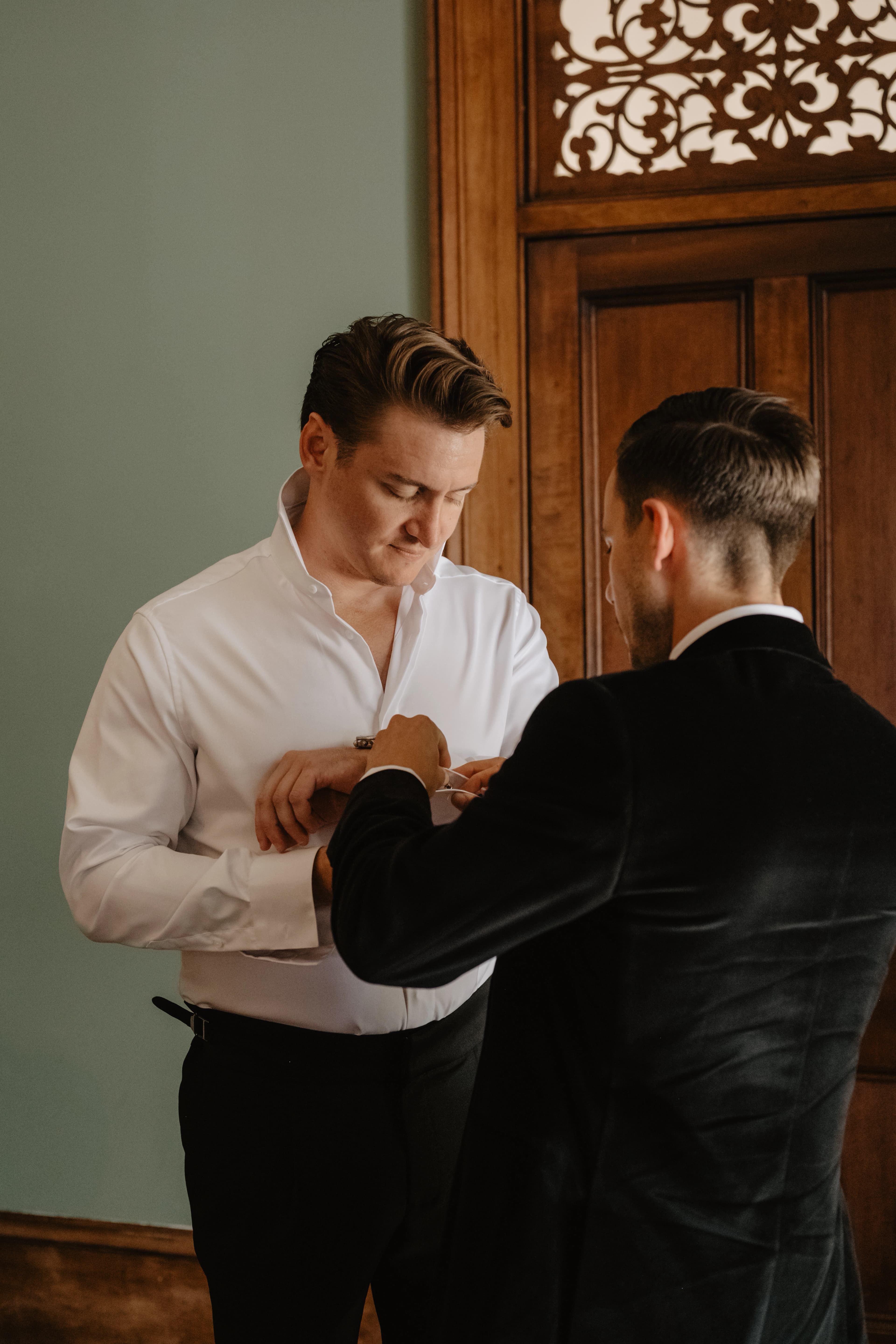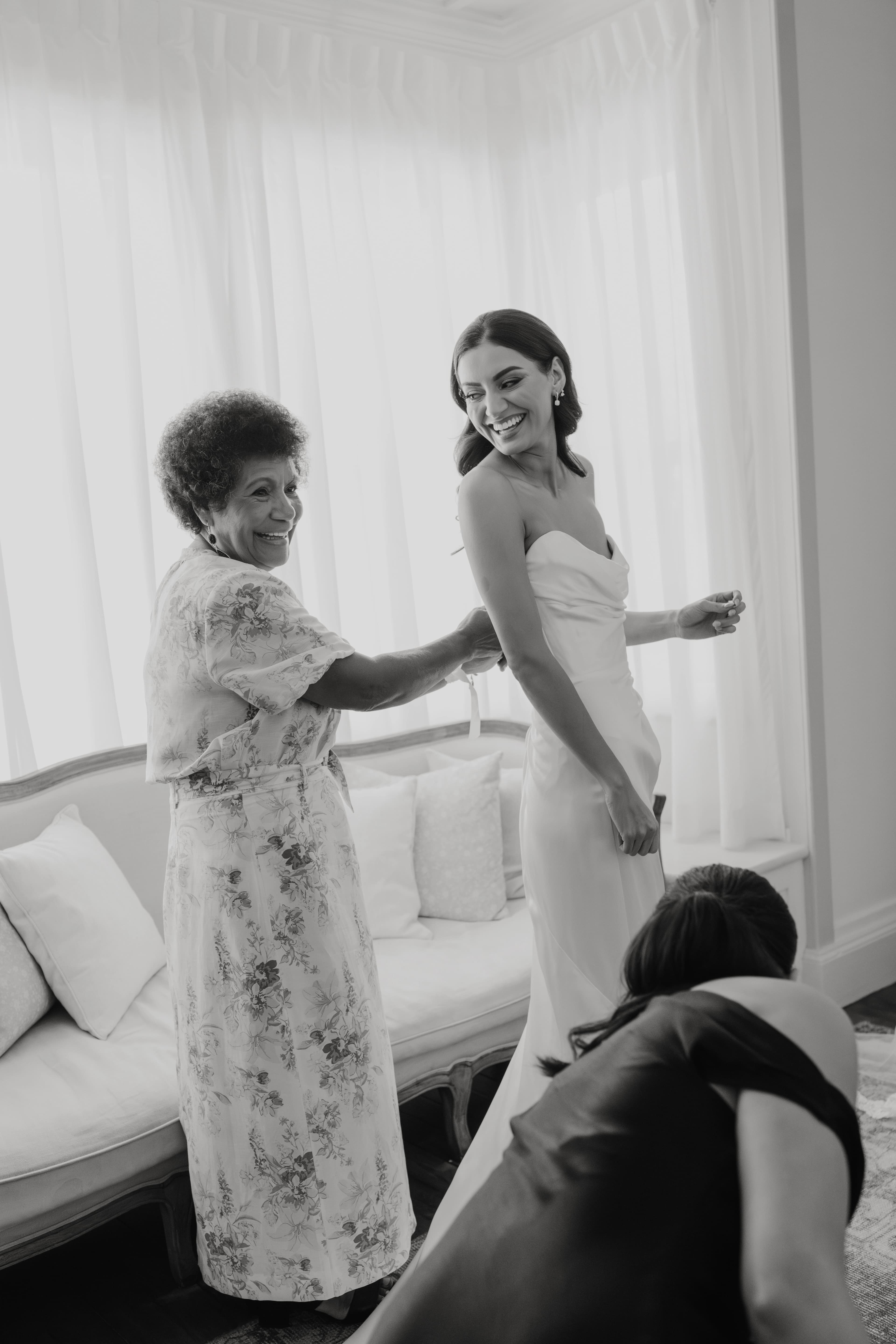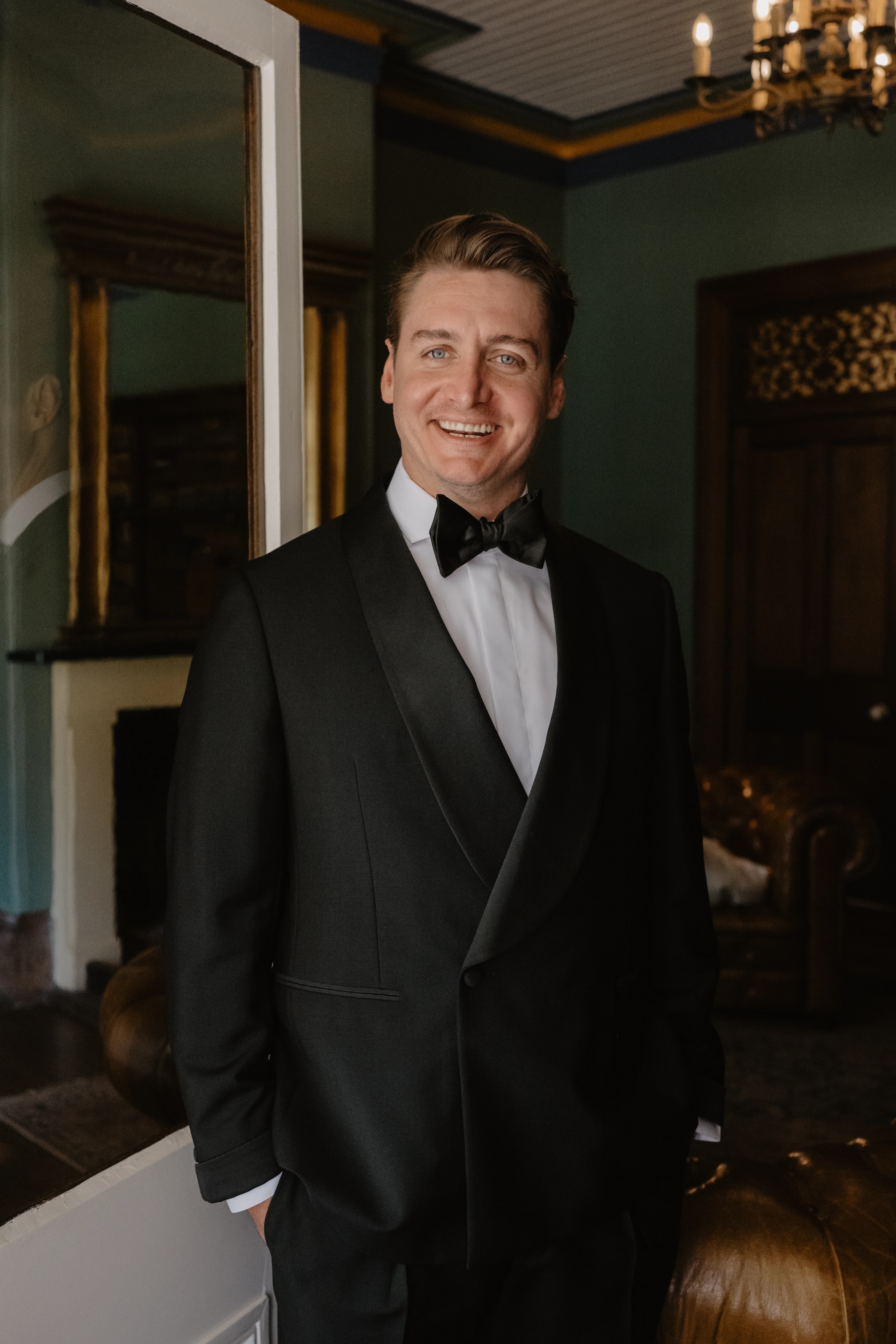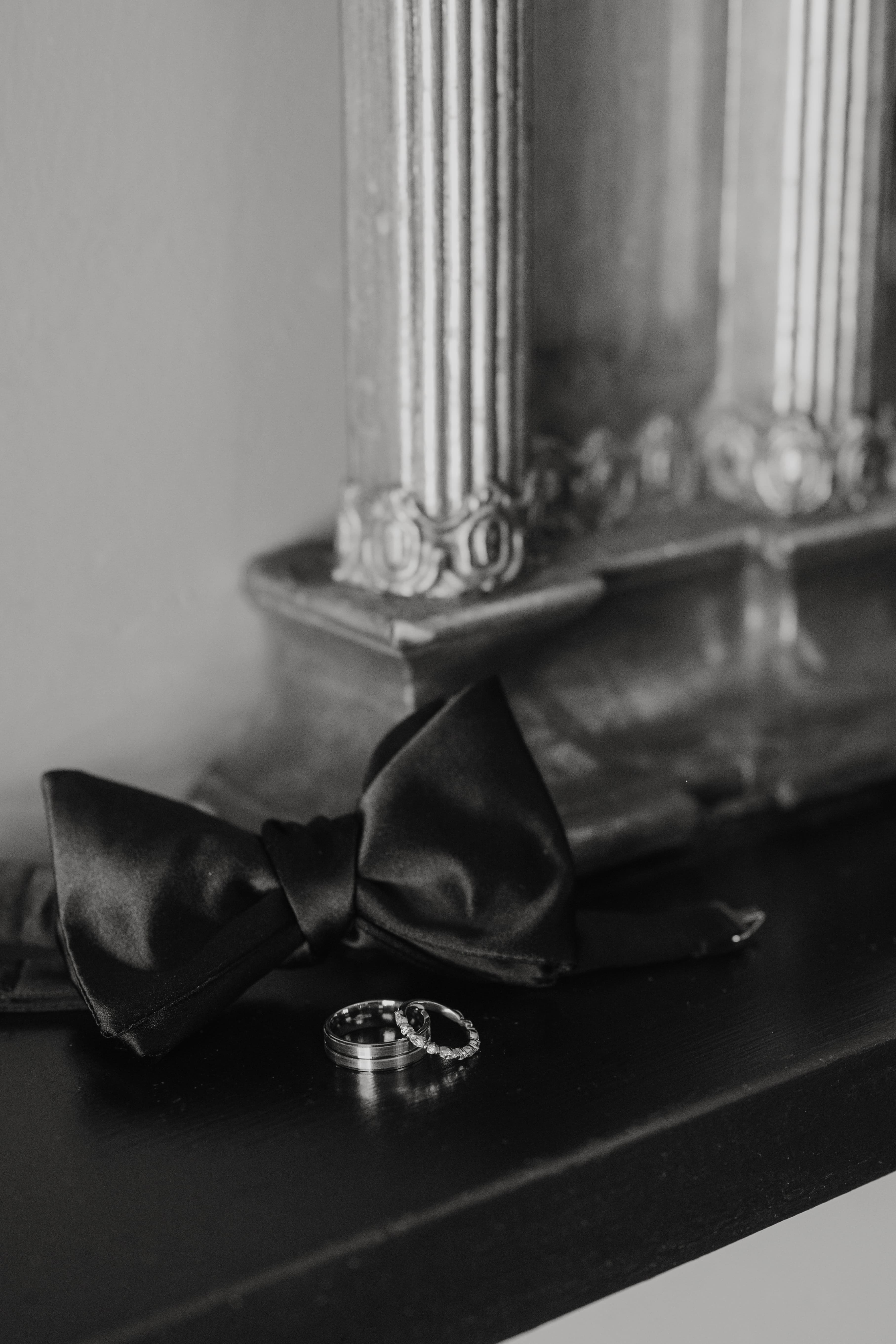She entered with her father, her satin gown moving in liquid lines, veil edged in lace like fine engraving against air. The cedar stood before them as a sentinel, its branches folding into silence while orchids, garden roses and hydrangea gathered with greenery at its base — not as decoration but as offering, as though the garden itself leaned in to witness. White ribbons traced the aisle like streams of light, guiding guests into stillness as vows rose softly into the afternoon air. At the reception, the sense of intention carried through — pears nestled among florals, glassware tied with black ribbons etched in playful symbols and menus adorned with hand-drawn detail. Each table felt both refined and alive, blending elegance with personality. As candlelight gathered the evening close, the celebration seemed to distil into presence — luminous, grounded and enduring.