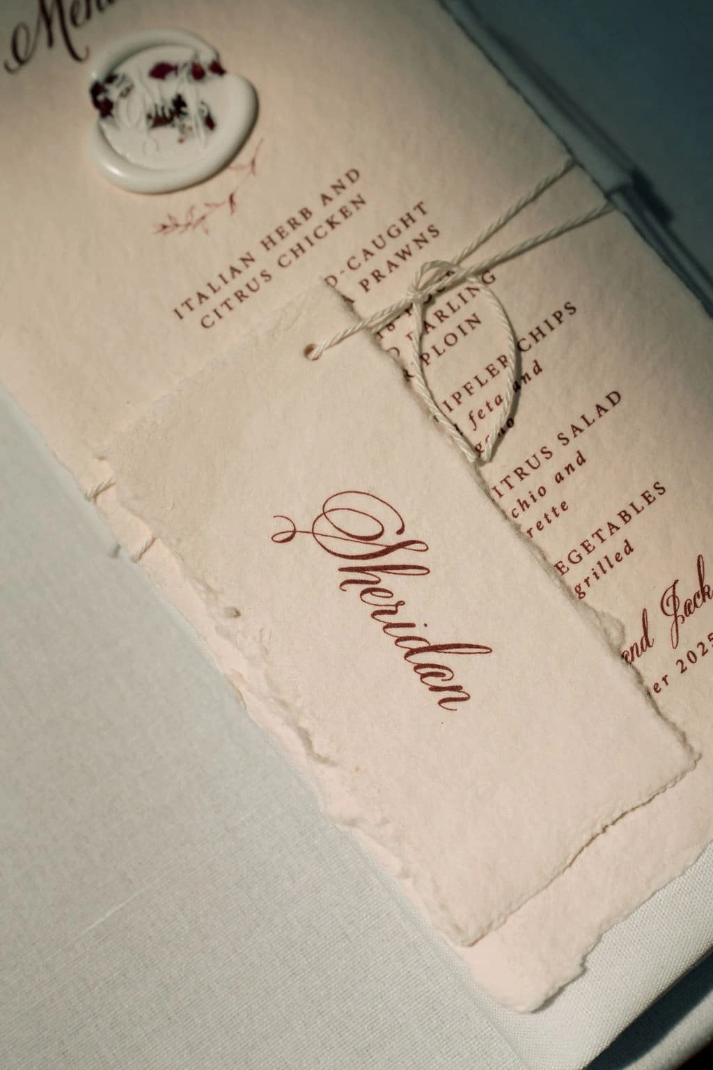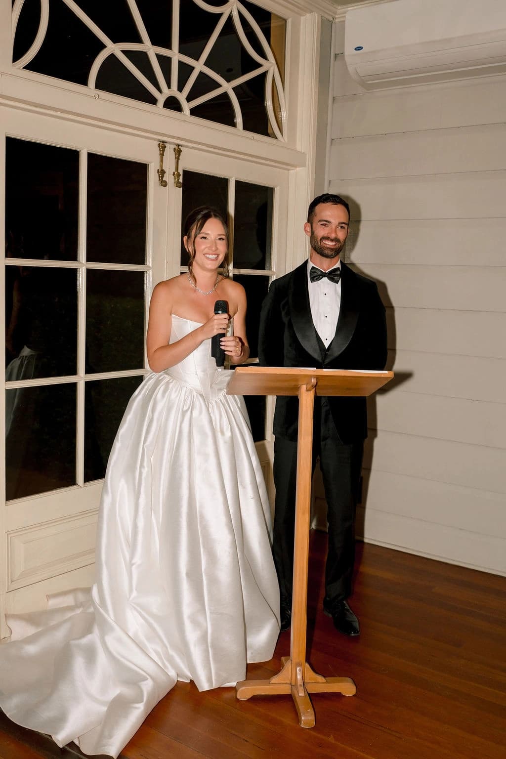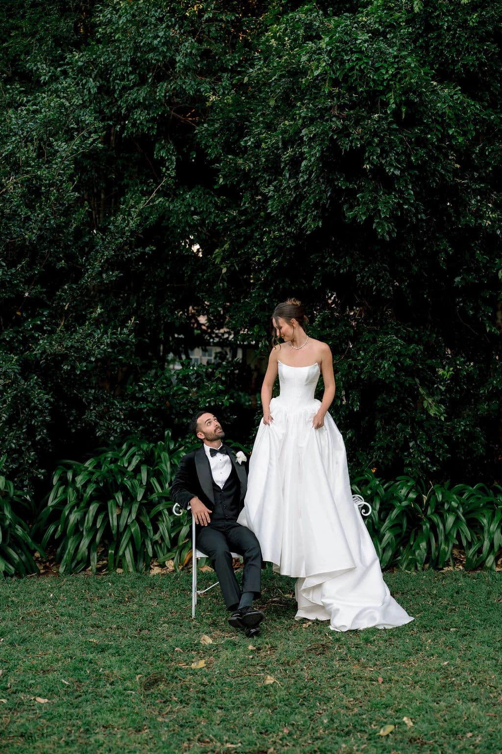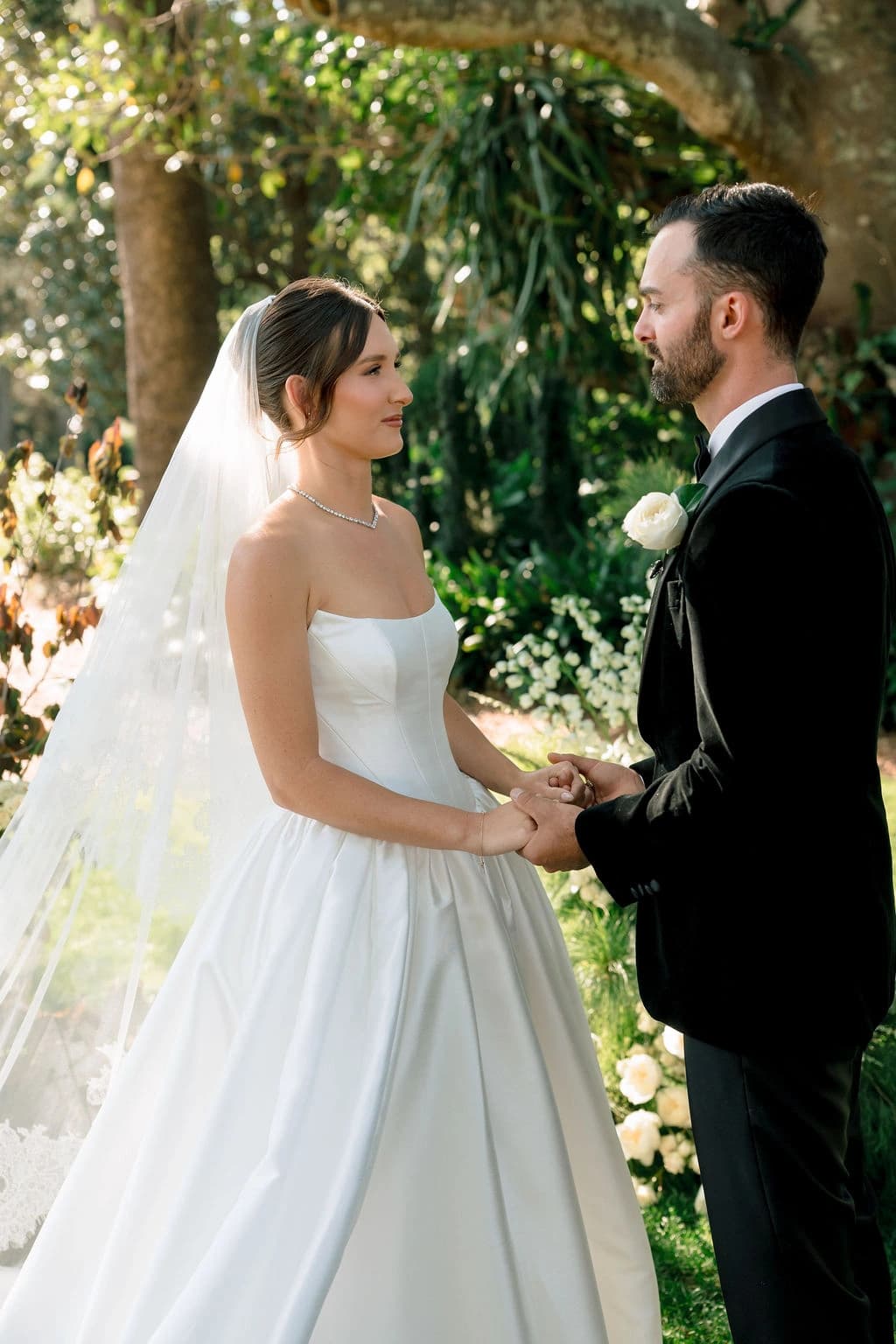 Beneath the generous canopy of The Governor’s Lawn, seventy-three guests gathered as ivory florals rose from sculptural greenery, punctuated by flashes of deep crimson anthurium. Sheridan arrived in a structured satin gown, its corseted bodice and sweeping skirt softened by a veil that caught the afternoon light. A diamond necklace rested delicately at her collarbone, echoing the quiet refinement of the day. Order-of-service cards, torn-edged and sealed in wax, hinted at the care woven into every detail. As timber chairs lined the grass and vows were spoken beneath ancient branches, celebration gave way to candlelit elegance inside, where long tables, silver candelabra and softly glowing tapers carried the story into evening.