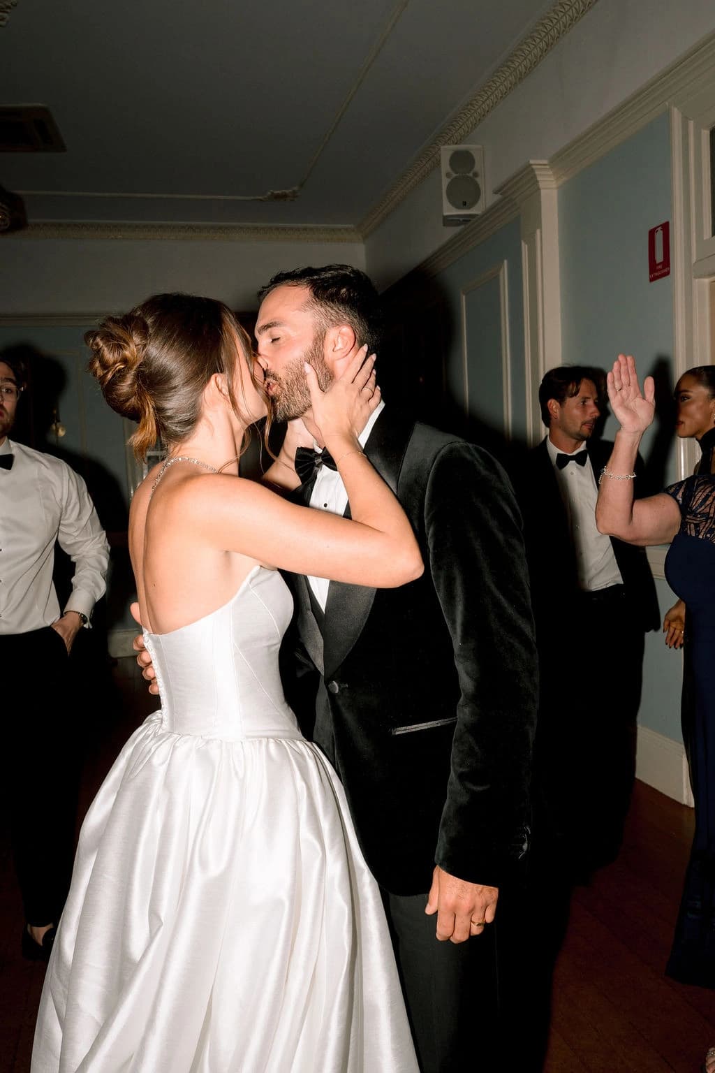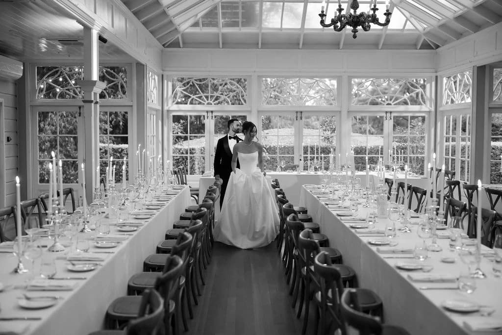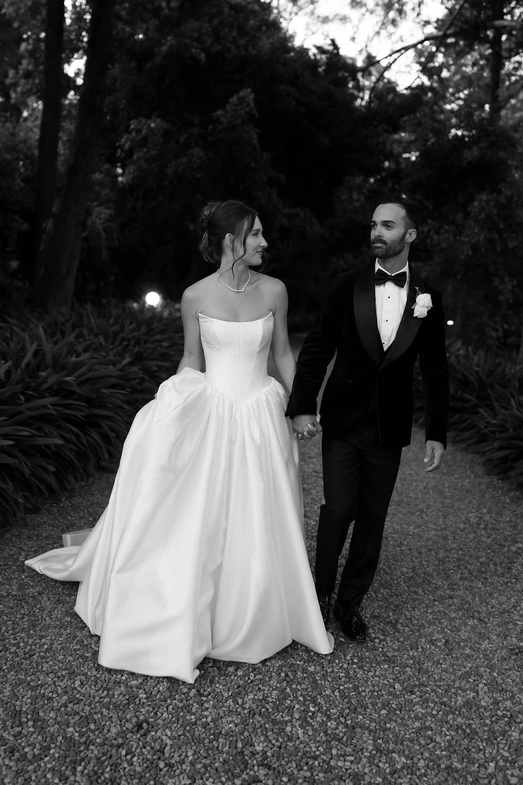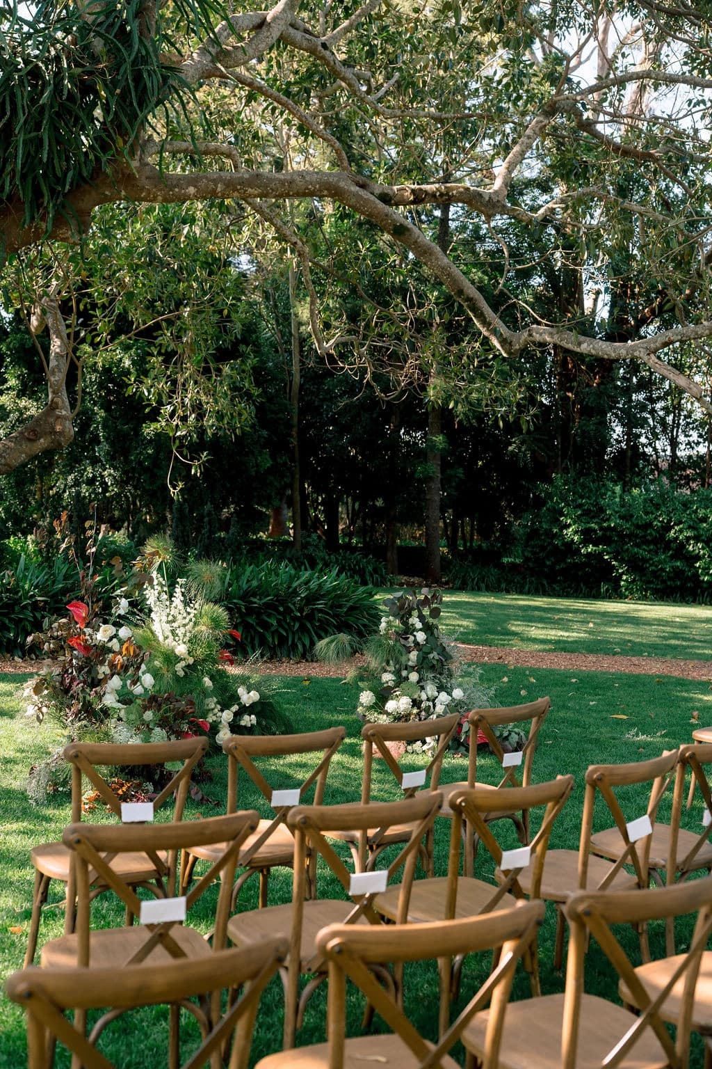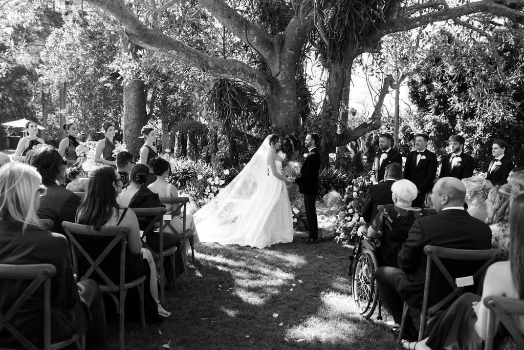 Beneath the generous canopy of The Governor’s Lawn, seventy-three guests gathered as ivory florals rose from sculptural greenery, punctuated by flashes of deep crimson anthurium. Sheridan arrived in a structured satin gown, its corseted bodice and sweeping skirt softened by a veil that caught the afternoon light. A diamond necklace rested delicately at her collarbone, echoing the quiet refinement of the day. Order-of-service cards, torn-edged and sealed in wax, hinted at the care woven into every detail. As timber chairs lined the grass and vows were spoken beneath ancient branches, celebration gave way to candlelit elegance inside, where long tables, silver candelabra and softly glowing tapers carried the story into evening.