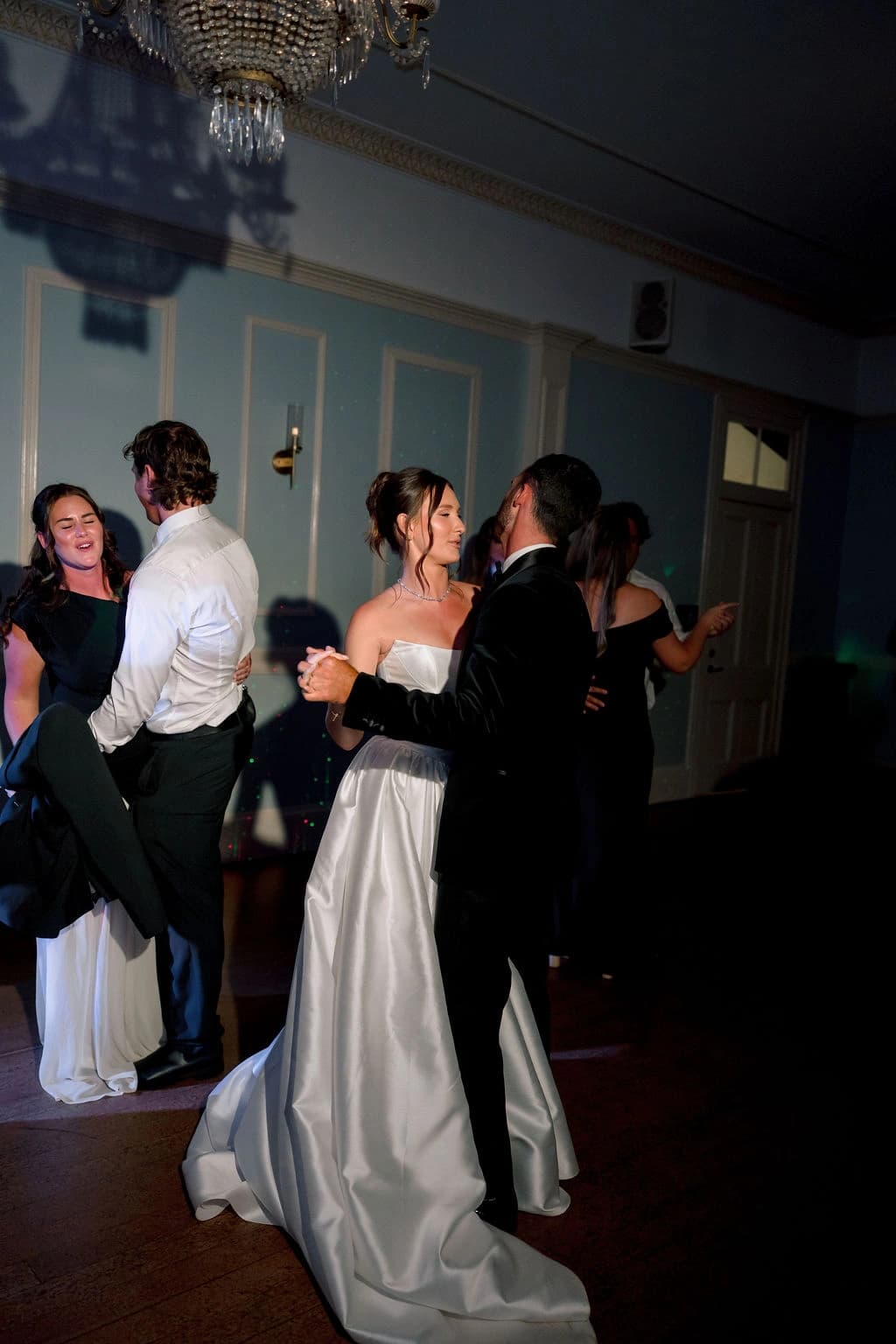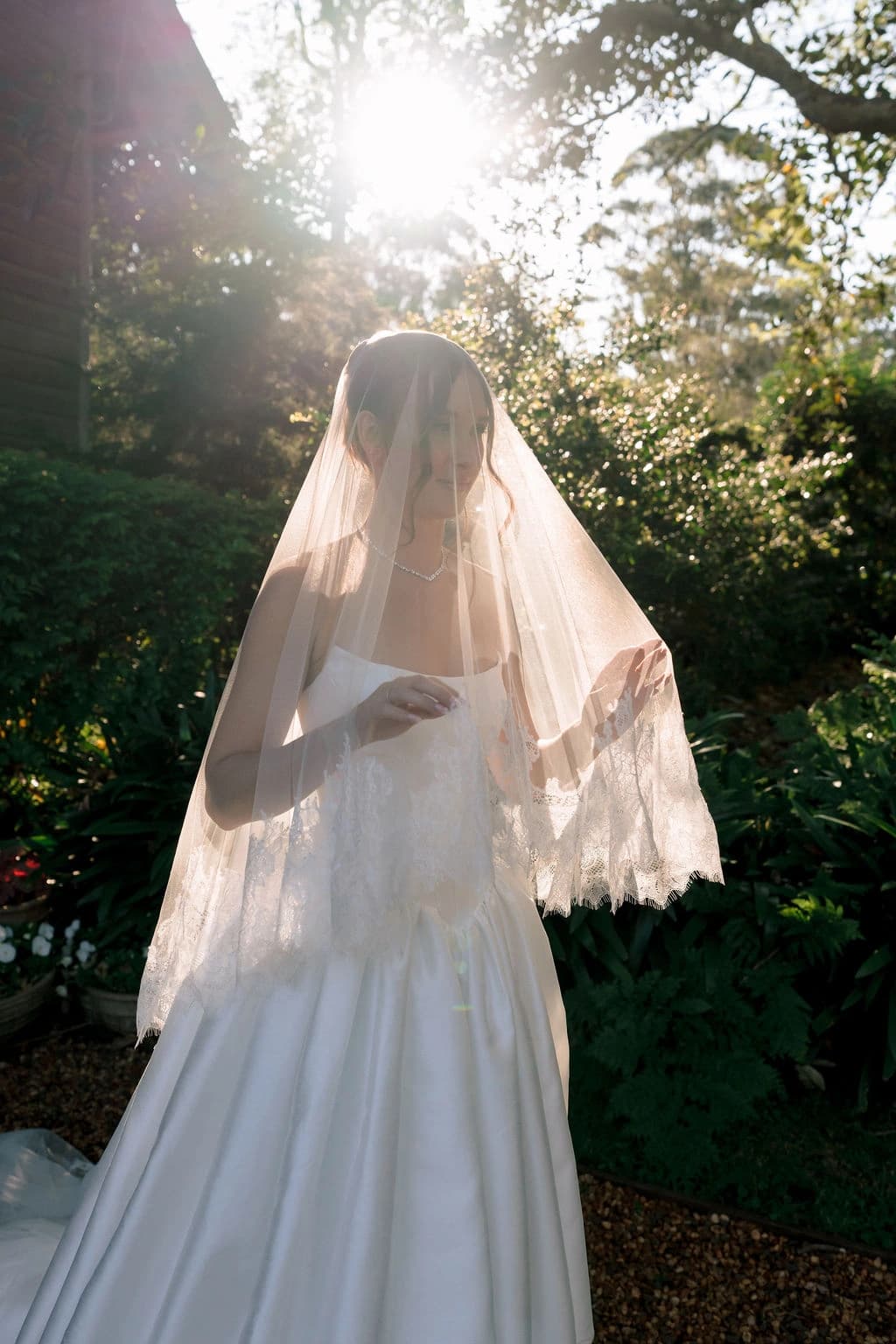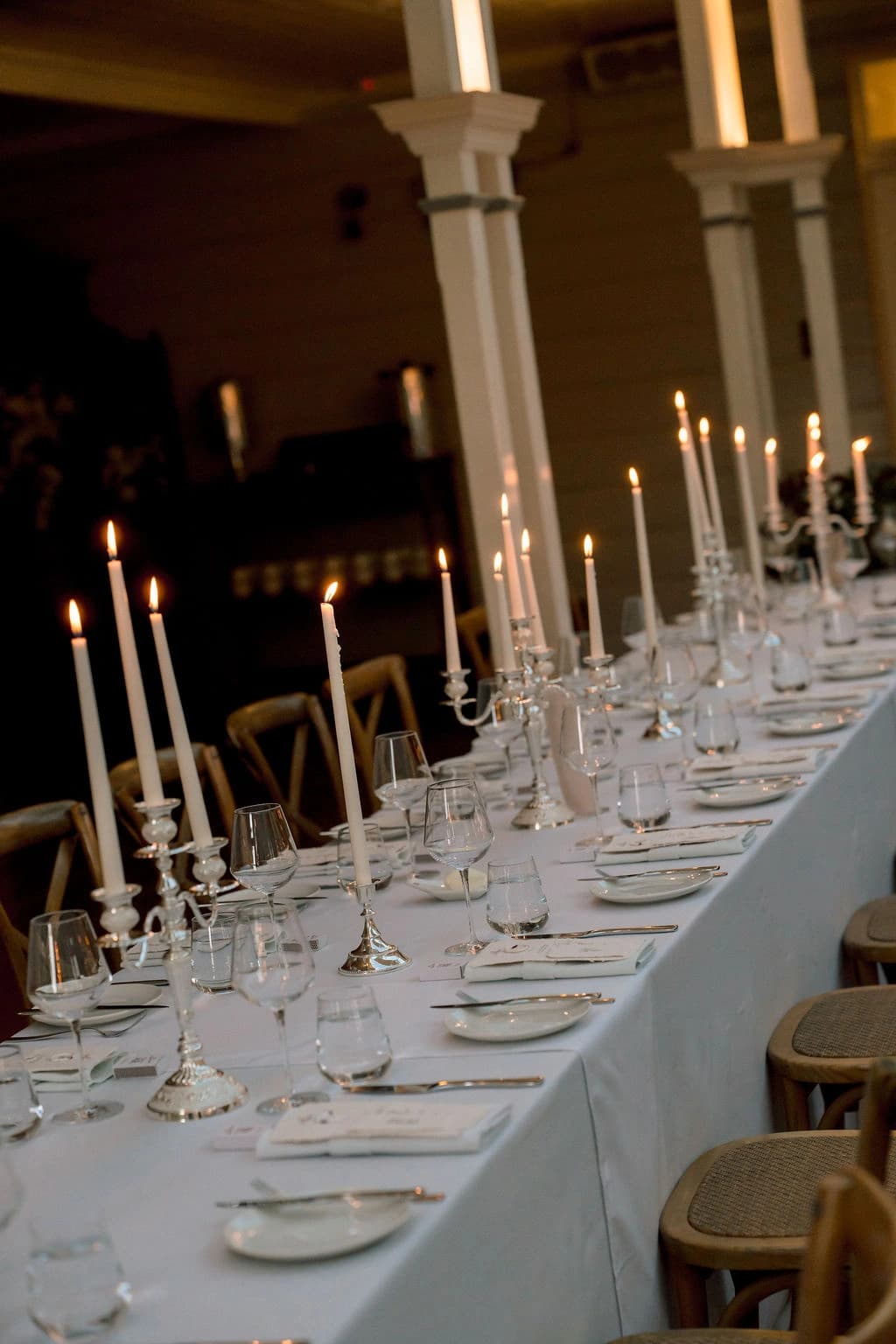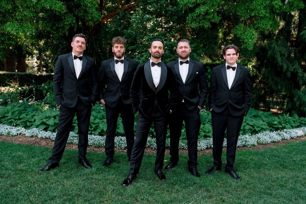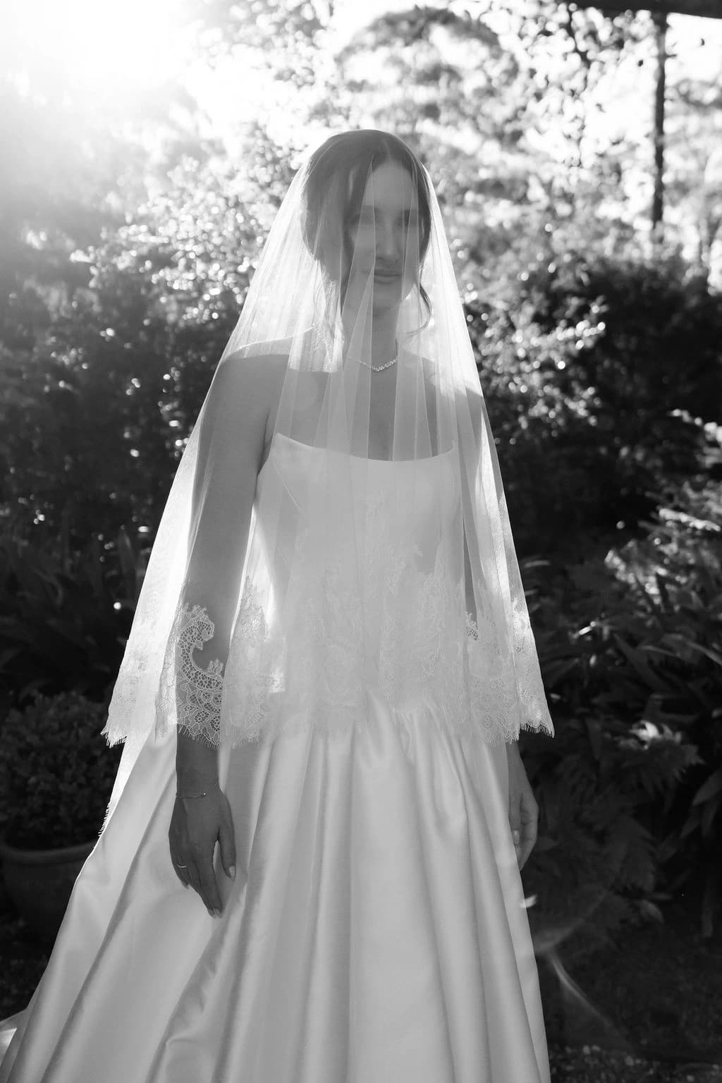 Beneath the generous canopy of The Governor’s Lawn, seventy-three guests gathered as ivory florals rose from sculptural greenery, punctuated by flashes of deep crimson anthurium. Sheridan arrived in a structured satin gown, its corseted bodice and sweeping skirt softened by a veil that caught the afternoon light. A diamond necklace rested delicately at her collarbone, echoing the quiet refinement of the day. Order-of-service cards, torn-edged and sealed in wax, hinted at the care woven into every detail. As timber chairs lined the grass and vows were spoken beneath ancient branches, celebration gave way to candlelit elegance inside, where long tables, silver candelabra and softly glowing tapers carried the story into evening.