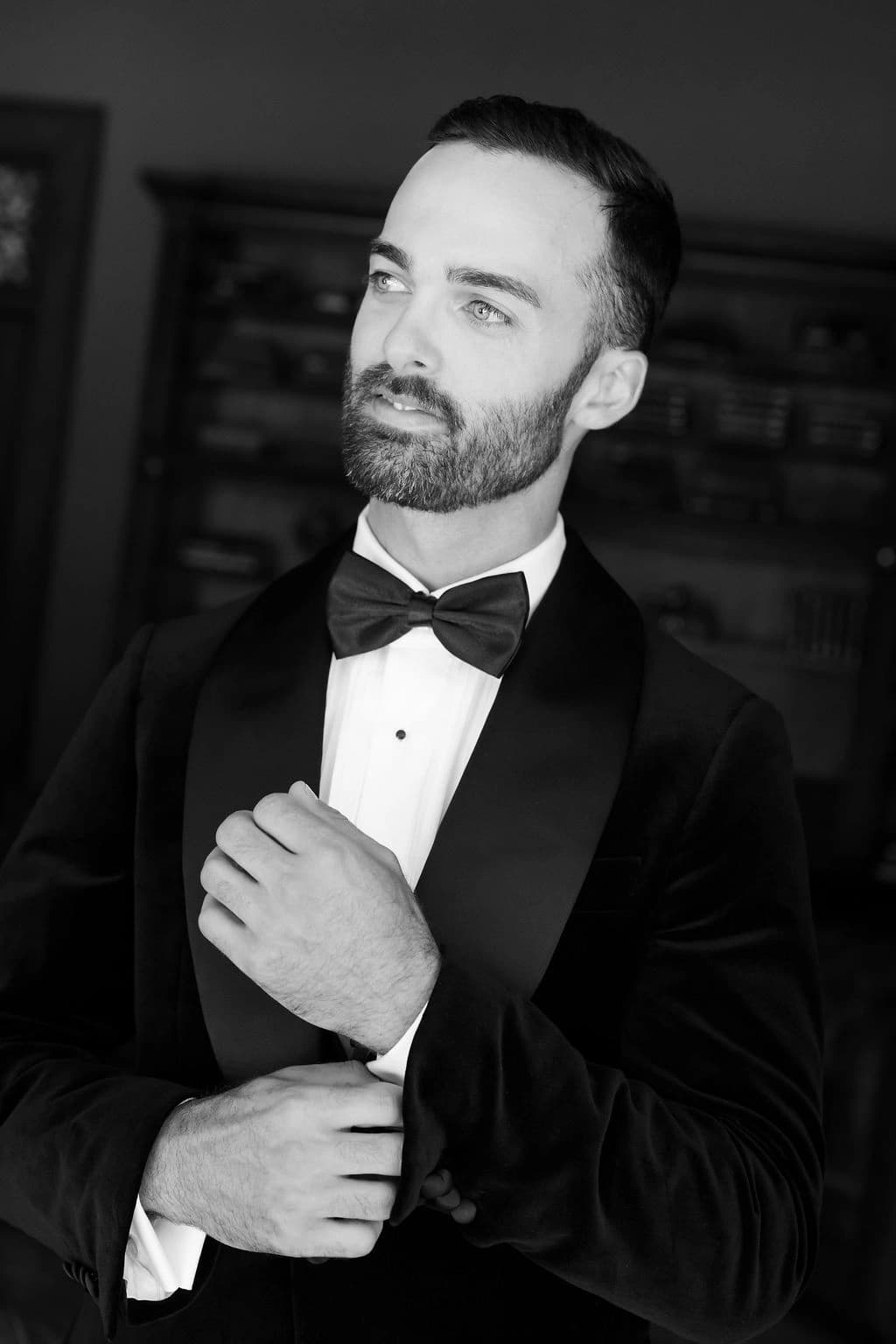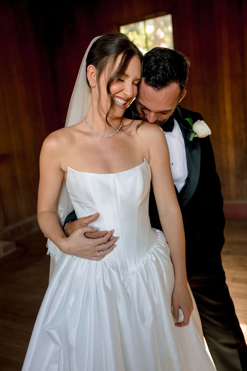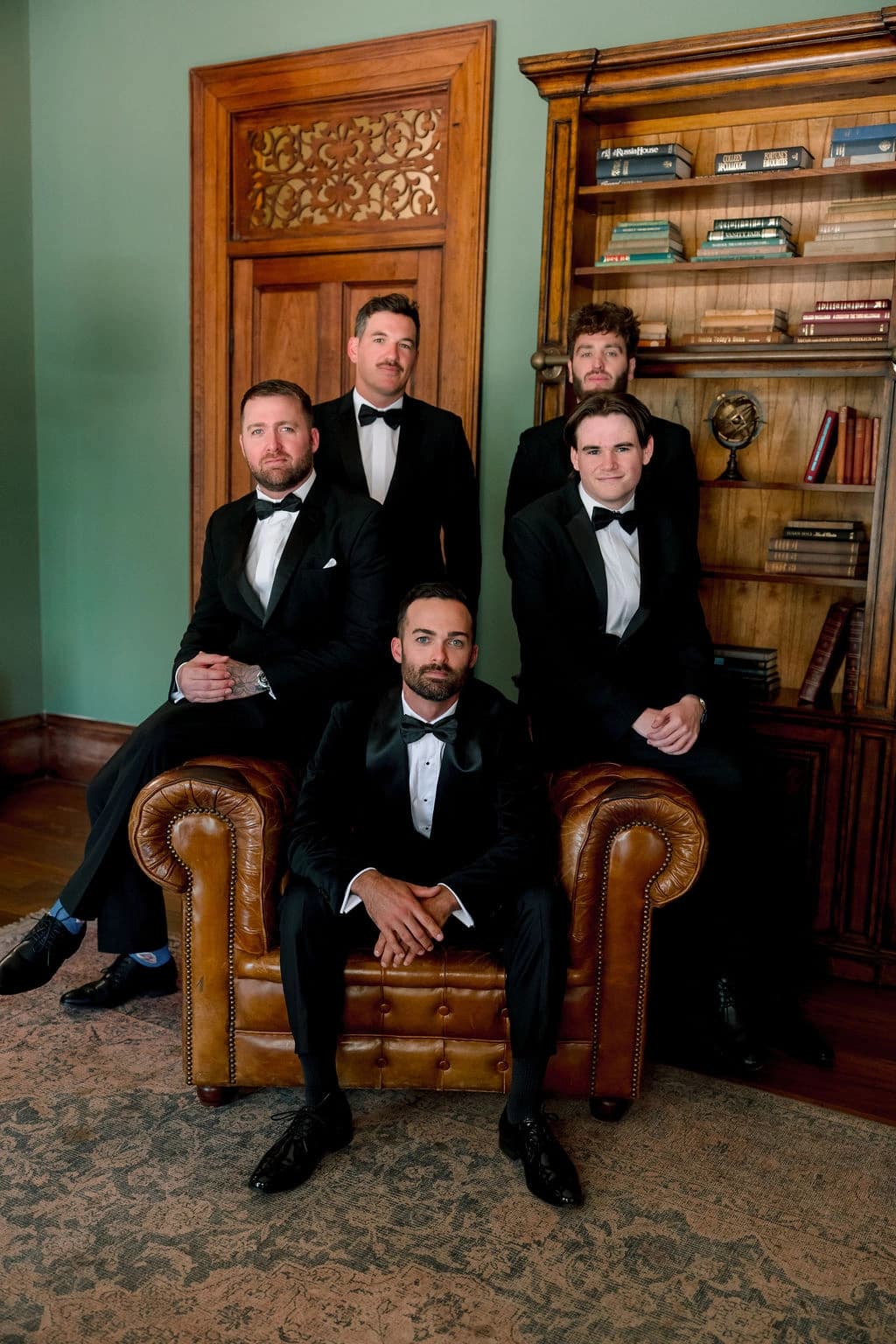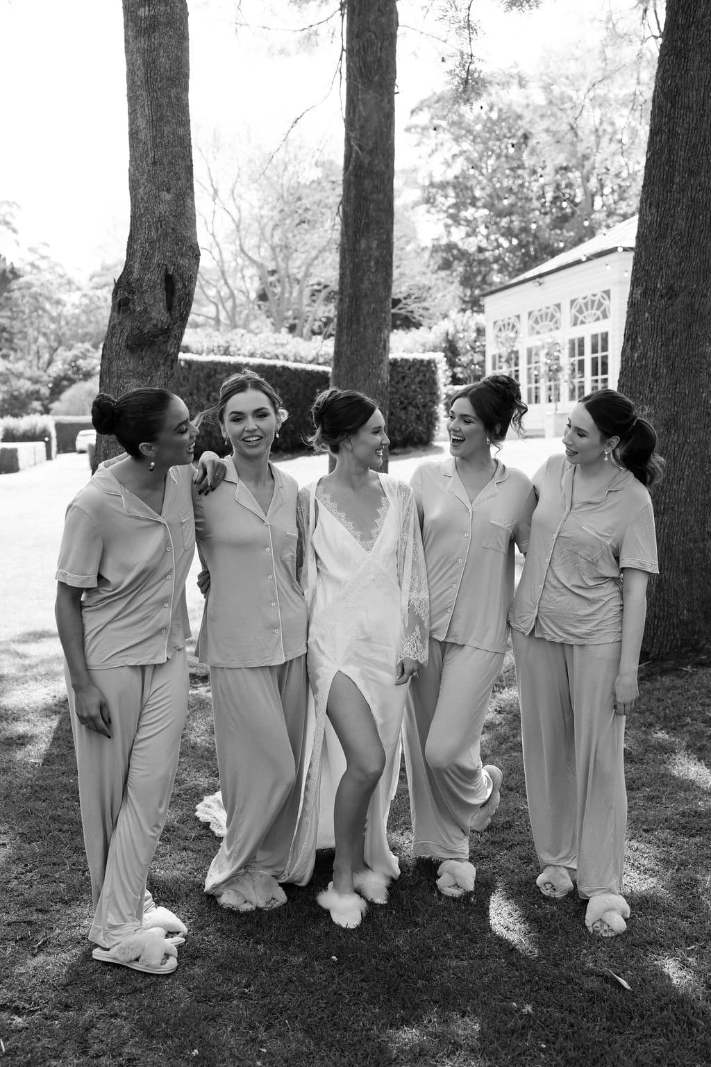 Beneath the generous canopy of The Governor’s Lawn, seventy-three guests gathered as ivory florals rose from sculptural greenery, punctuated by flashes of deep crimson anthurium. Sheridan arrived in a structured satin gown, its corseted bodice and sweeping skirt softened by a veil that caught the afternoon light. A diamond necklace rested delicately at her collarbone, echoing the quiet refinement of the day. Order-of-service cards, torn-edged and sealed in wax, hinted at the care woven into every detail. As timber chairs lined the grass and vows were spoken beneath ancient branches, celebration gave way to candlelit elegance inside, where long tables, silver candelabra and softly glowing tapers carried the story into evening.