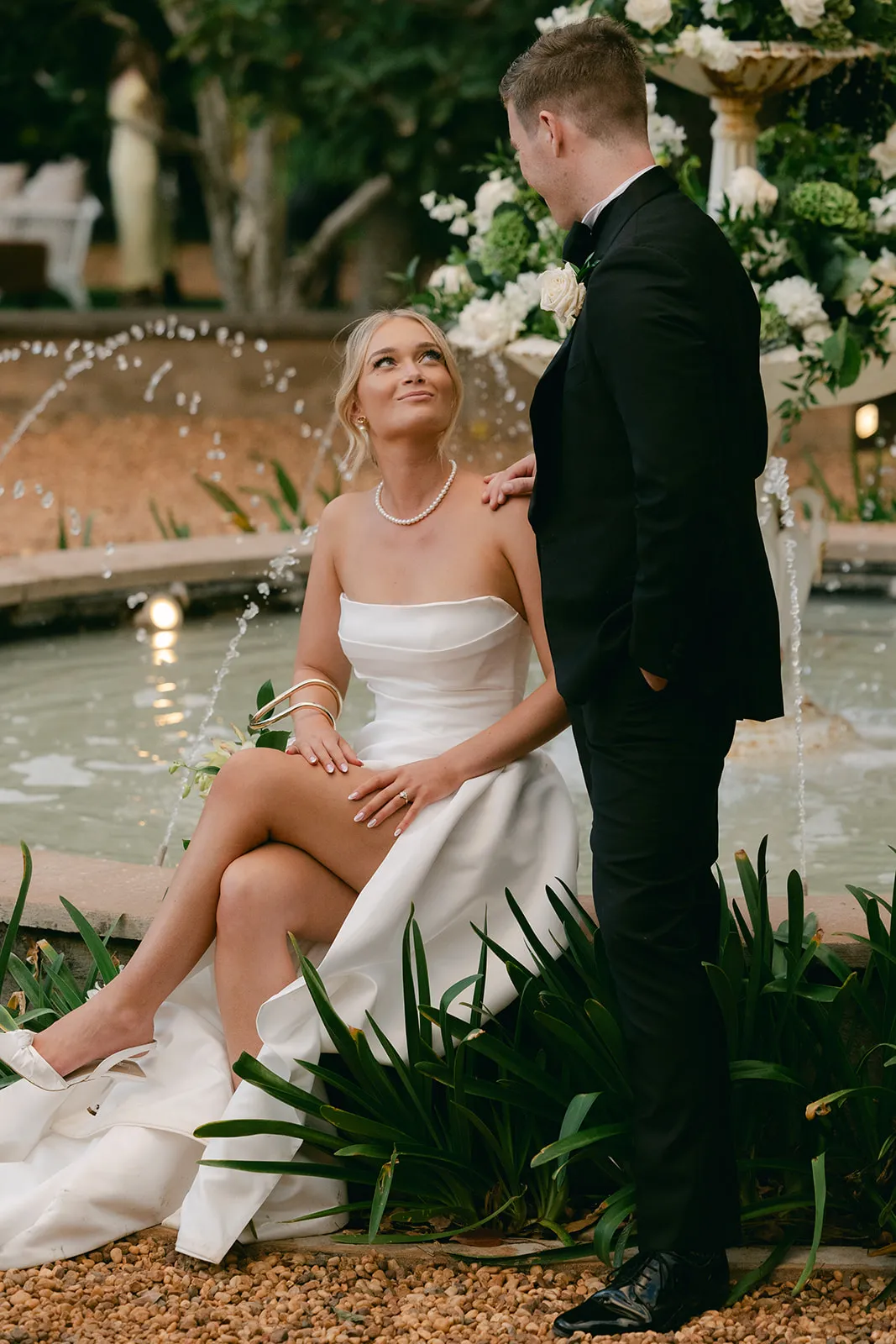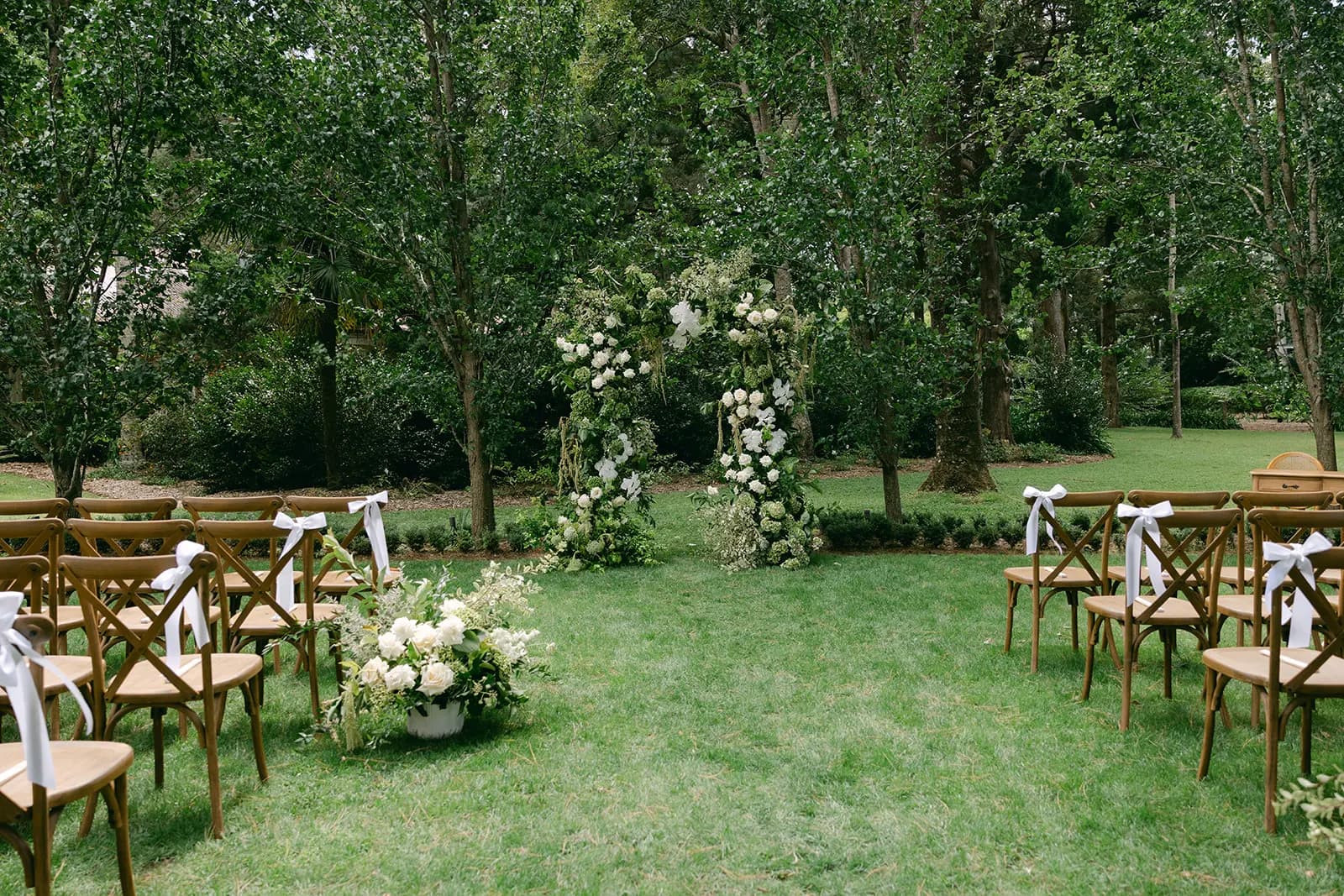 Beneath the Cedar’s Lawn, shaded by towering trees and framed by sculptural white blooms, Alyssa and Max exchanged vows — their words felt, not just heard, cradled by the soft rustle of leaves. Alyssa’s gown, a gentle ripple of fabric, moved with the same quiet grace as her steps, while Max’s black-tie formality offered a reassuring weight, grounding the day’s softer edges. Inside the Conservatory, candlelight glowed against pressed linen, white accents, and a tower of coupe glasses that shimmered beside an evening kiss. From the first, perfume-sweet notes of morning to dusk beneath the glowing lights, every detail felt purposeful, rooted in care and joie de vivre.