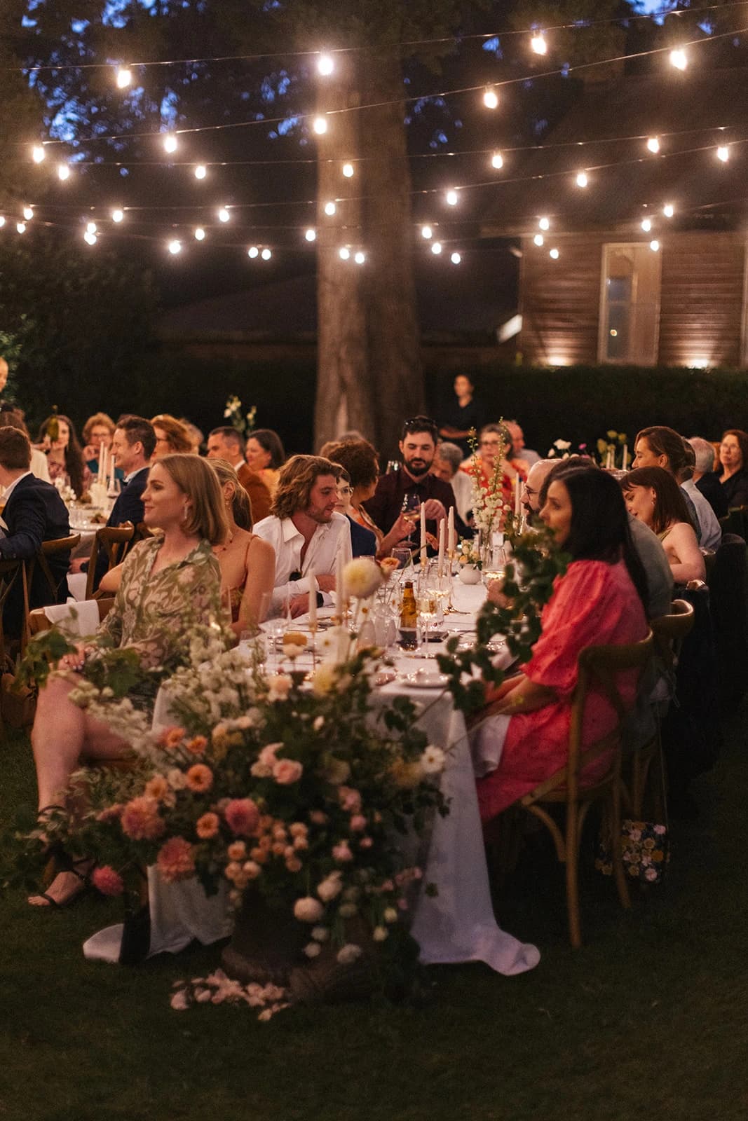 Maddie and Sam’s wedding felt grounded and unhurried—a quiet afternoon under the trees at The Cedar Lawn. Maddie wore an off-the-shoulder gown with a clean, sculptural silhouette, paired with a cathedral-length veil in sheer tulle, edged with fine lace appliqué and floral embellishments. As she walked, the veil caught the light and moved with softness, framing each step with quiet detail. The floral styling was gentle and tonal—peach, blush and white blooms. As dusk settled, guests gathered outdoors beneath a canopy of warm lights for the evening meal. A day that felt beautifully lived-in—unforced, full of intention, and deeply theirs.