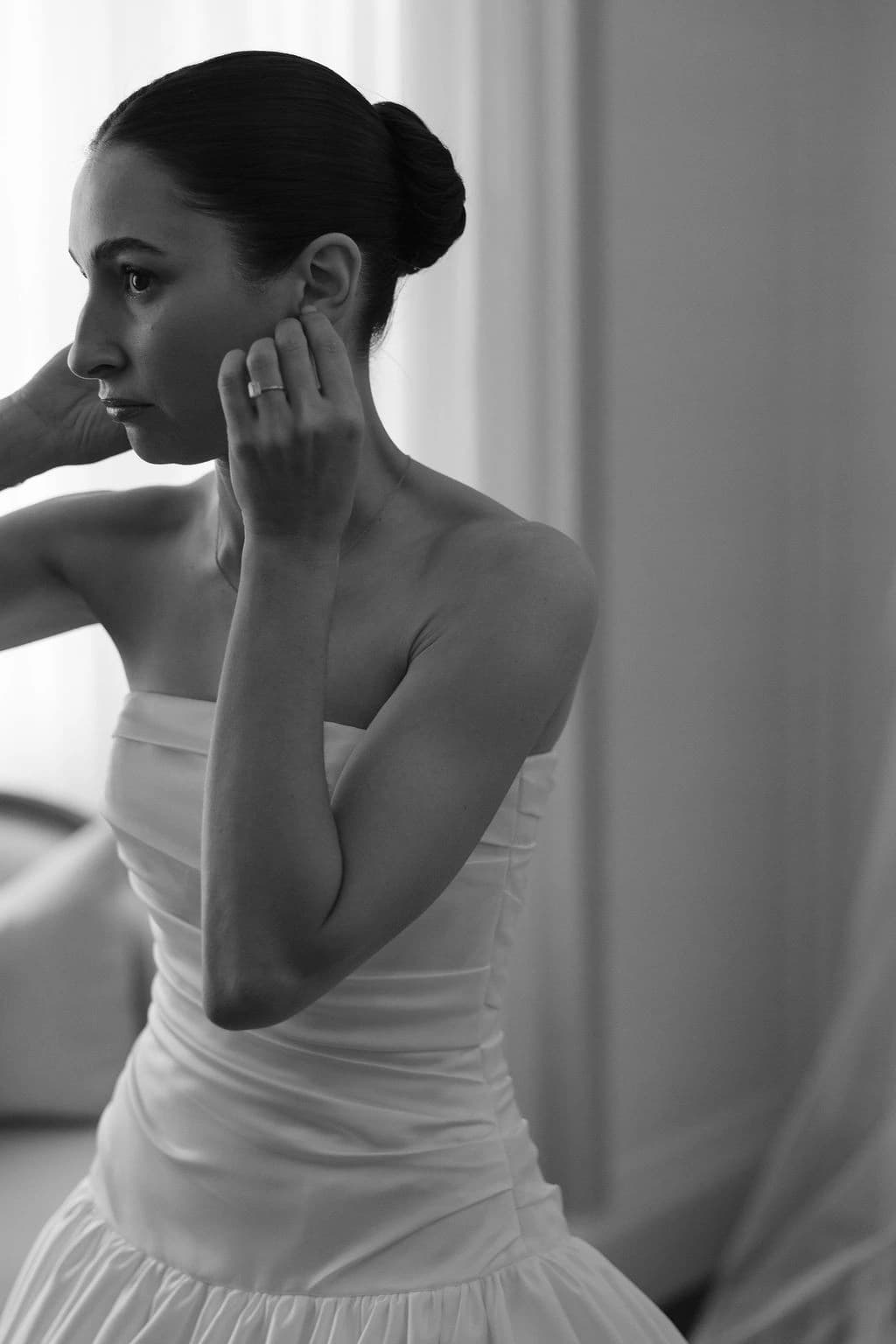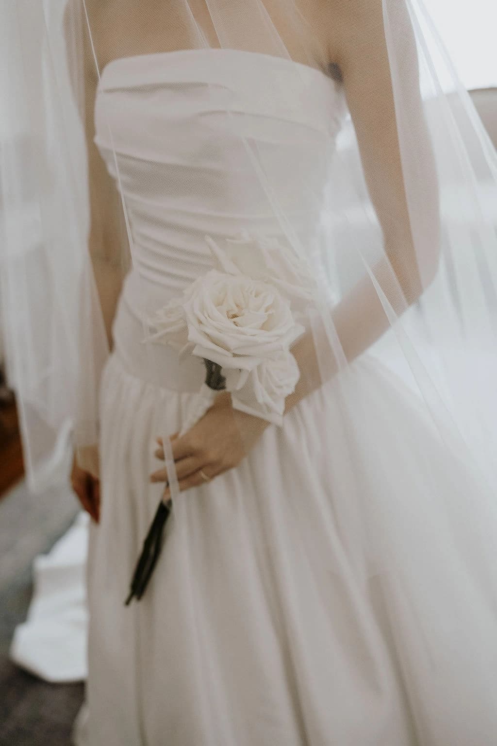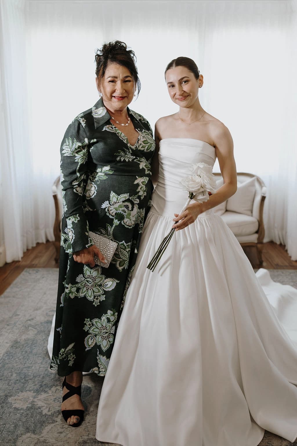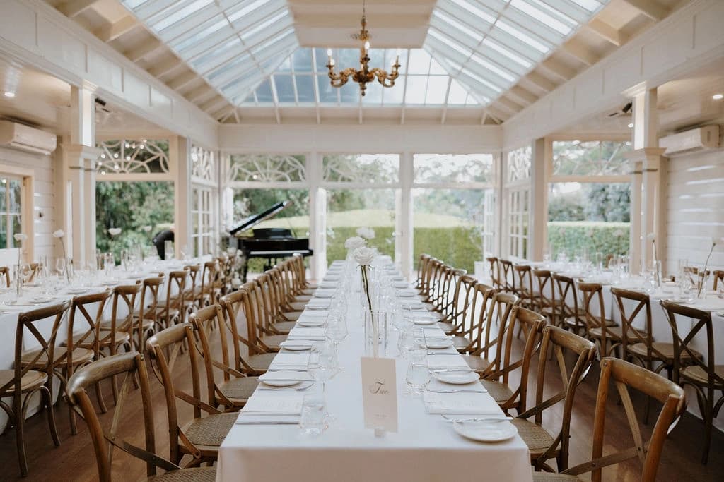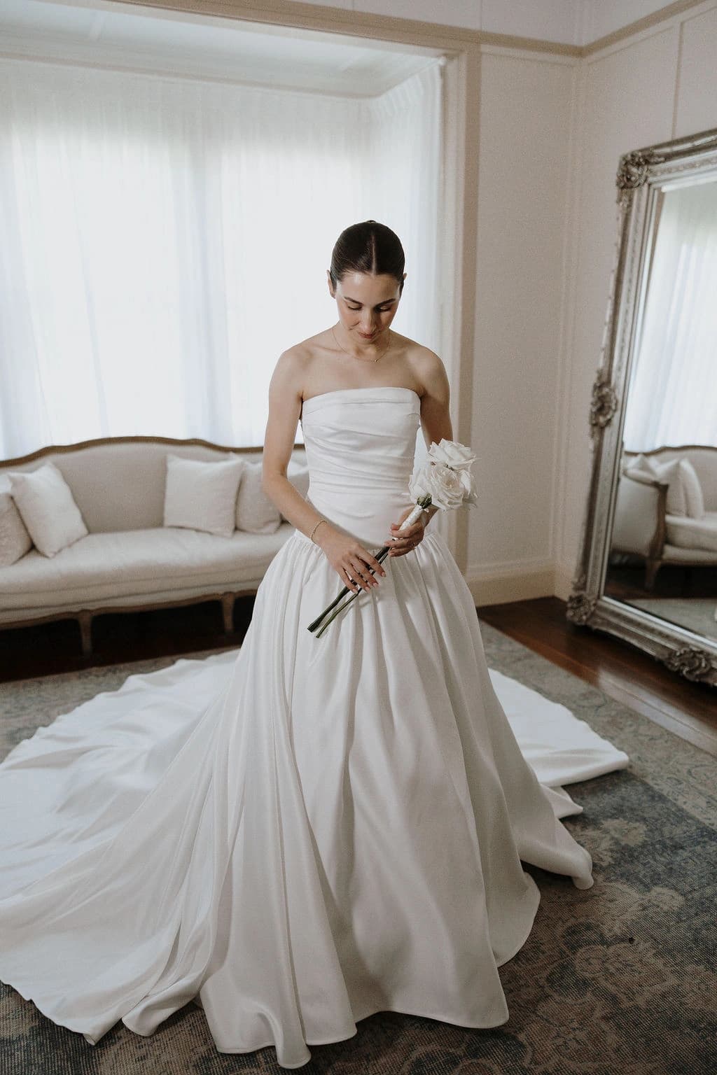 October light lingered gently across the Governor’s Lawn, soft and clear beneath the great fig trees. White roses and delphiniums framed the aisle, their petals shifting in the breeze while long ivory ribbons trailed from each chair, lifting softly as guests gathered. Her gown — a sculptural silk design with delicate ruching and a sweeping full skirt — moved with quiet grace, the fabric catching the light as she walked. He stood waiting in a black tuxedo and hand-tied bow, the scene poised in stillness. When vows were spoken, laughter and petals filled the air, a garden moment suspended in time. Later, the Conservatory was surrounded by blooms once more as candlelight gathered on the tables. She had changed into a sleek halter gown with long scarf ties that floated as they danced, the room warm with applause and the ease of celebration — a night that felt as graceful as it began.